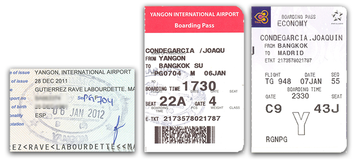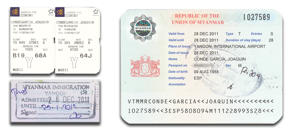 Viajamos a Birmania, llamada oficialmente Myanmar, en las navidades de 2011. Hicimos un circuito privado junto a nuestros amigos sevillanos Mariló y Baltasar, a quienes habíamos conocido en el viaje a Siria. Volamos el martes 27 a mediodía desde Madrid. Después de una corta escala en Bangkok, seguimos hasta Rangún, donde llegamos a media mañana del miércoles. Hicimos los trámites aduaneros y Zaw Zaw —nuestro guía-traductor— nos llevó al hotel, donde llegamos a la hora de comer.