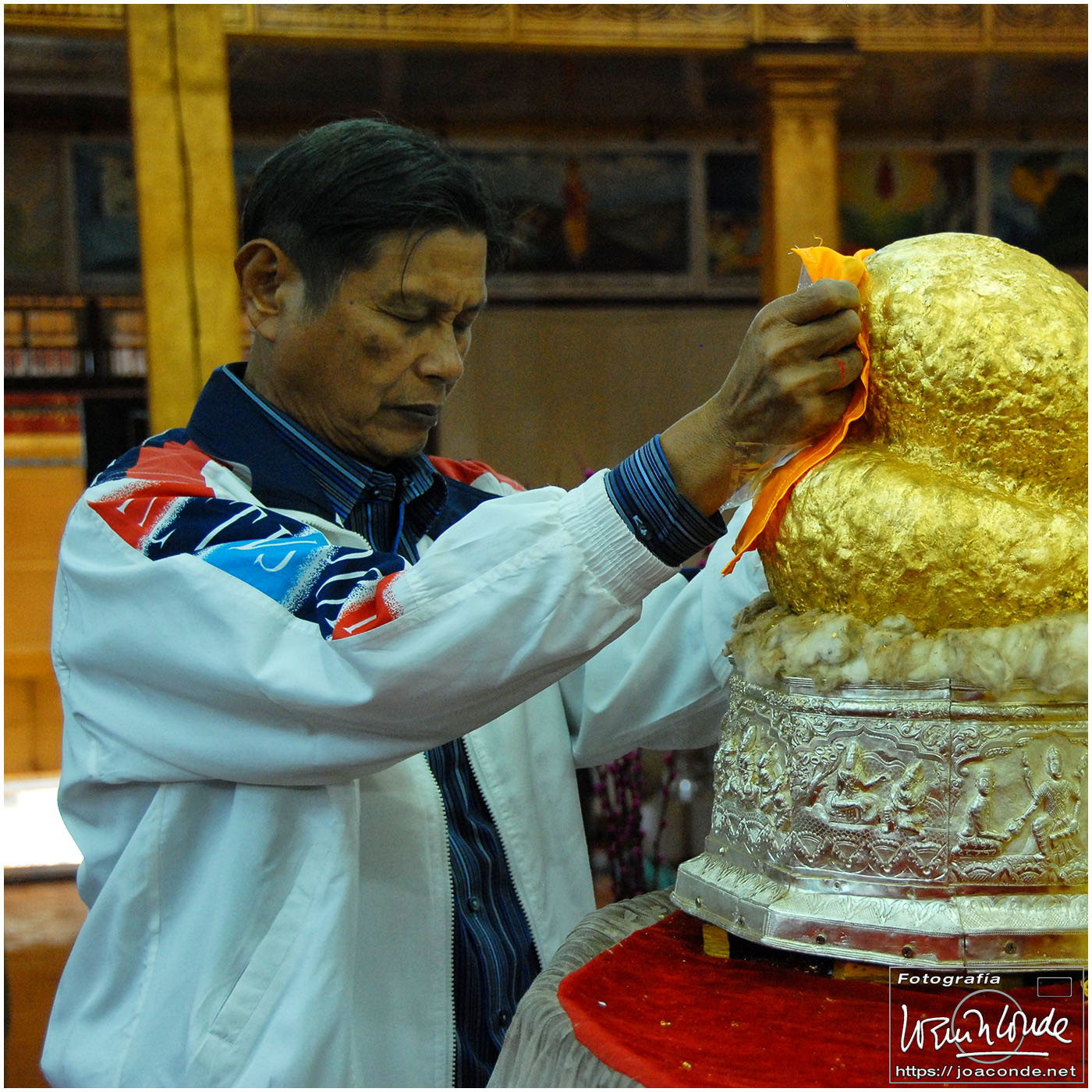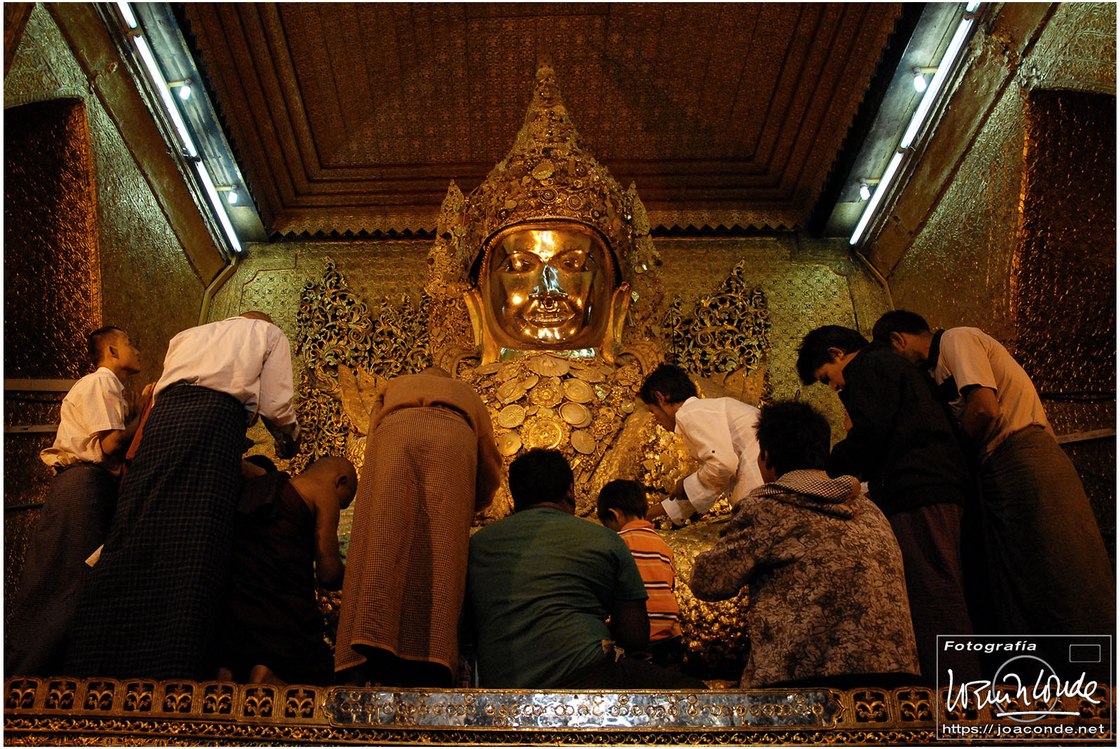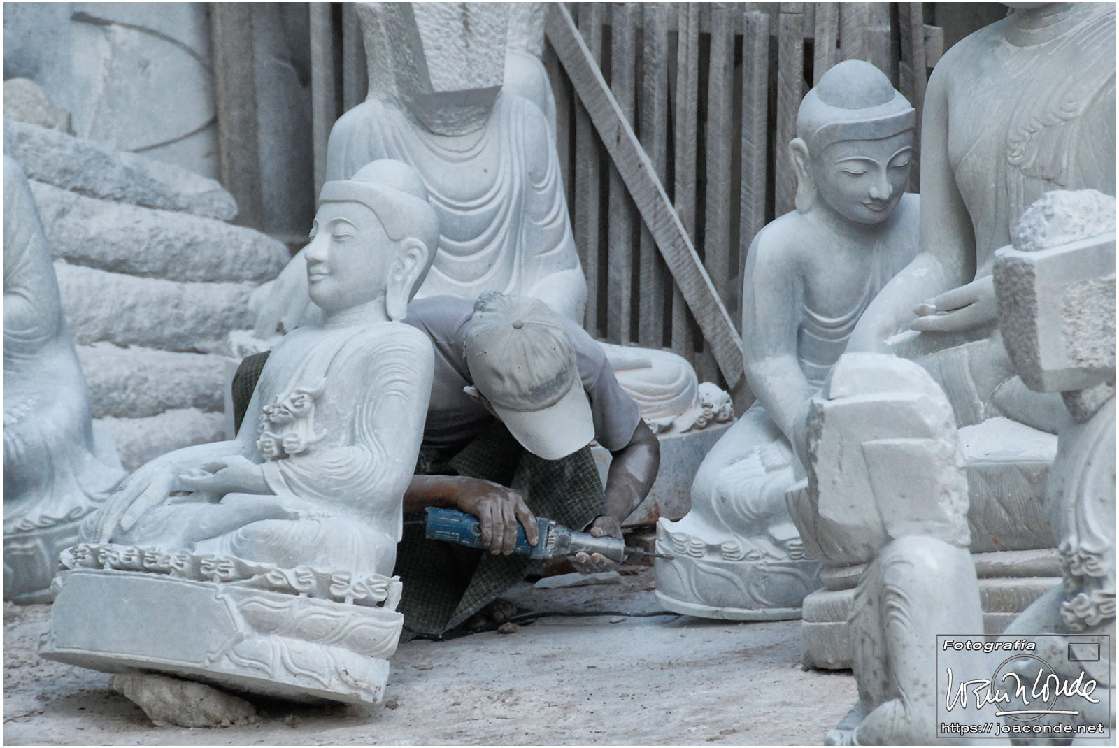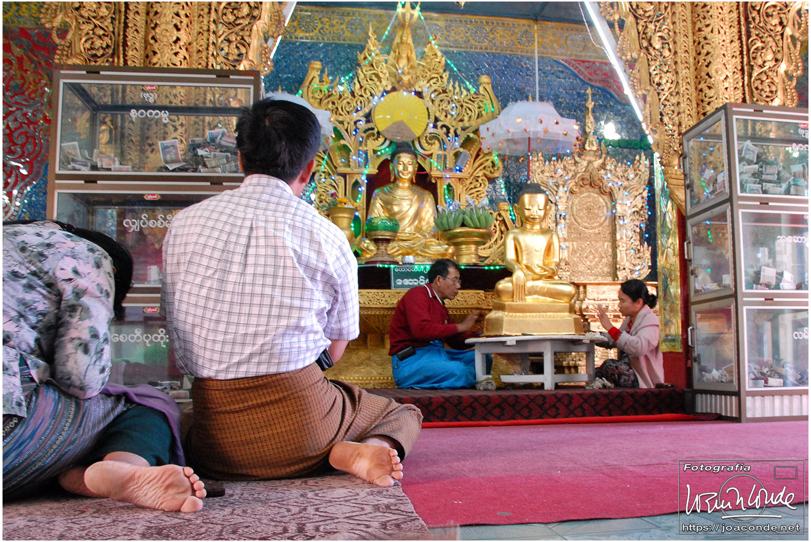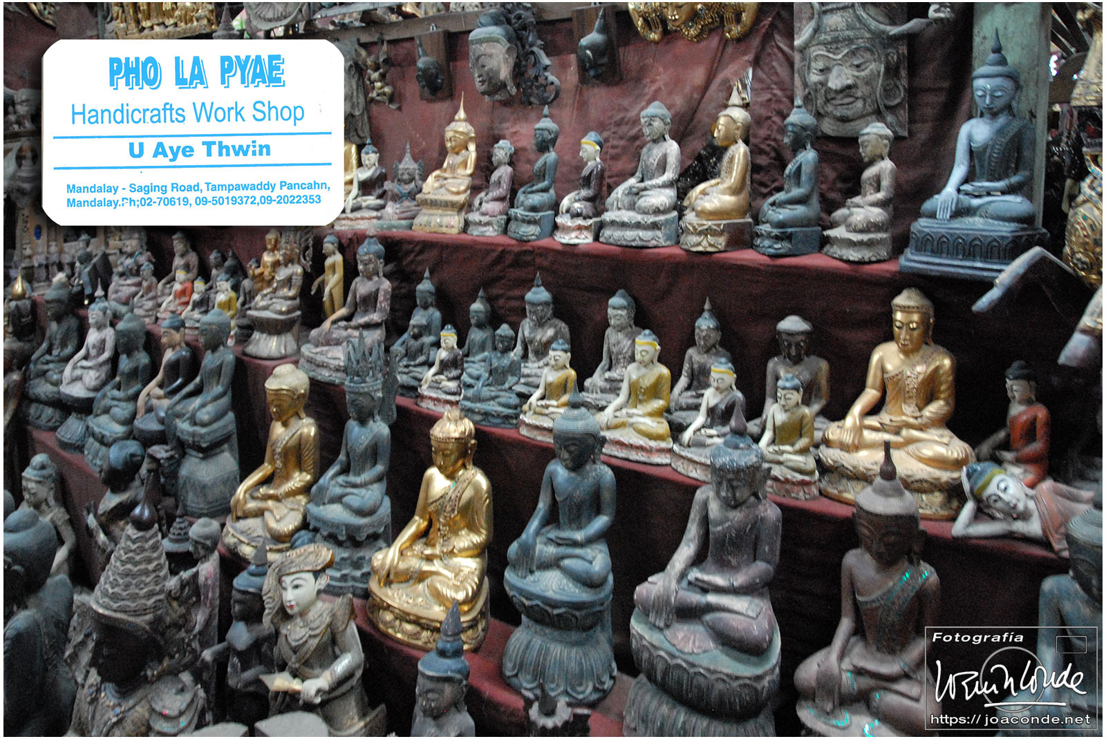 Por la tarde visitamos la Pagoda Mahamuni, que era la más sagrada para los budistas birmanos y por ello estaba siempre abarrotada. Después dimos una vuelta por el barrio de los marmolistas, en el que me puse manos a la obra. También entramos en un taller en el que se hacía y vendía el pan de oro —para colocarlo en las estatuas—. Por último, visitamos Shwenandaw Kyaung un antiguo palacio convertido en monasterio y la Kuthodaw Paya, con un Tripitaka o código budista en 729 losas de mármol, colocada cada una de ellas dentro de una estupa.