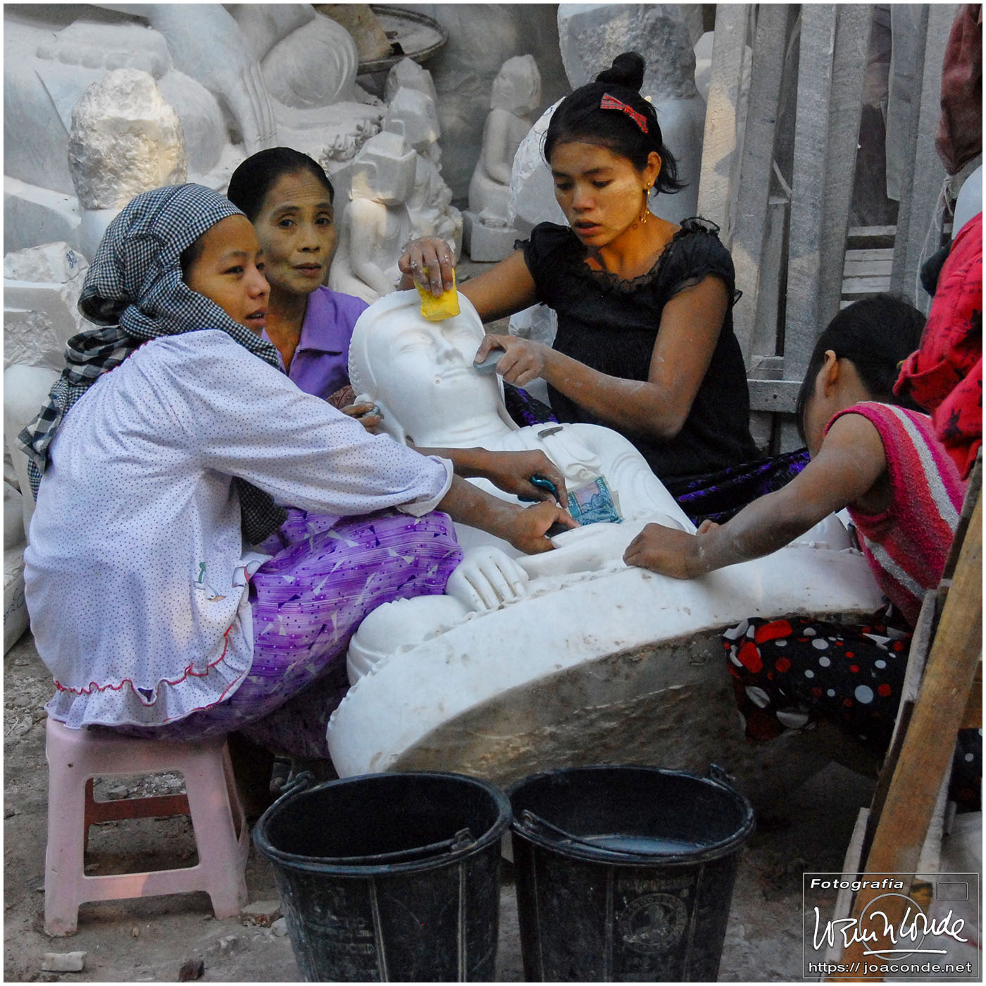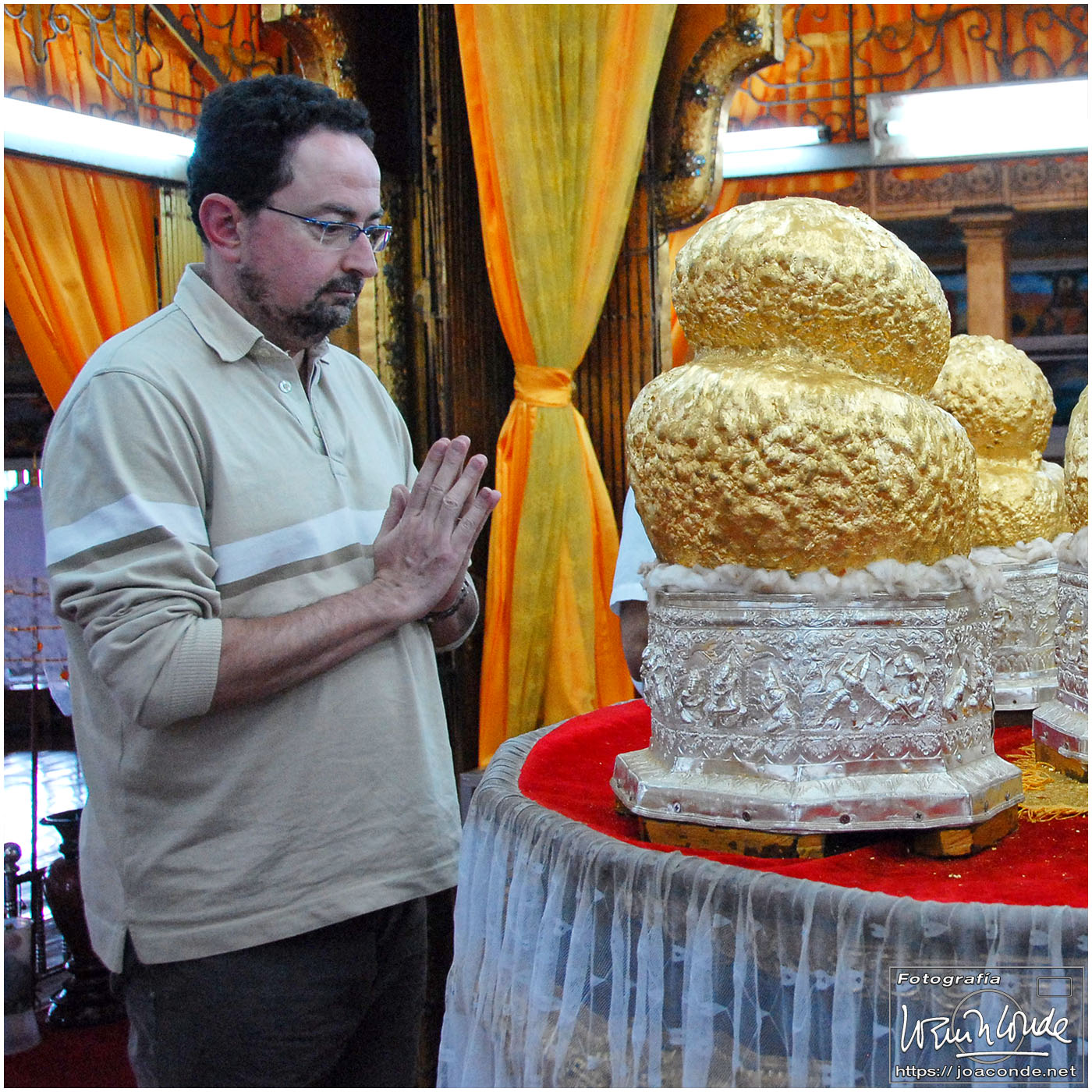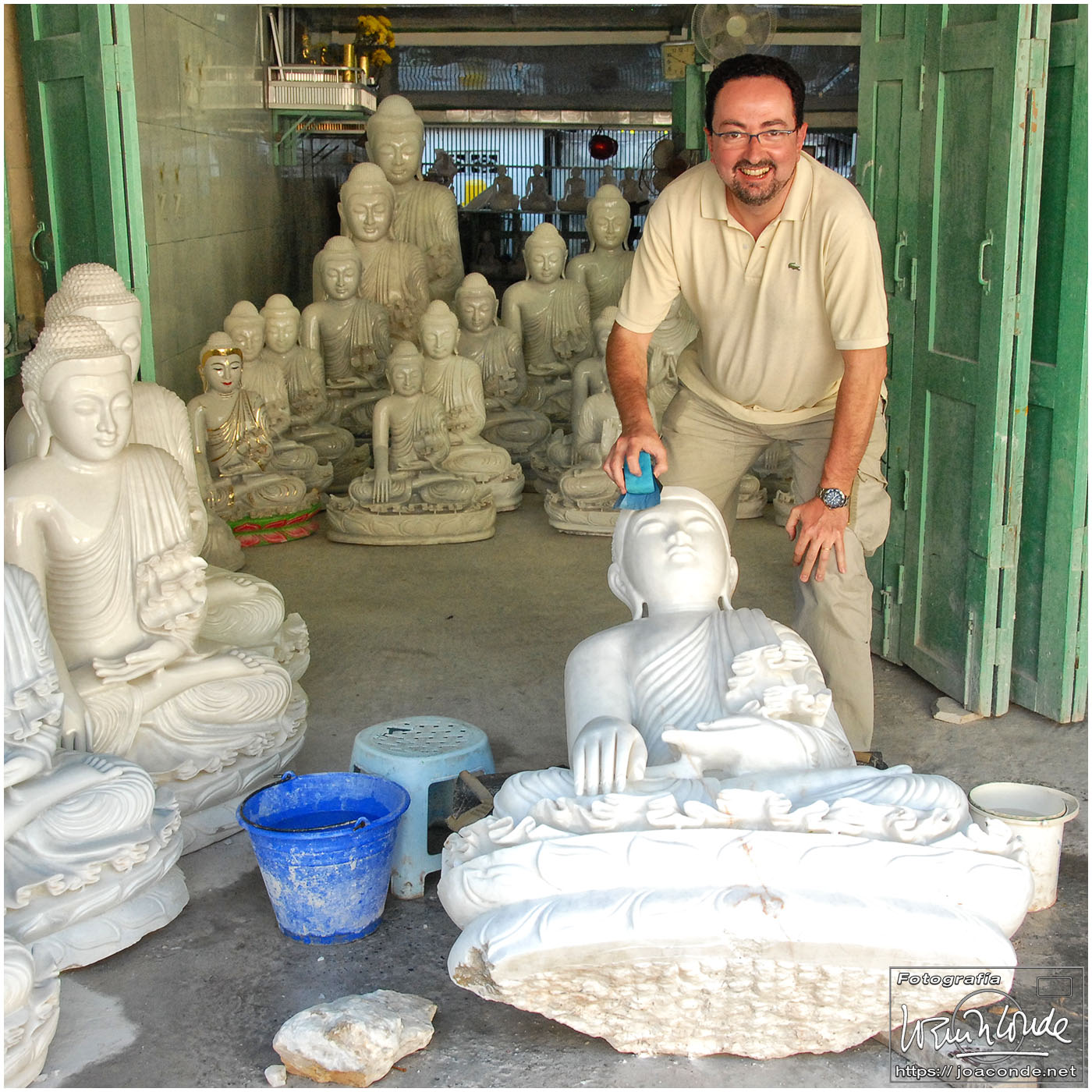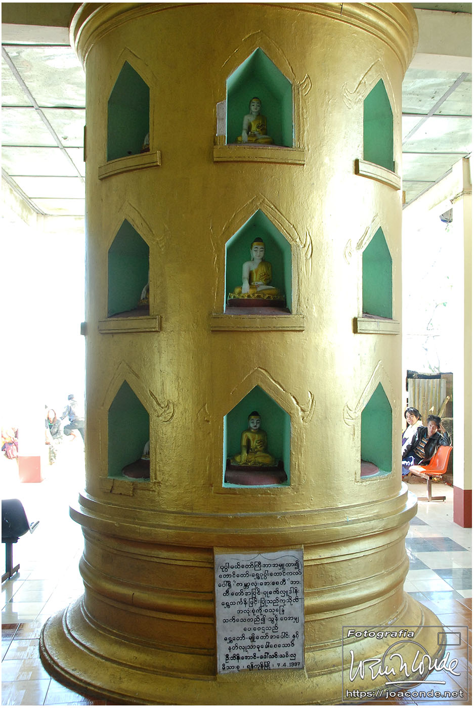 Por la tarde visitamos la Pagoda Mahamuni, que era la más sagrada para los budistas birmanos y por ello estaba siempre abarrotada. Después dimos una vuelta por el barrio de los marmolistas, en el que me puse manos a la obra. También entramos en un taller en el que se hacía y vendía el pan de oro —para colocarlo en las estatuas—. Por último, visitamos Shwenandaw Kyaung un antiguo palacio convertido en monasterio y la Kuthodaw Paya, con un Tripitaka o código budista en 729 losas de mármol, colocada cada una de ellas dentro de una estupa.