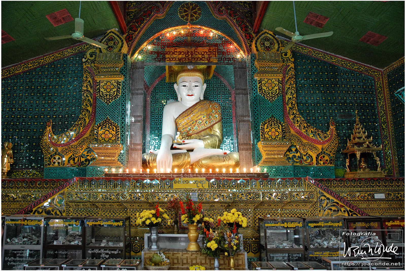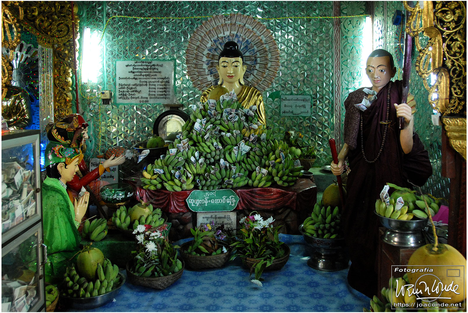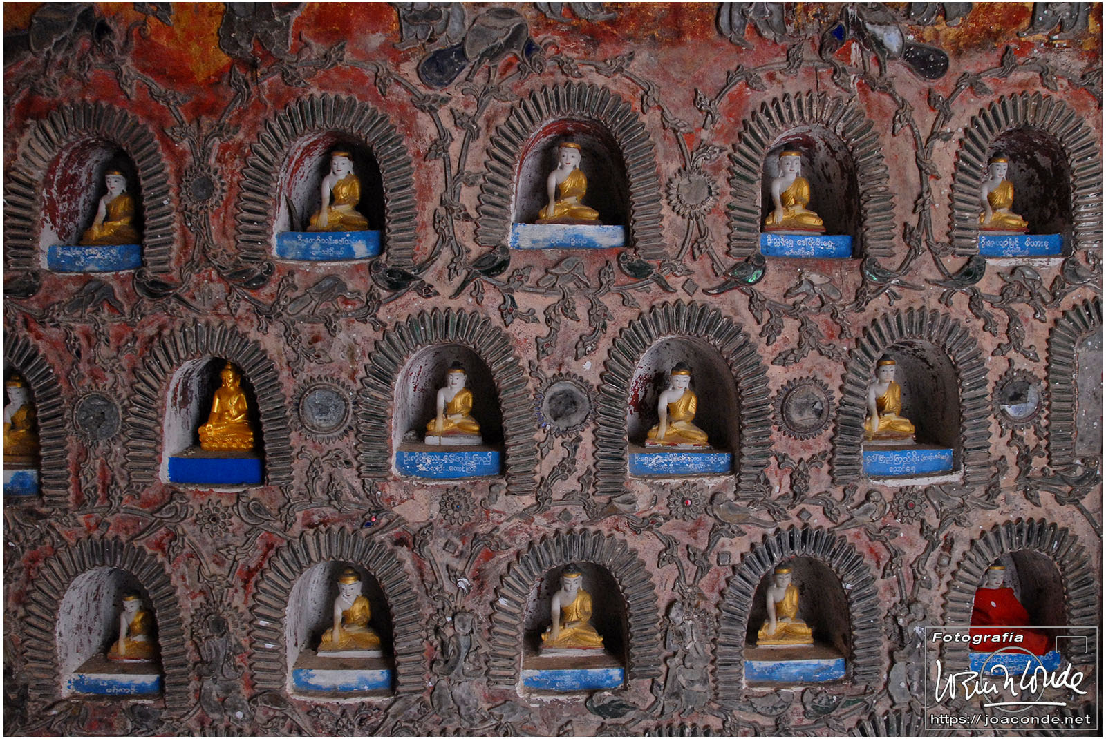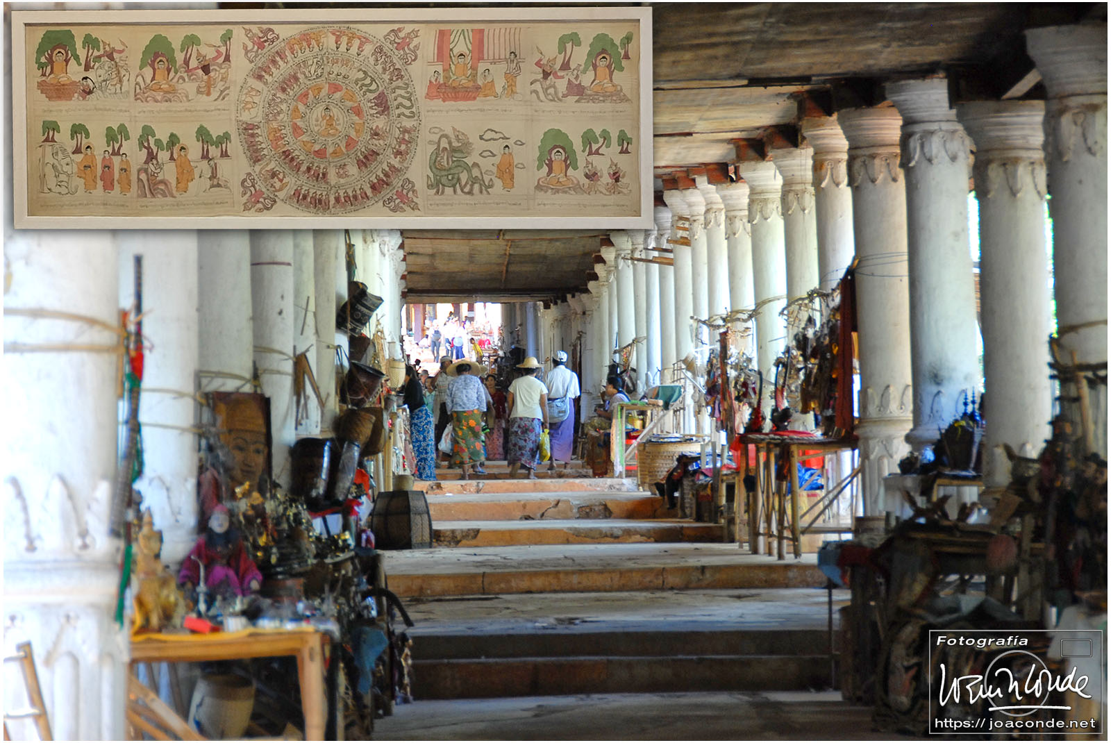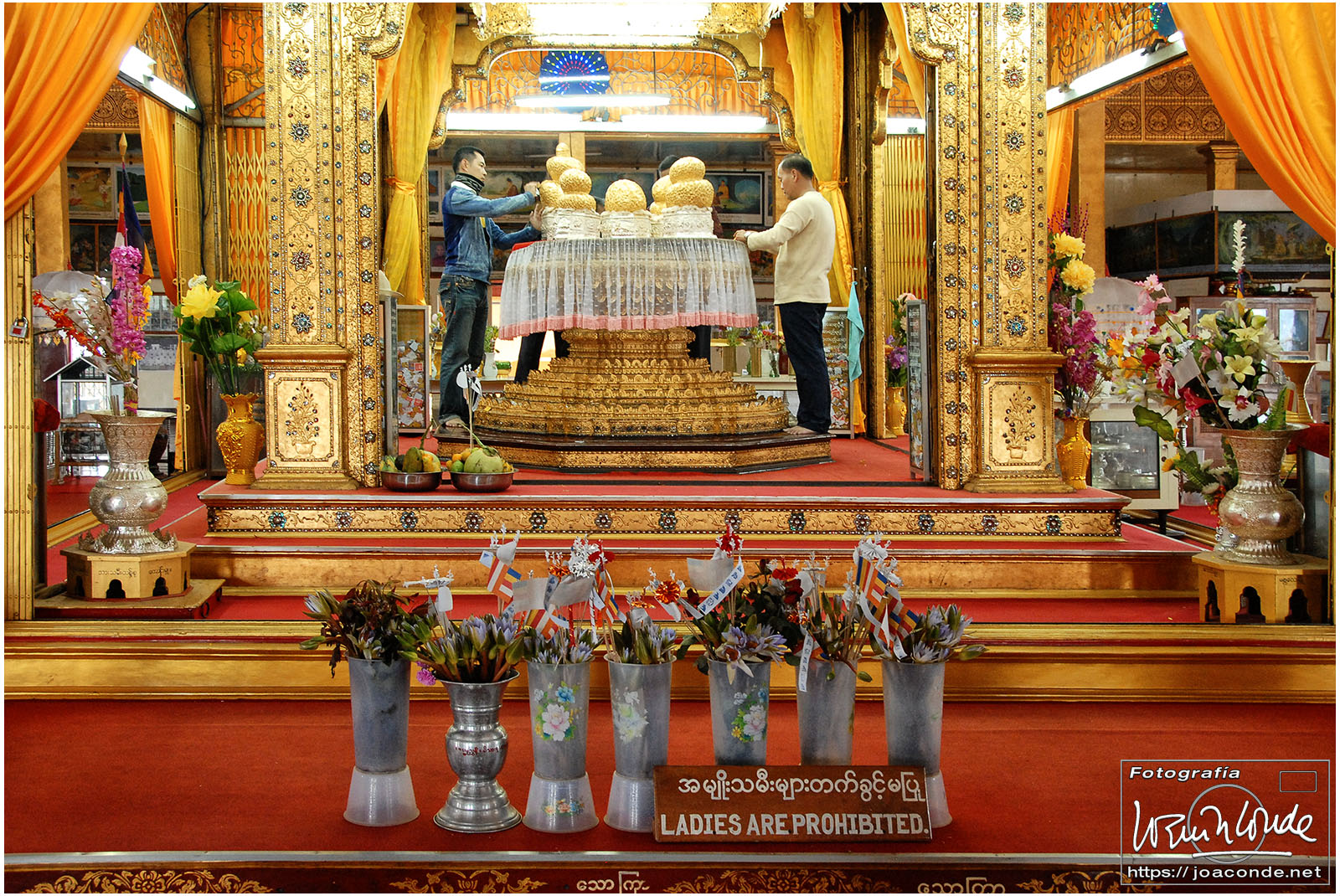 Por la tarde visitamos la Pagoda Mahamuni, que era la más sagrada para los budistas birmanos y por ello estaba siempre abarrotada. Después dimos una vuelta por el barrio de los marmolistas, en el que me puse manos a la obra. También entramos en un taller en el que se hacía y vendía el pan de oro —para colocarlo en las estatuas—. Por último, visitamos Shwenandaw Kyaung un antiguo palacio convertido en monasterio y la Kuthodaw Paya, con un Tripitaka o código budista en 729 losas de mármol, colocada cada una de ellas dentro de una estupa.