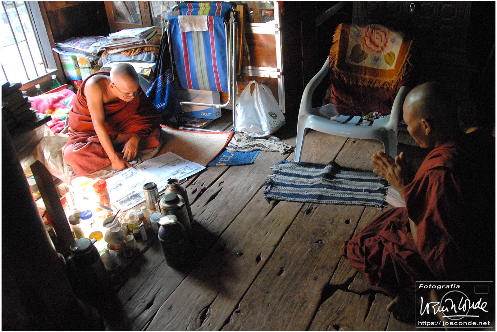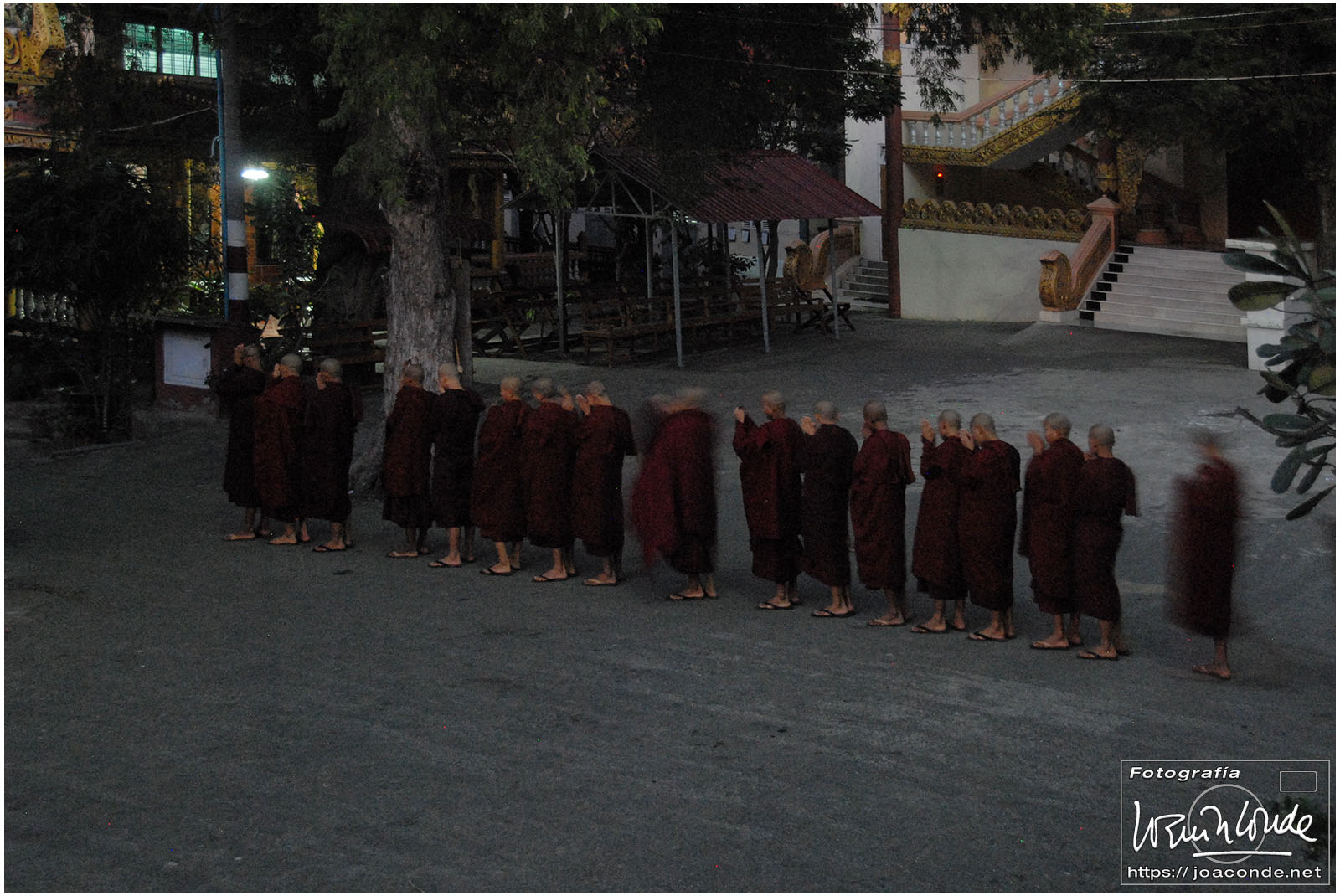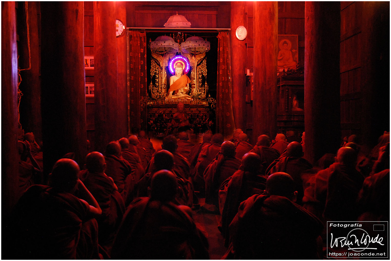 De vuelta al hotel, Zaw Zaw nos llevó a un monasterio al que no iban turistas. Al anochecer, unos cincuenta monjes empezaron a salir de todos los rincones e iniciaron una procesión. Sus cantos monótonos, la precisión con que se descalzaron y avanzaron hacia la sala de oración fue un espectáculo sobrecogedor. Solo rompía la armonía el titilar de las bombillitas del Buda que me hipnotizaron.