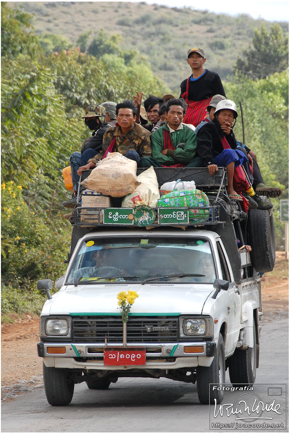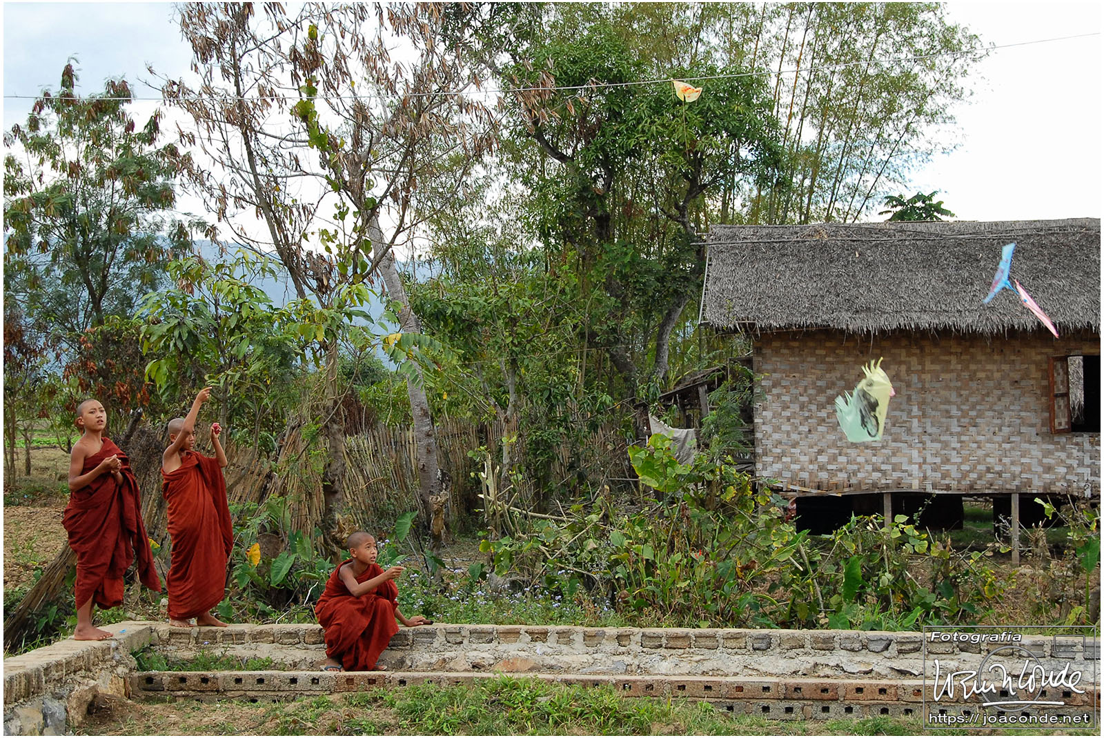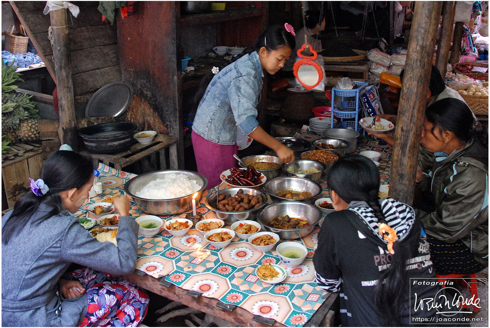 Descansados y con ambiente fresco, después de desayunar, salimos rumbo al lago Inle. La primera parada fue en el mercado de Kalaw, muy animado y pintoresco. Después vimos camionetas atestadas, talleres mecánicos, peculiares gasolineras y paramos en la construcción comunitaria de una vivienda tradicional. Cerca ya del lago, visitamos el monasterio Shwe Yan Pyay; los monjes novicios descansaban o jugaban con las cometas bajo un cielo que amenazaba tormenta. Nada más llegar al lago, en el momento de embarcar para el hotel, nos cayó un enorme chaparrón, que hizo que tuviéramos que cambiarnos de arriba abajo antes de comer.