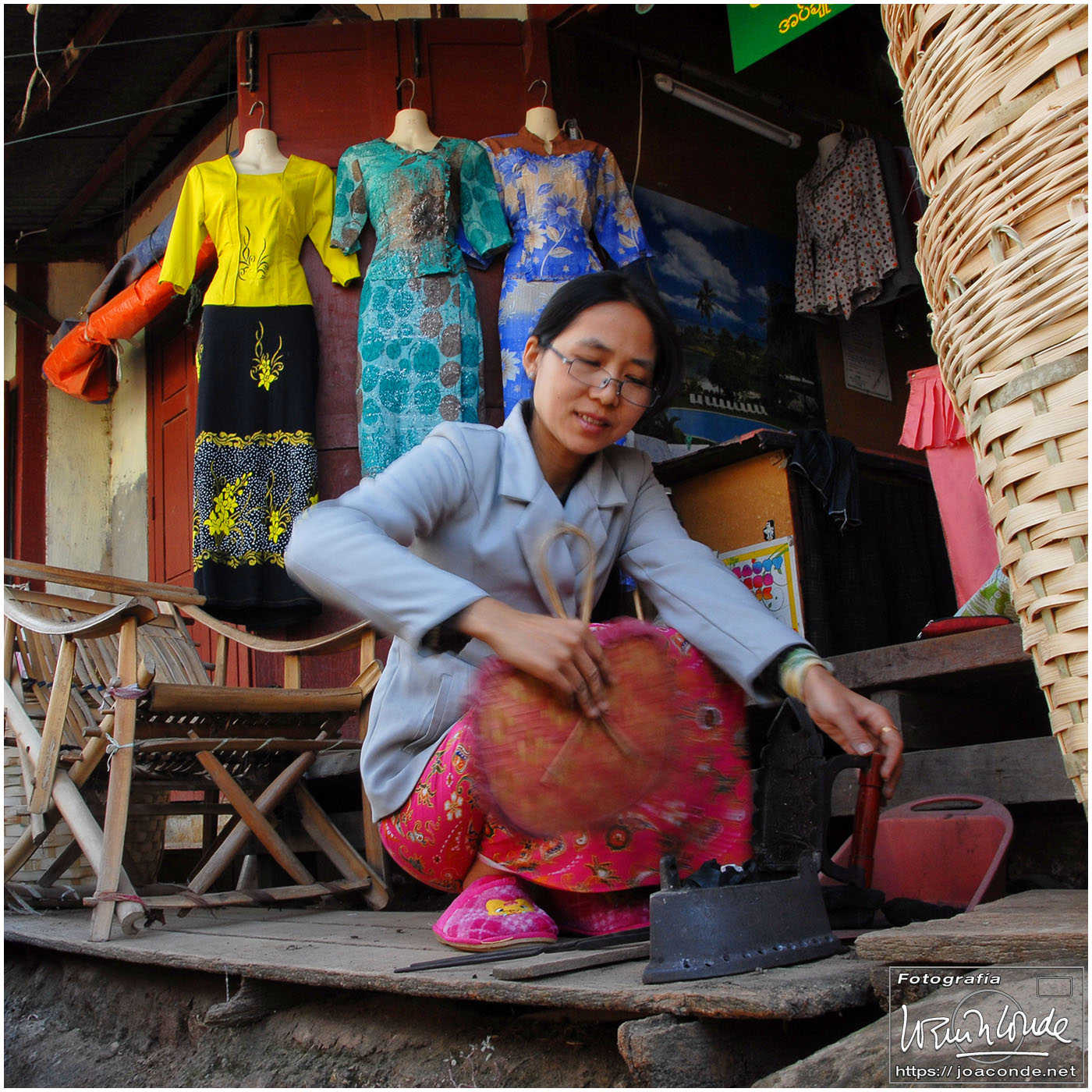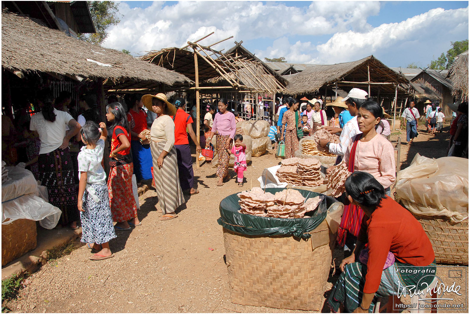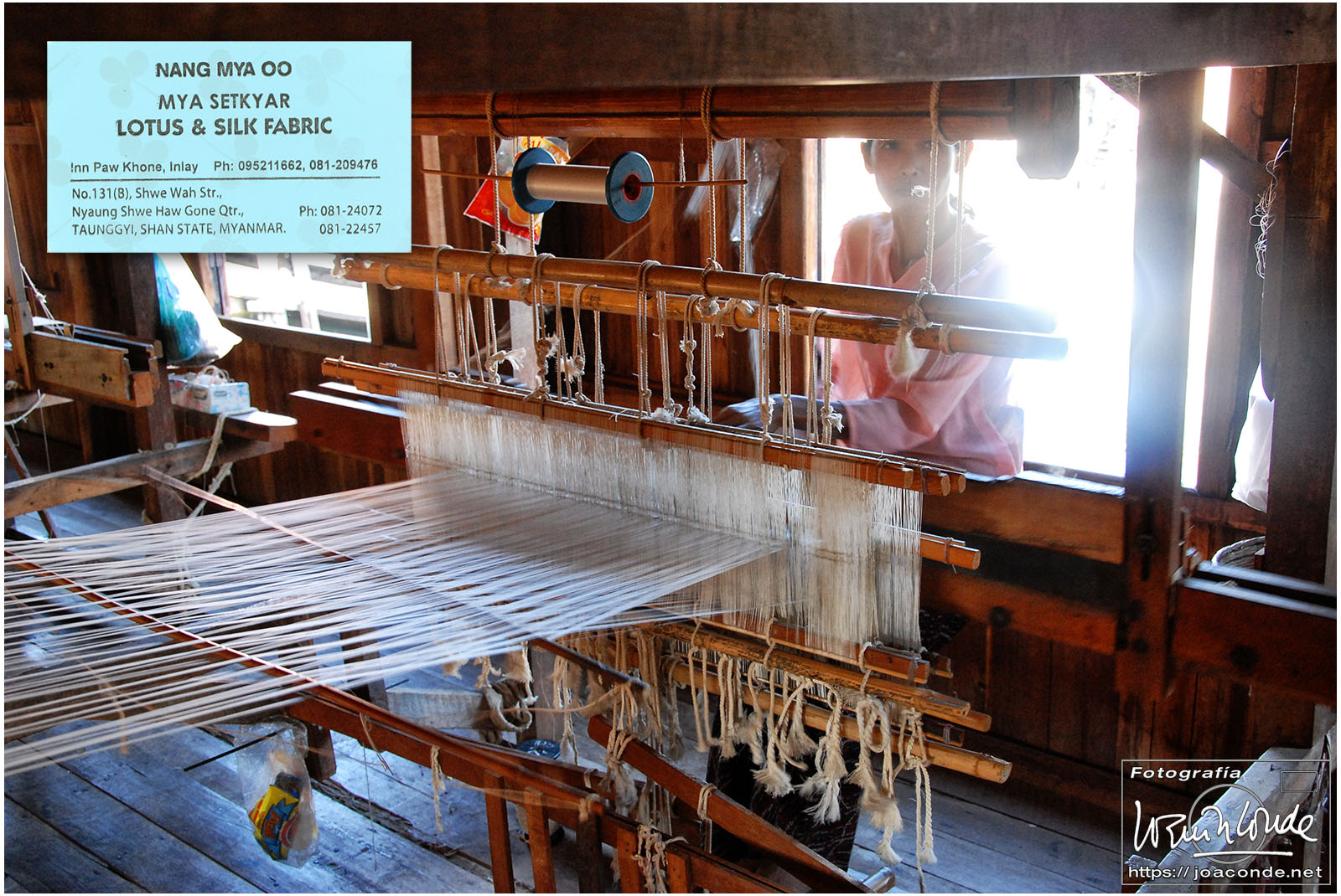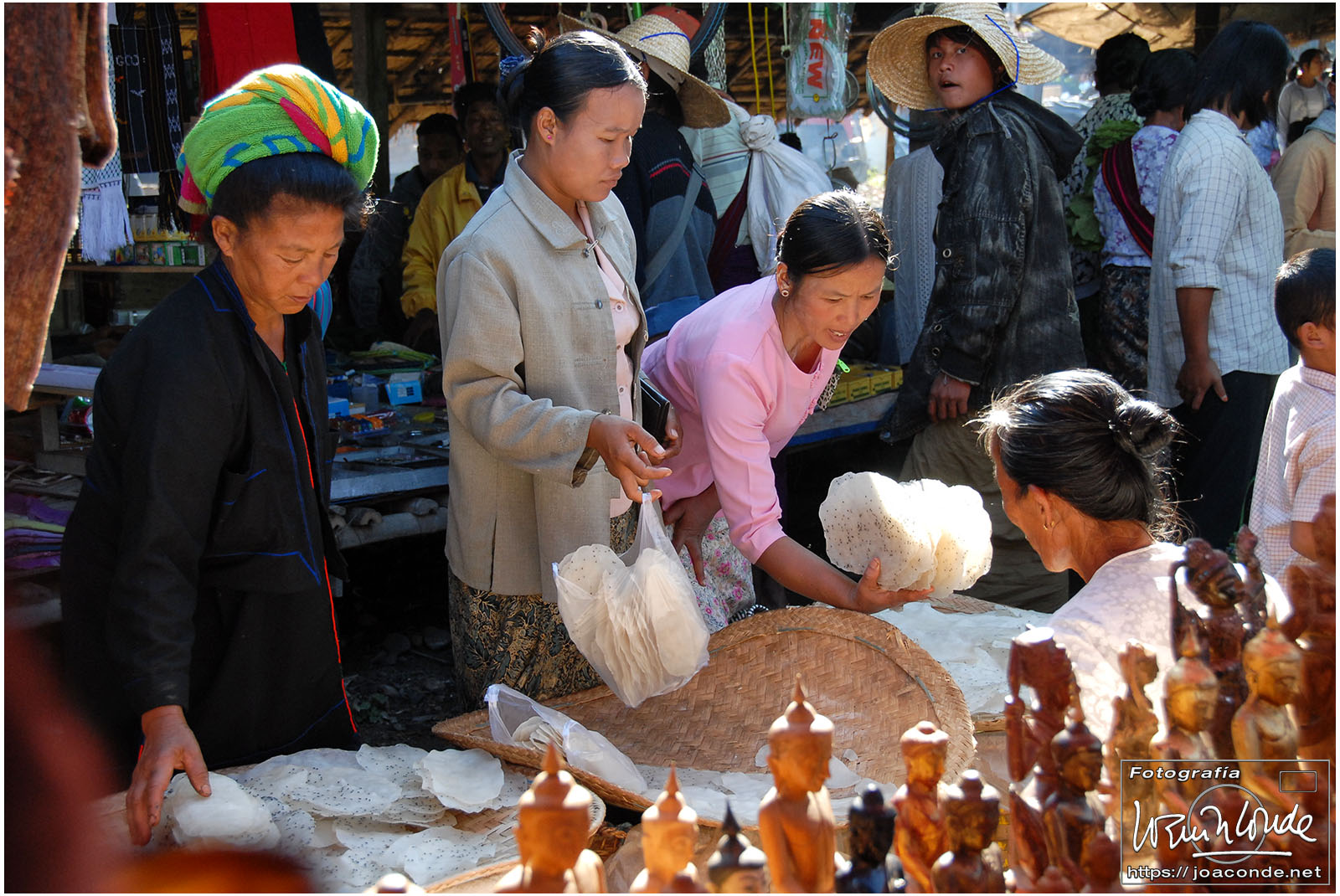 Amaneció un día precioso; era la fiesta nacional. Después del desayuno volvimos a navegar, esta vez hacia la orilla este del lago. Vimos a los pescadores con sus nasas y su particular forma de remar. Cruzamos un mercado, animadísimo, y fuimos a otra tienda —muy especial— de artesanía. Este era el territorio de las padaung o mujeres jirafa de la etnia karen. Sus pesados collares de latón les hundían desde niñas clavículas y costillas, para parecer más atractivas. Los militares quisieron erradicar esta costumbre y muchas huyeron a la cercana Tailandia para exhibirse a los turistas. Aquí se dedicaban sin complejos a la artesanía.