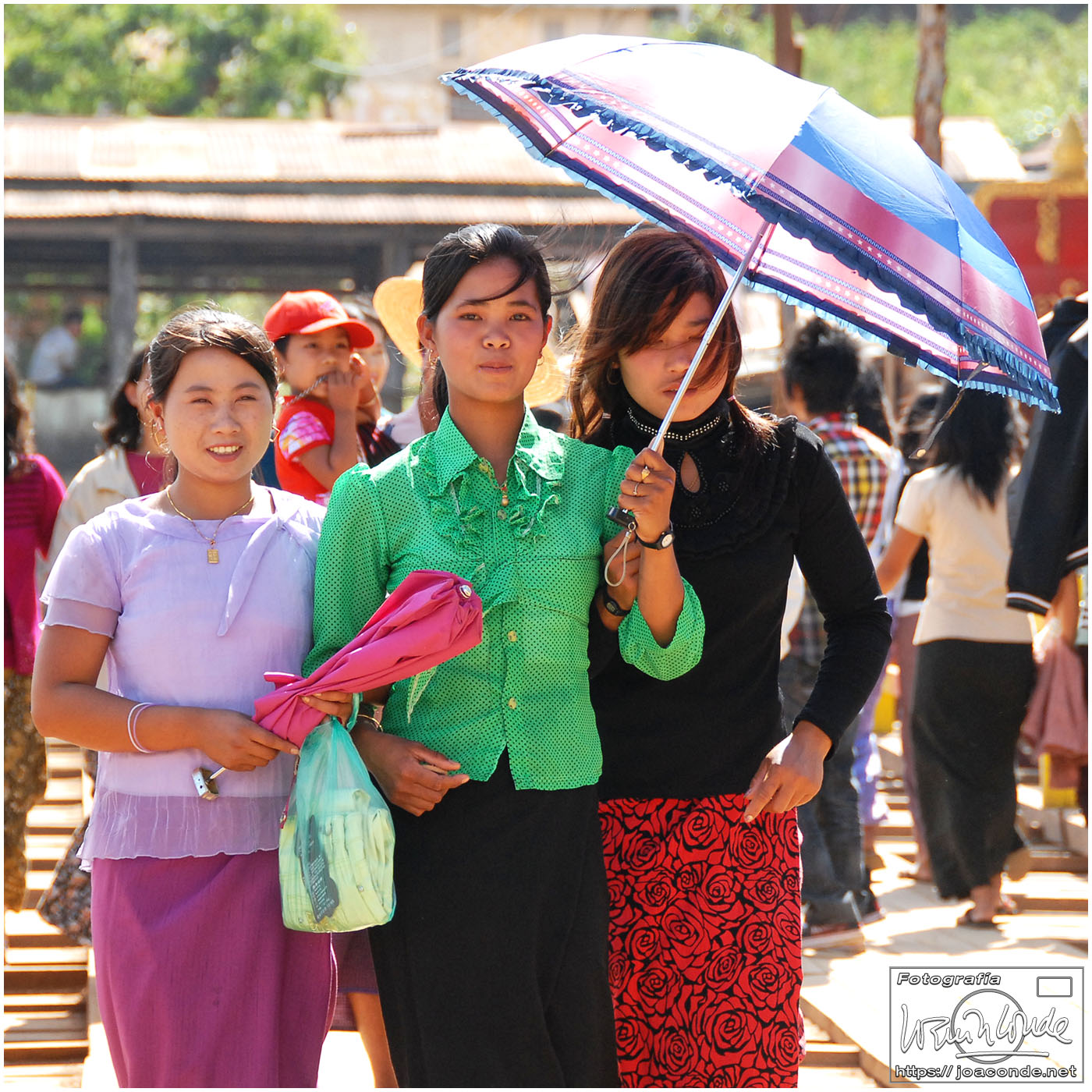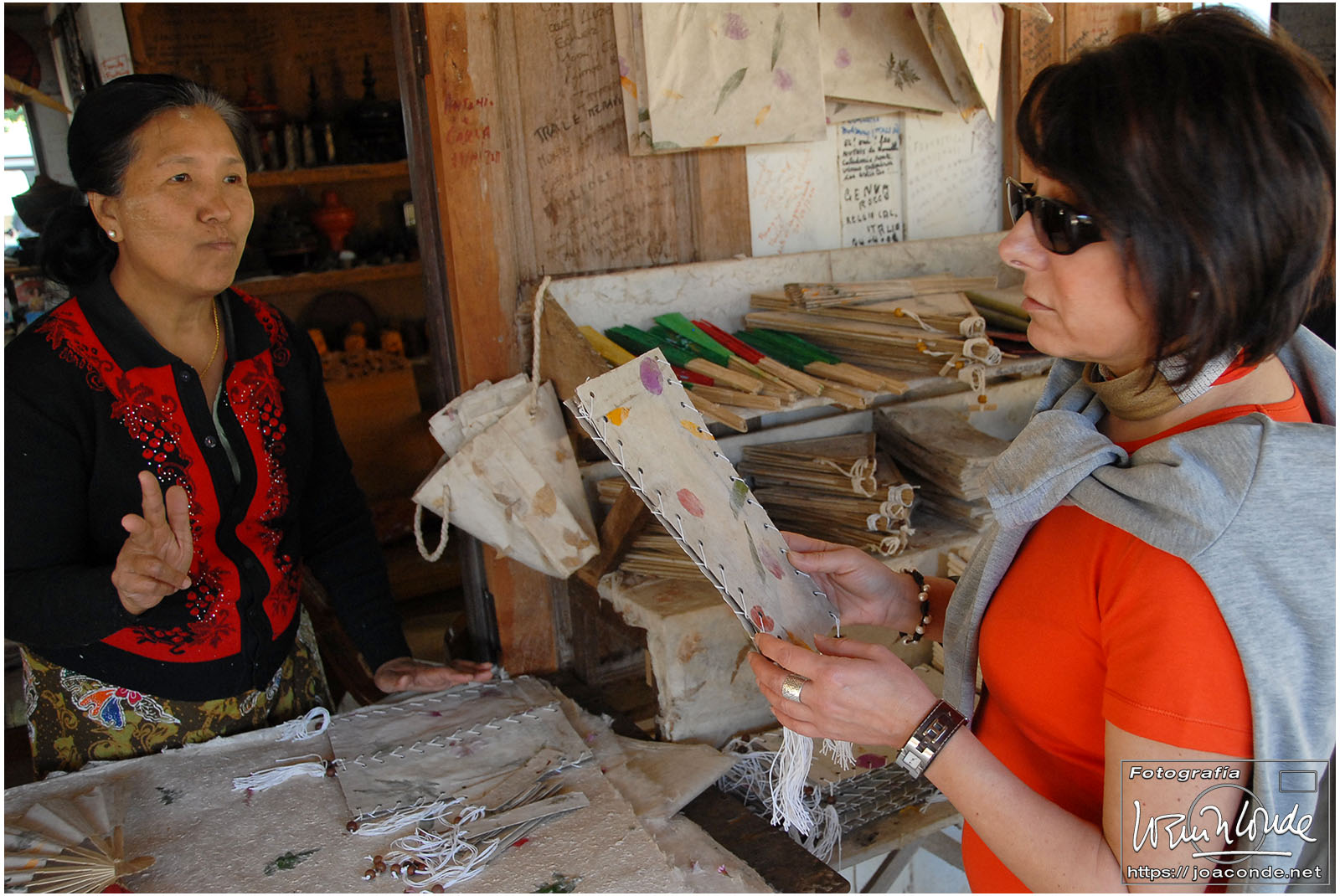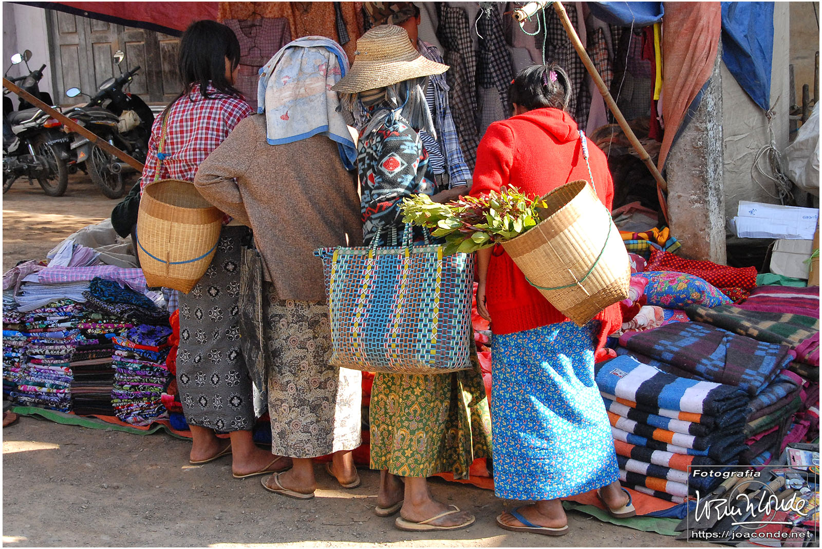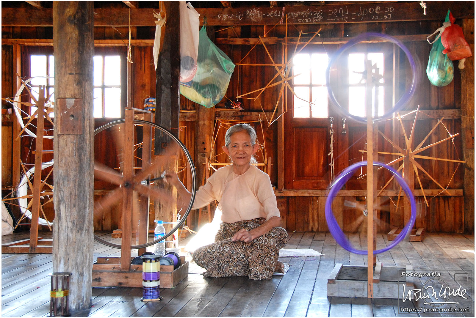 Amaneció un día precioso; era la fiesta nacional. Después del desayuno volvimos a navegar, esta vez hacia la orilla este del lago. Vimos a los pescadores con sus nasas y su particular forma de remar. Cruzamos un mercado, animadísimo, y fuimos a otra tienda —muy especial— de artesanía. Este era el territorio de las padaung o mujeres jirafa de la etnia karen. Sus pesados collares de latón les hundían desde niñas clavículas y costillas, para parecer más atractivas. Los militares quisieron erradicar esta costumbre y muchas huyeron a la cercana Tailandia para exhibirse a los turistas. Aquí se dedicaban sin complejos a la artesanía.