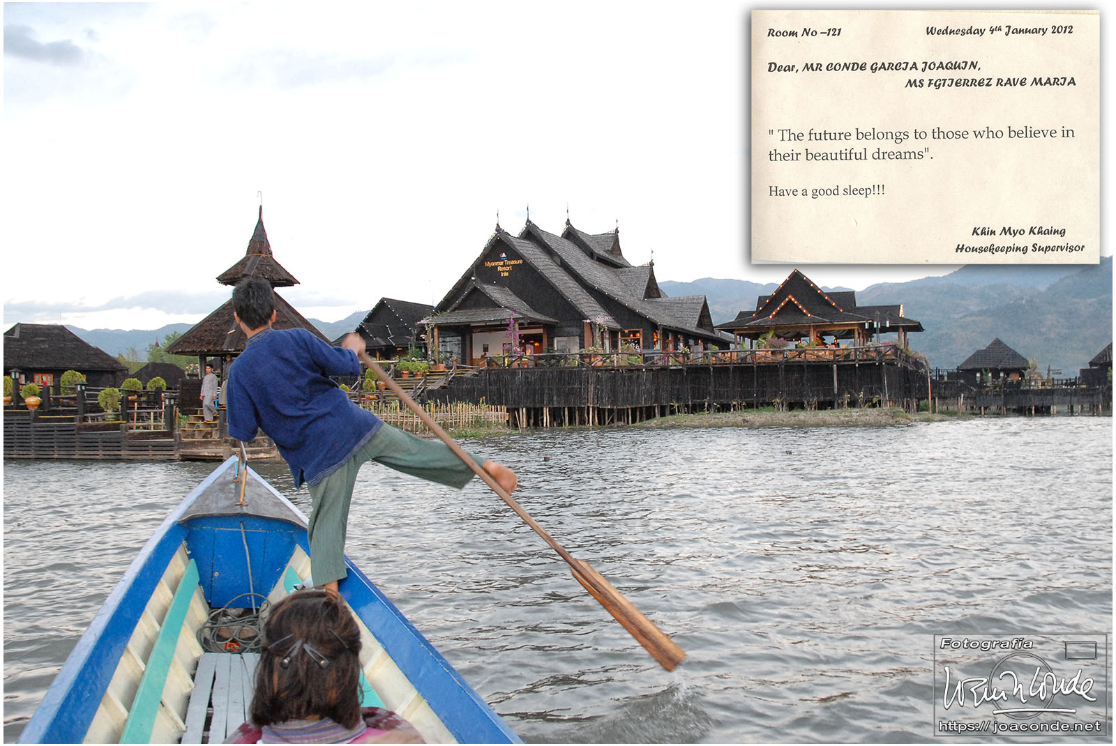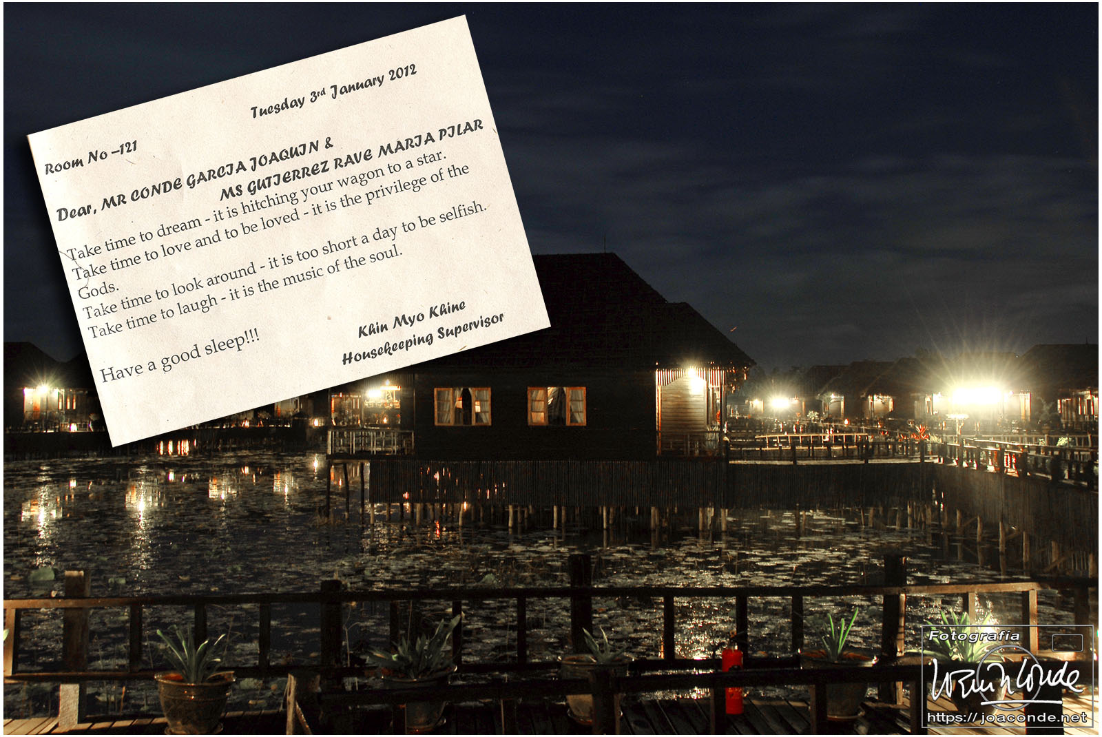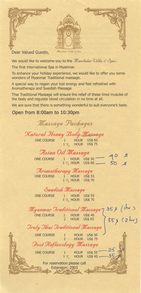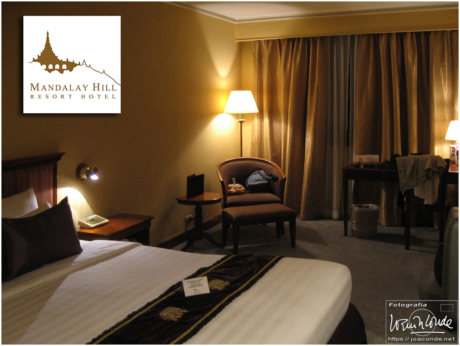 Después de comer, compramos un buda tallado y regresamos al hotel, el Mandalay Hill. A la caída de la tarde subimos a la colina, para ver la última puesta de sol del año. Aquella noche en el hotel hubo cena especial y una gran fiesta; después tomamos las uvas enlatadas y nos recogimos. En España eran seis horas y media menos.