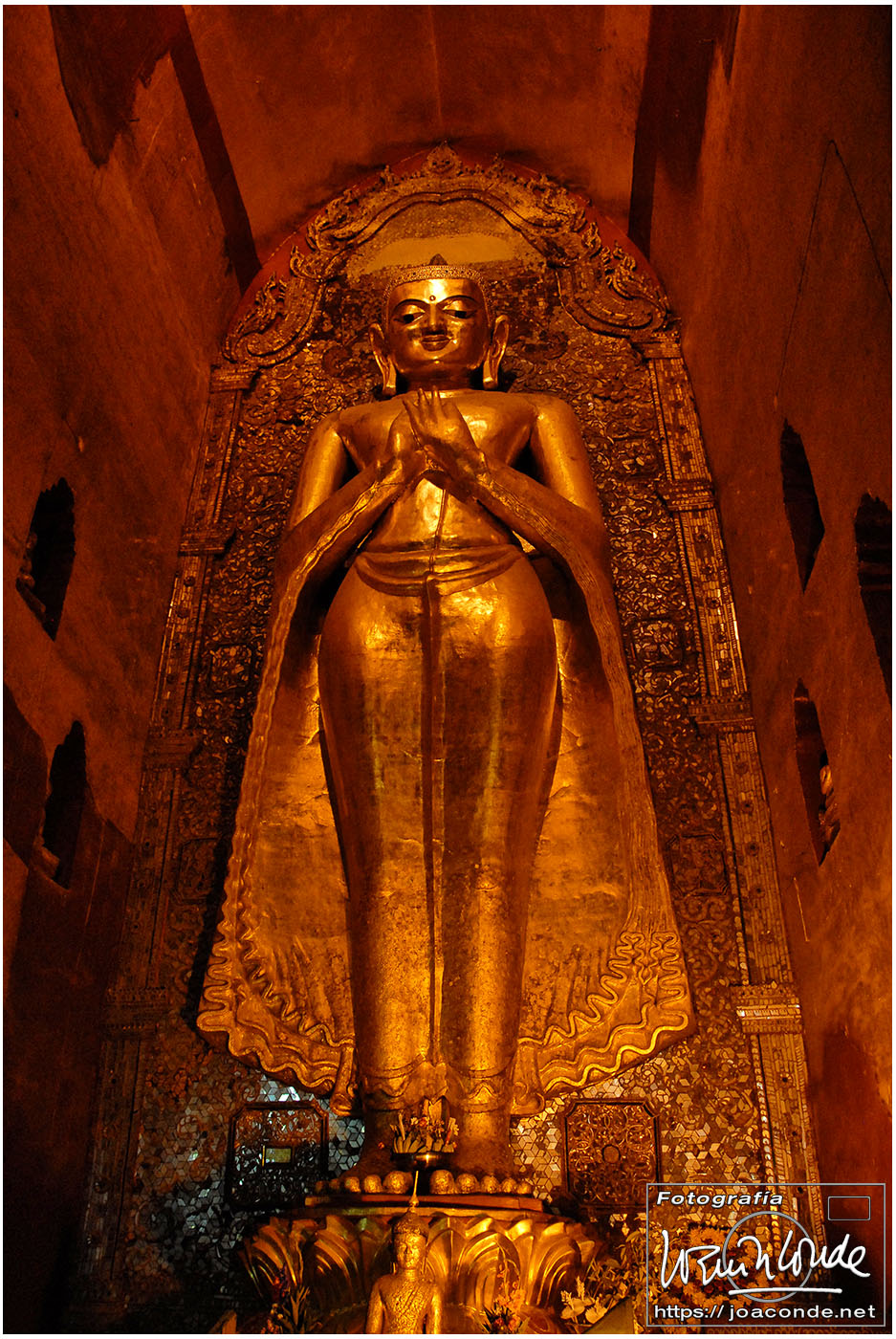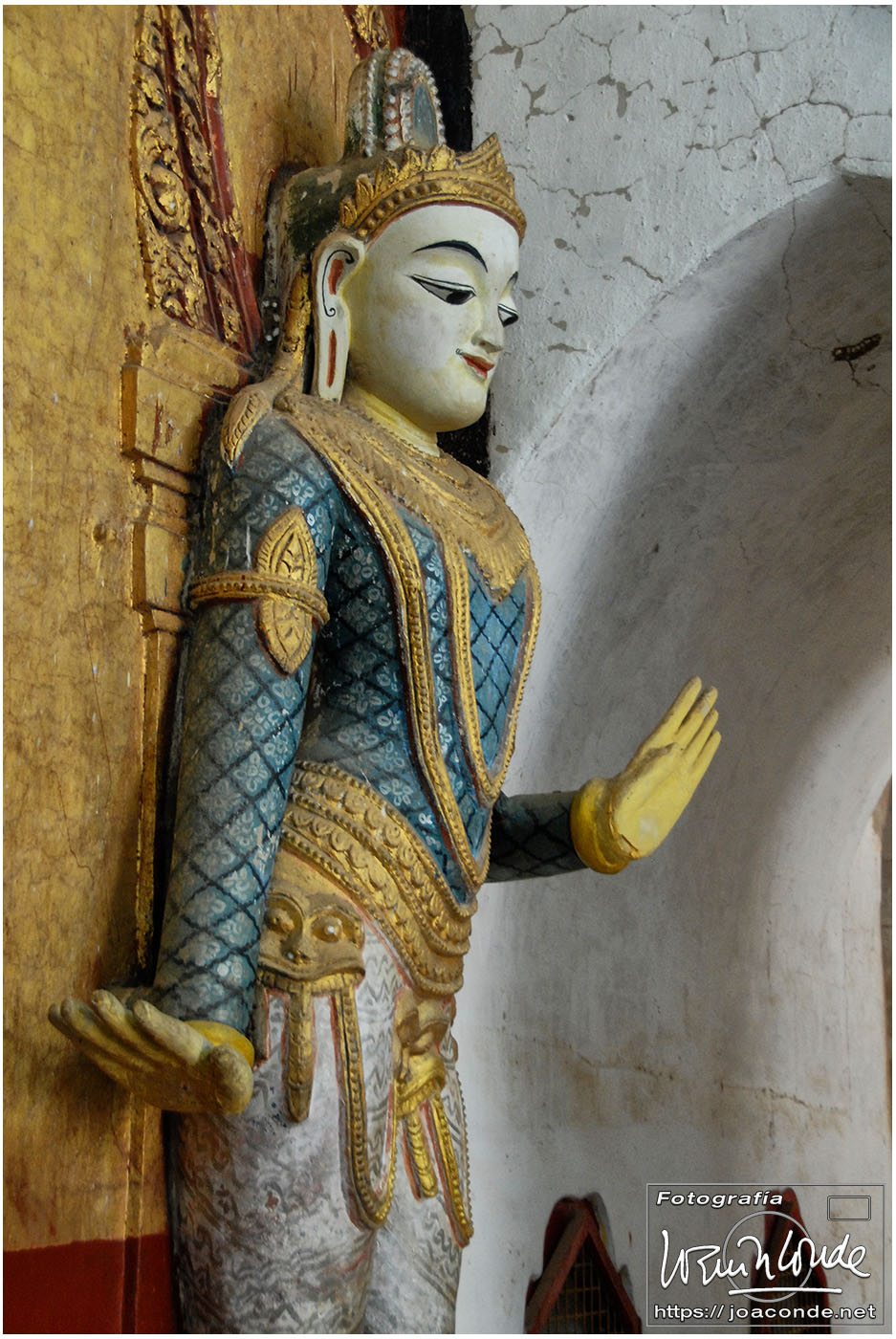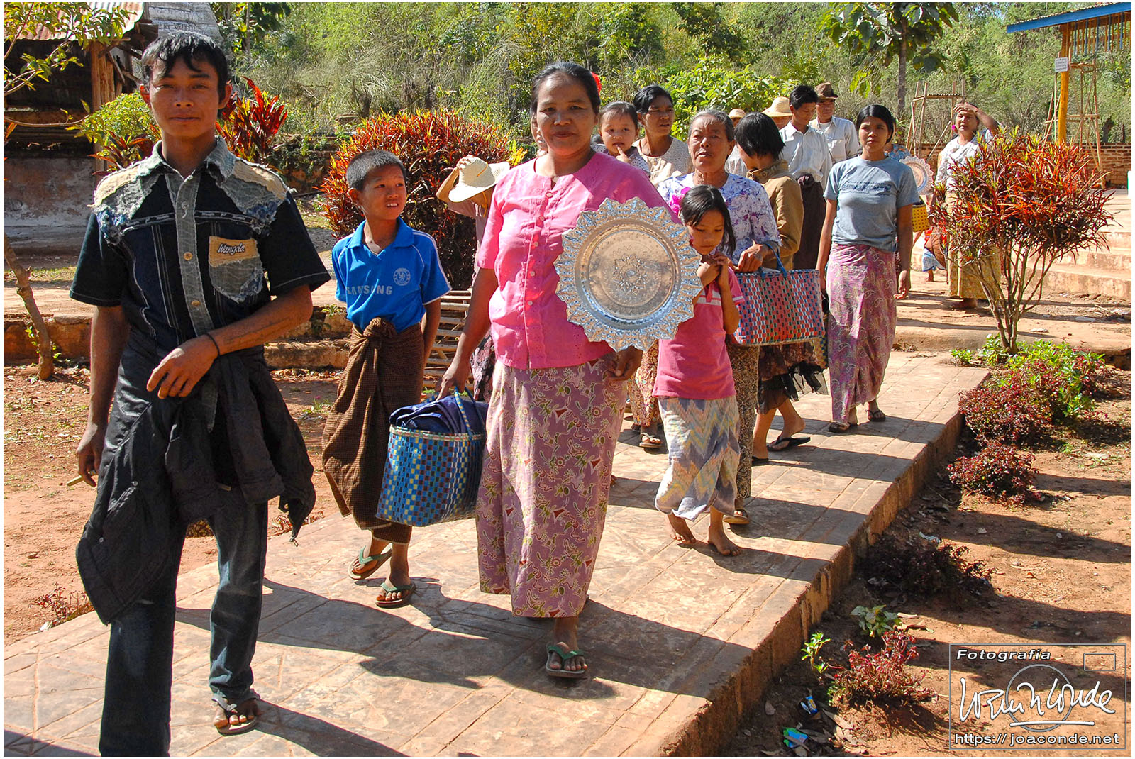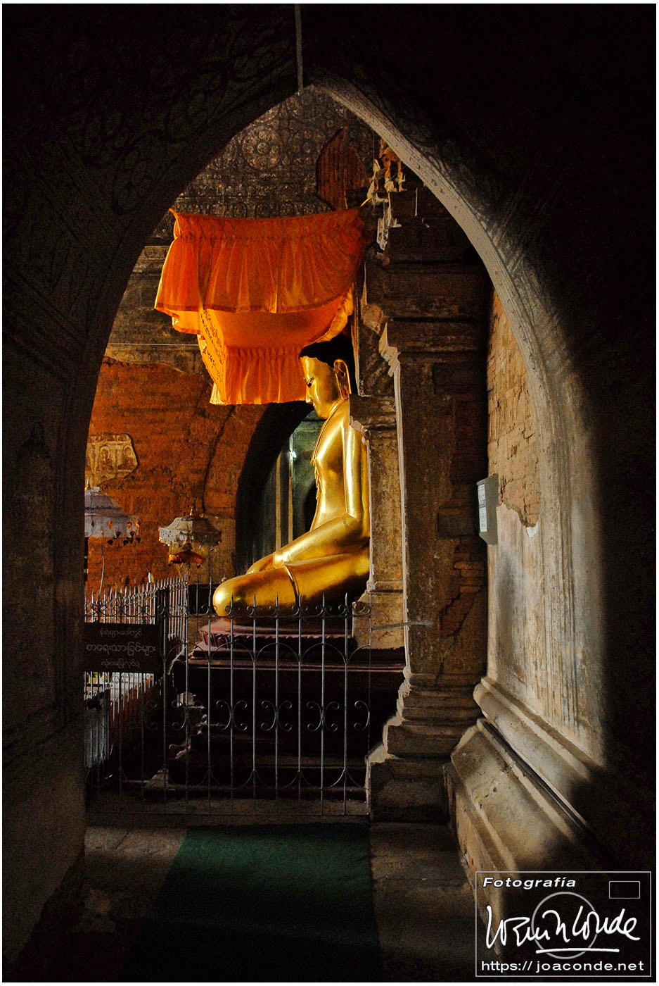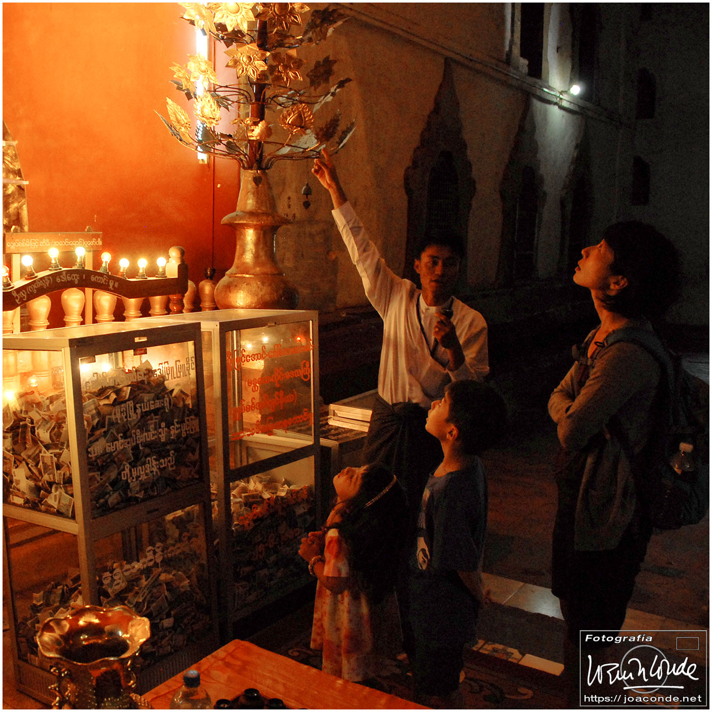 El vuelo 909 a Bagán salía a las 6:15, antes del amanecer. En la antigua capital visitamos en primer lugar el mercado de Niaung-U; allí tiré fotos a diestro y siniestro. Después fuimos a la pagoda de Shwezigon; dentro estaban las imágenes de los 37 nat, espíritus invisibles de los árboles o los de los ríos. Seguimos la ruta visitando el templo de Ananda, primo de Buda, en el que era costumbre pegar láminas de pan de oro a las figuras sagradas. También estuvimos en un taller de lacado y por último, fuimos al hotel Tharabar Gate, donde comimos y descansamos un rato.