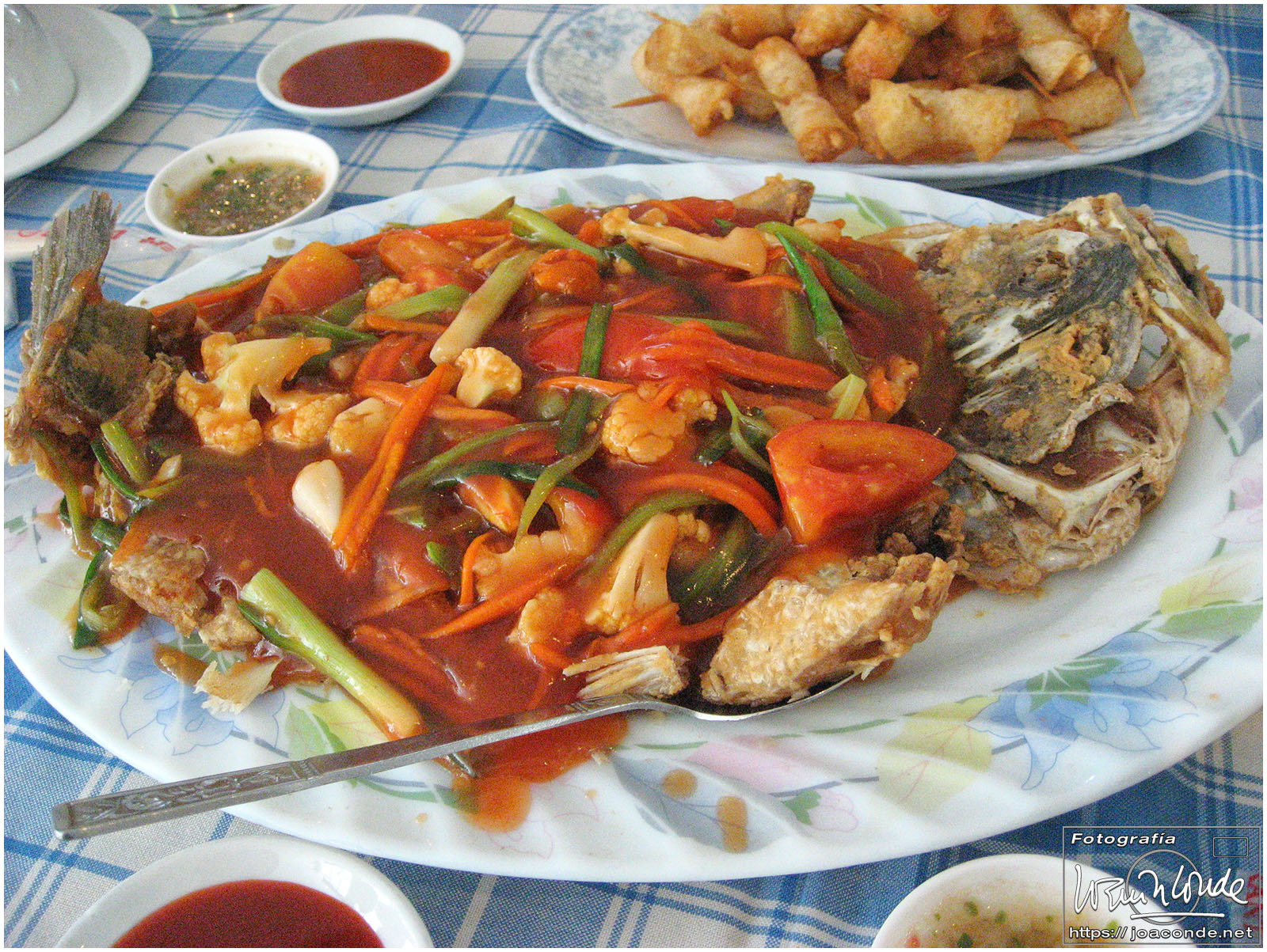 En el Sedona nos pusieron para comer verduras, carnes y pescados, muy sabrosos y poco especiados; la cerveza, insuperable, se servía en generosas botellas de 640 ml.
