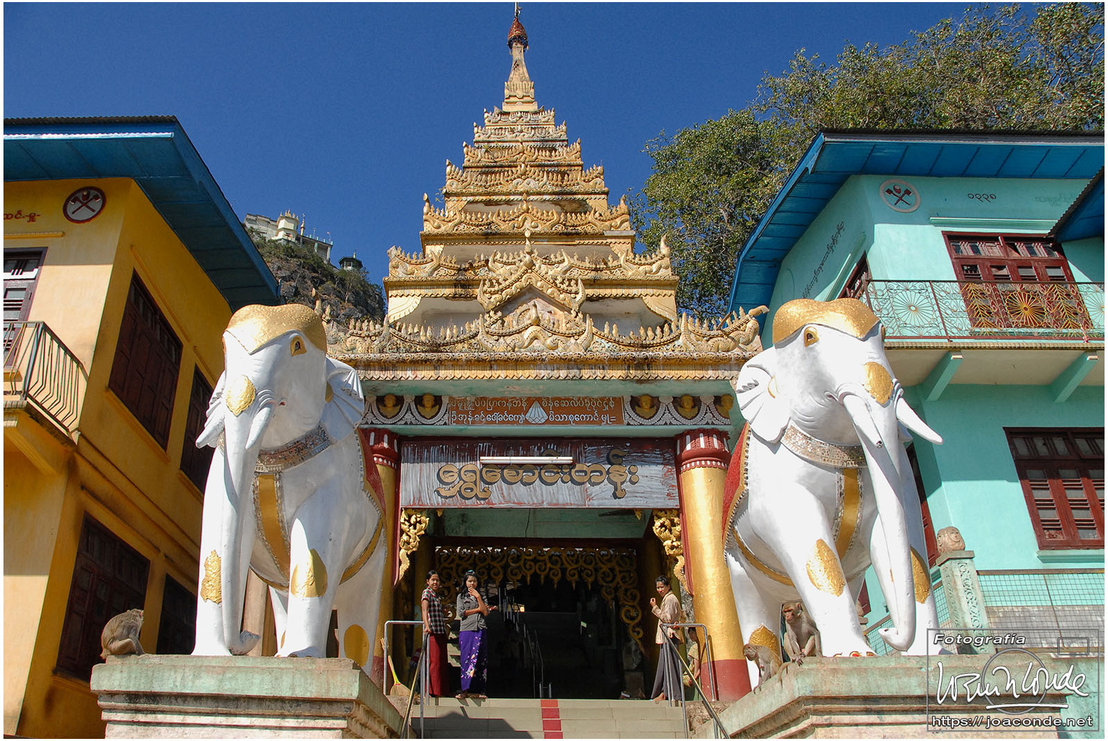 Muy temprano salimos hacia el este de Bagán, donde estaba la mayor concentración de estupas de Birmania. Subimos a las terrazas de la pagoda Dhammayazika para ver unas panorámicas inolvidables. La sorpresa del día fue avistar el Monte Popa, un antiguo volcán en cuya cima había un monasterio. Subimos los cientos de escalones entre budas, tiendas y puestos de comida, rodeados de monos —que tenían el suelo hecho un asco— y chiquillos que hacían como que lo limpiaban, para conseguir una propina. Comimos en un resort cercano y por la tarde, de vuelta en Bagán, navegamos un rato por el imponente río Irawadi.