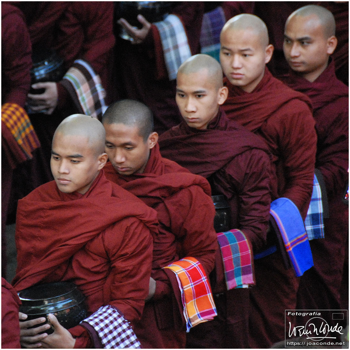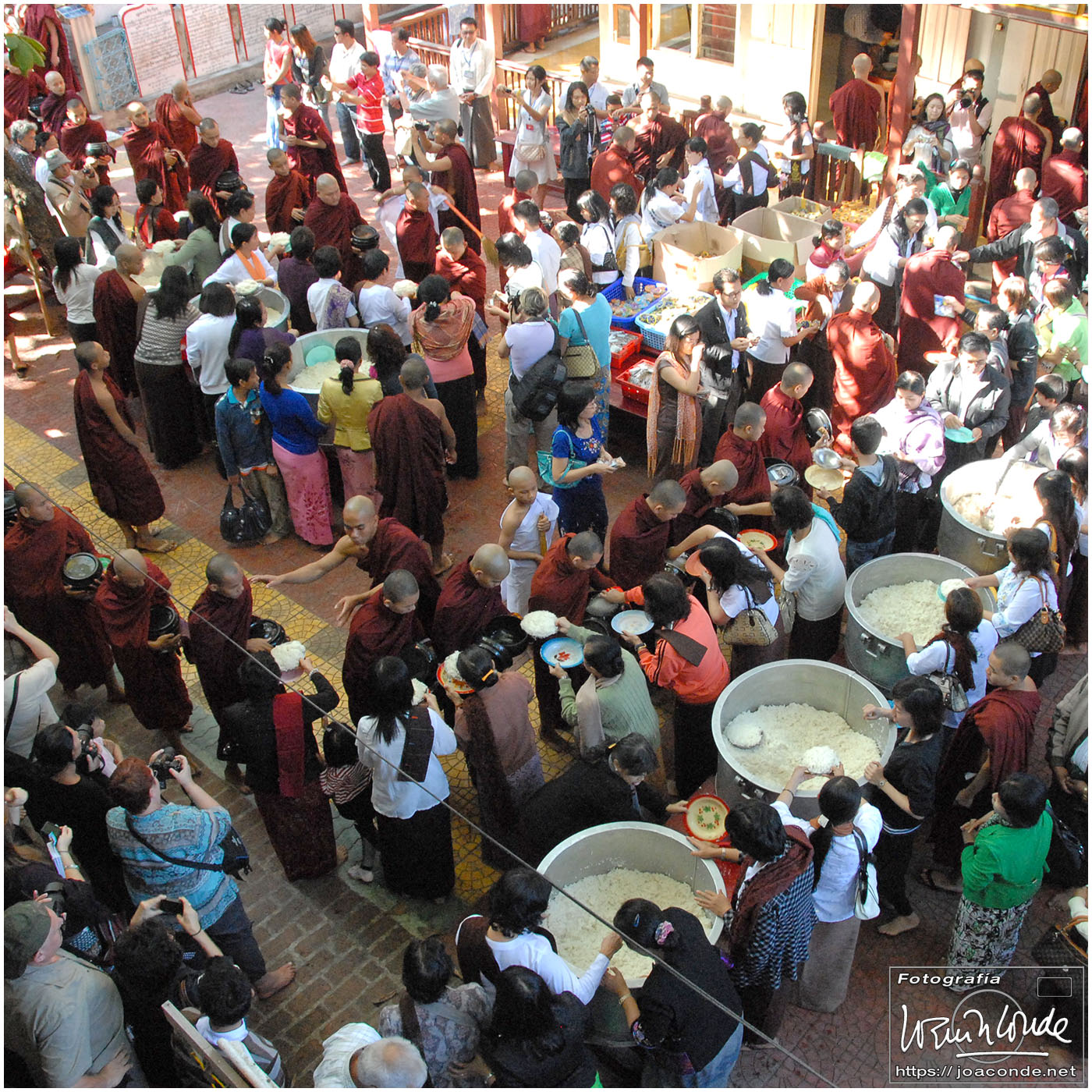 En primer lugar nos dirigimos a Amarapura, al Monasterio Mahagandhayon, donde se celebraba cada mañana una procesión en la que miles de monjes recibían su ración diaria de arroz —y algún extra— de manos de organizaciones y voluntarios donantes. También pudimos pasear por el recinto, viendo como era su día a día. Después fuimos al puente de U Bein, el más largo del mundo (1200 m.) construido con madera de teka, que atravesaba el lago Taungthaman. Más tarde estuvimos en un telar, y desde allí fuimos en barca a Ava, una pequeña isla. Visitamos los monasterios de Bagaya, en el que funcionaba una escuela regentada por monjes, y el Maha Aungmye Bonzan.