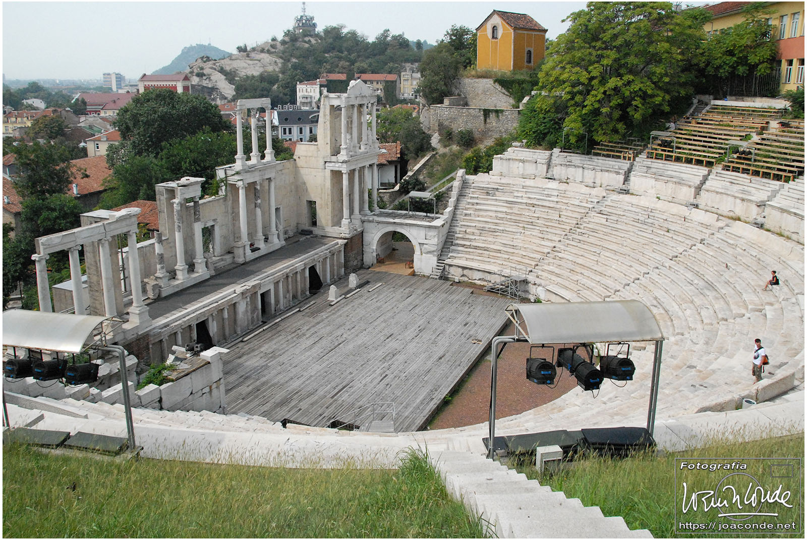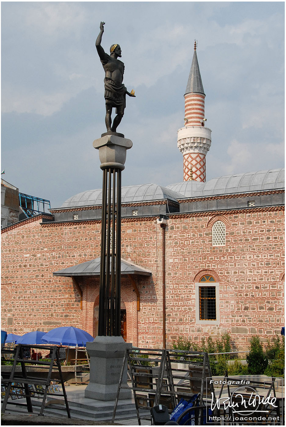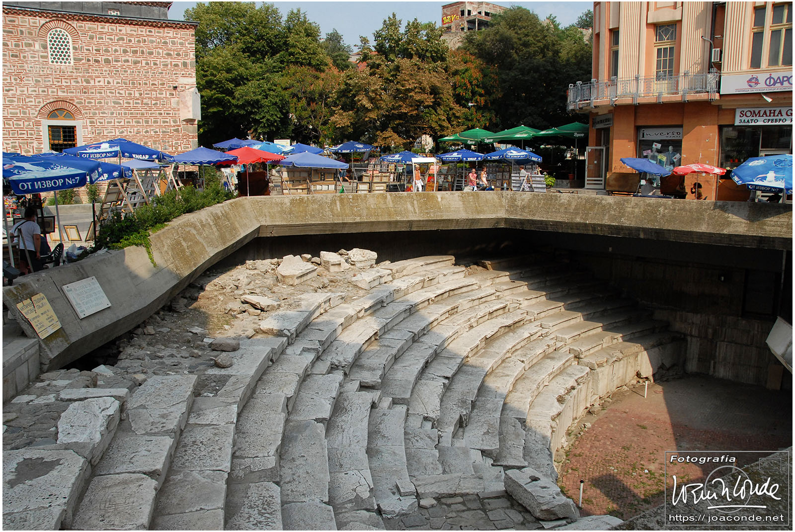 Completamos la mañana en la Iglesia de los Santos Constantino y Elena, la más antigua de la ciudad, que tenía unos frescos impresionantes. También fuimos al teatro romano, descubierto en 1972, que conservaba perfectamente 14 de sus 28 gradas. Y en la Mezquita Djumaya (la Mezquita del Viernes) se había vivido hacía cuatro días una trifulca entre dos facciones islámicas; el edificio estaba rodeado por varios furgones policiales. A pesar de ello, nos permitieron entrar a hacer fotos y hasta nos encendieron las luces.