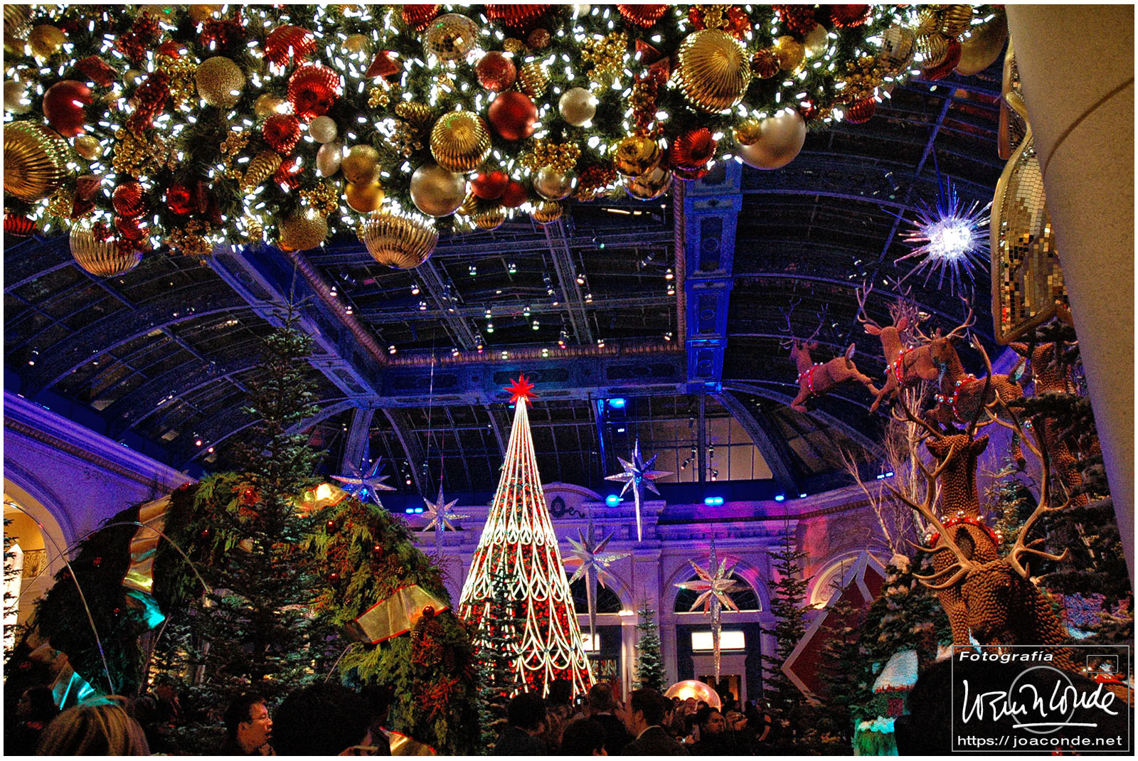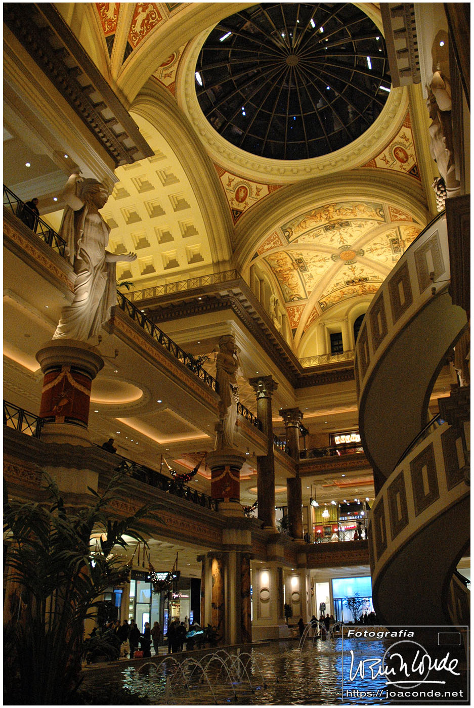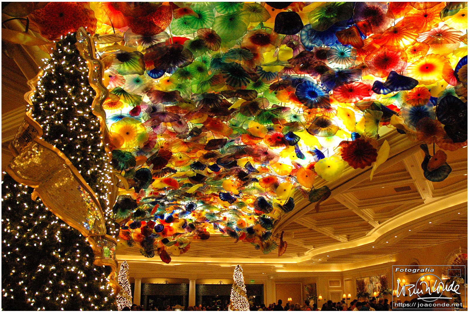 Por la noche estuvimos en el Venetian, un hotel impresionante; su interior era una réplica de la plaza de San Marcos, pero la calefacción revelaba que no estábamos al aire libre… ¡ni en Venecia! De allí fuimos al Caesars Palace —un pelín hortera— y al lago del hotel Bellagio. En pleno desierto, el espectáculo de agua, luces y Celine Dion cantando My Heart Will Go On, estuvo genial. En el interior del hotel (con casi 4000 habitaciones) había toda clase de lujos, entre ellos un jardín estacional con motivos navideños y todo el techo del lobby de cristal de Murano.