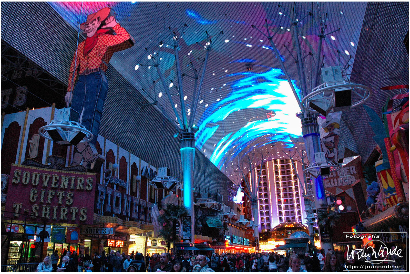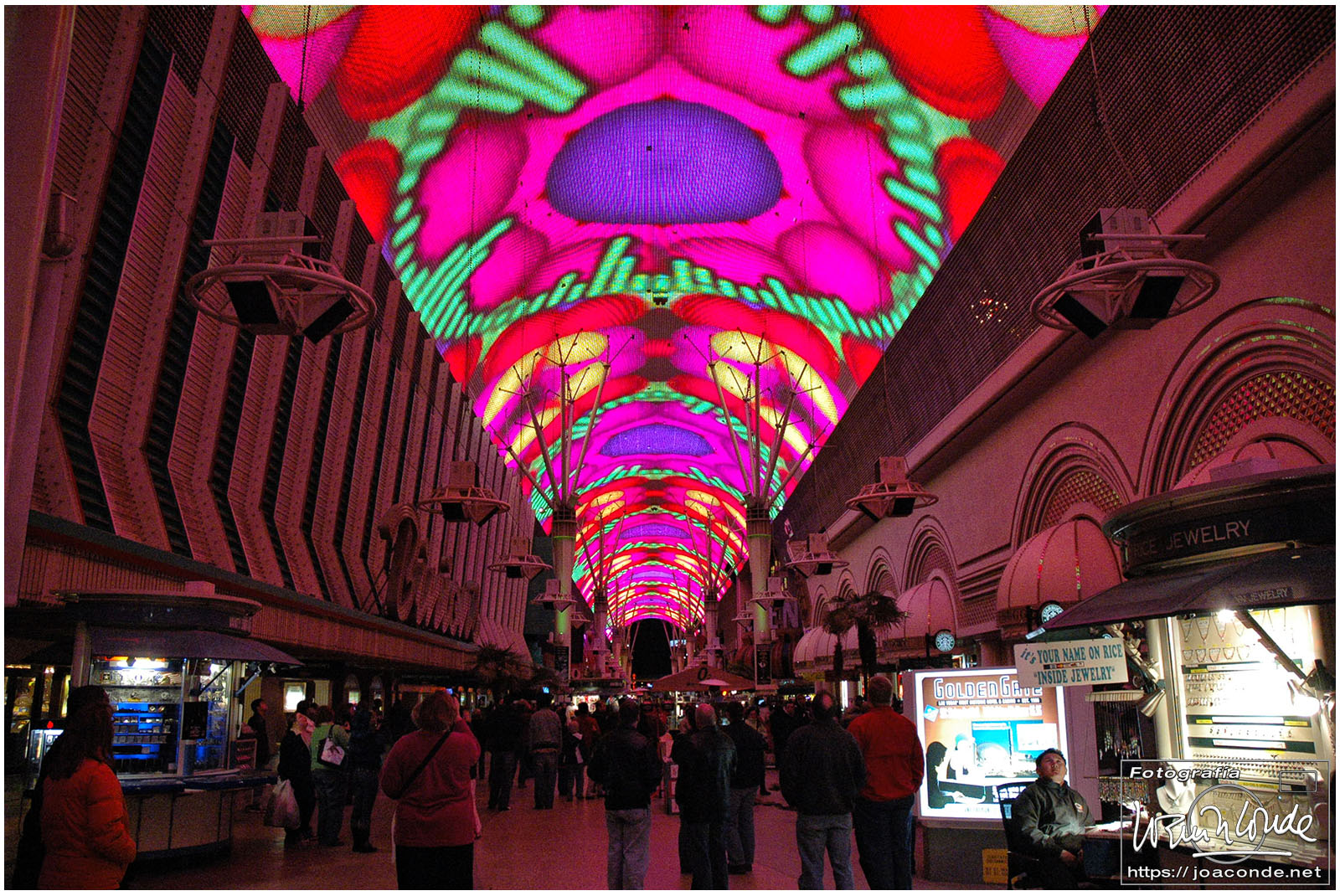 Después pasamos por Graceland, una famosa capilla de bodas que estaba cerrada 🫤 y terminamos la noche en la calle Fremont, una experiencia indescriptible. El techo de la calle (de 500 metros de largo) estaba recubierto con 12 millones de bombillas, acompañadas por 550.000 watios de sonido. No se puede explicar lo que sentí bajo aquella bóveda, así que he puesto un corto vídeo que hice.