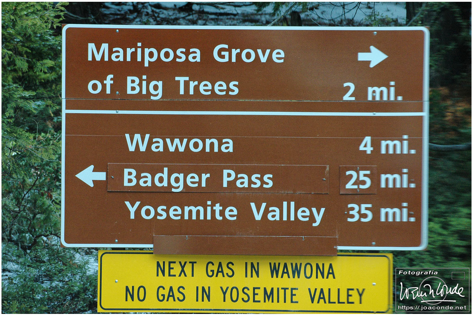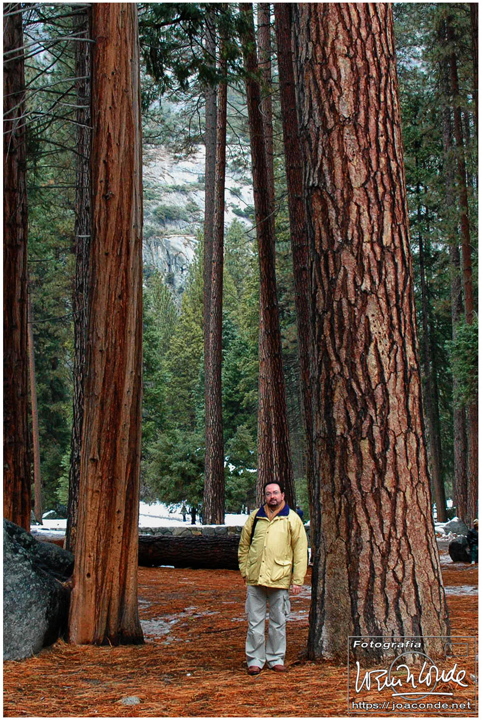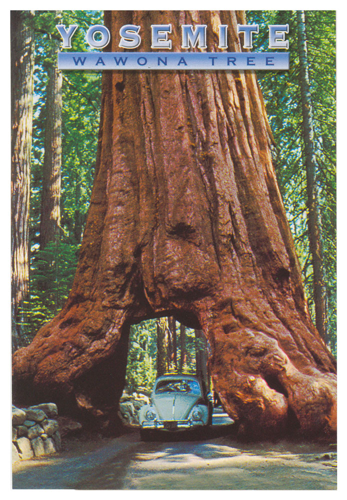 Al entrar en el Parque Nacional de Yosemite nos enteramos que las grandes sequoias quedaban a unos metros, pero la carretera estaba cortada por la nieve. Allí compré una postal del Wawona Tree. A ese árbol en 1881 se le hizo un enorme agujero y en 1969 colapsó bajo el peso de una acumulación récord de nieve, muriendo mil años antes de lo debido. Vimos el Half Dome y paramos bajo El Capitán, un bloque granítico de más de 900 metros de caída vertical. Por último paseamos entre las sequoias, que deben su nombre al jefe indio Sequoyah (1776-1843), inventor de un sistema de escritura cherokee. Por la noche salimos a cenar a Oakhurst, donde lo único a destacar era un gran centro comercial, en que se podían conseguir toda clase de armas y medicinas, excepto antibióticos, que requerían la prescripción de un médico que había allí mismo.