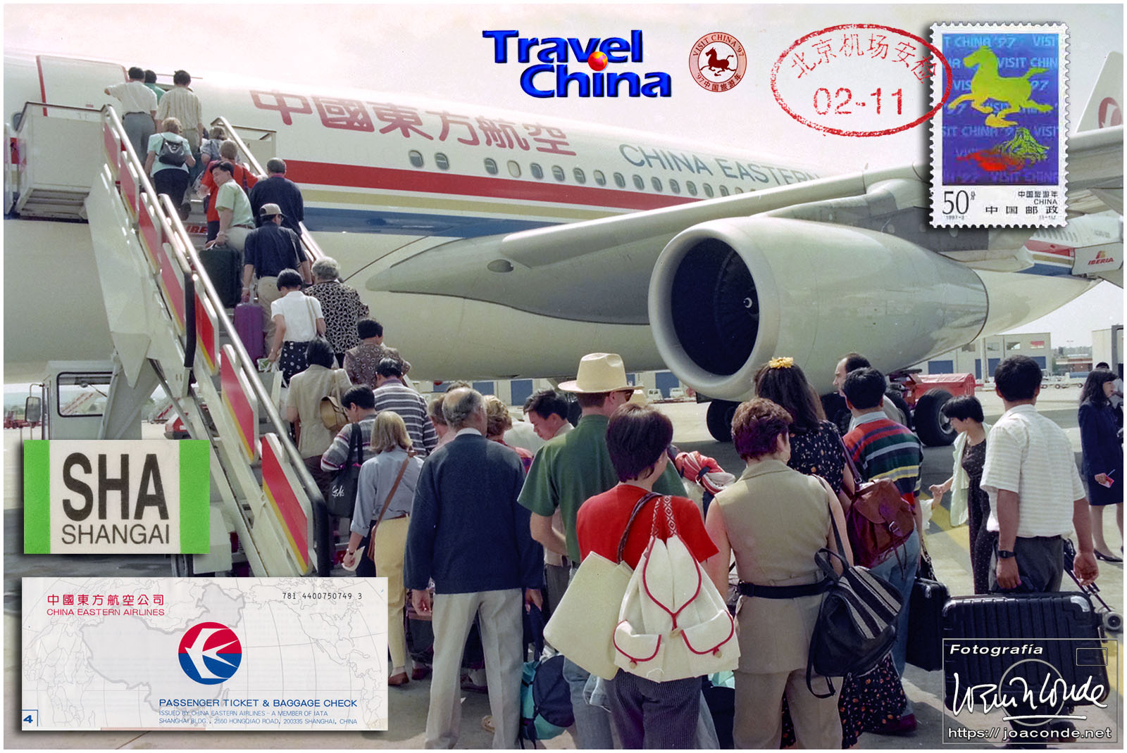 Viajamos a China en julio de 1997. En plena devolución de Hong Kong, se celebraba el Visit China ’97 y fuimos parte de los siete millones de extranjeros que llegamos aquel año. Era la primera vez que viajábamos a Asia y lo hicimos en un grupo organizado. Salimos de Madrid el día 9. El vuelo con China Eastern, que hizo escala en Bruselas, fue interminable; llegamos a Shanghai después de unas veinte horas. Llevábamos un visado colectivo, y en el tránsito por el aeropuerto de Pekín le pedimos a un funcionario que nos estampara algún sello en el pasaporte, para certificar nuestro paso por allí.