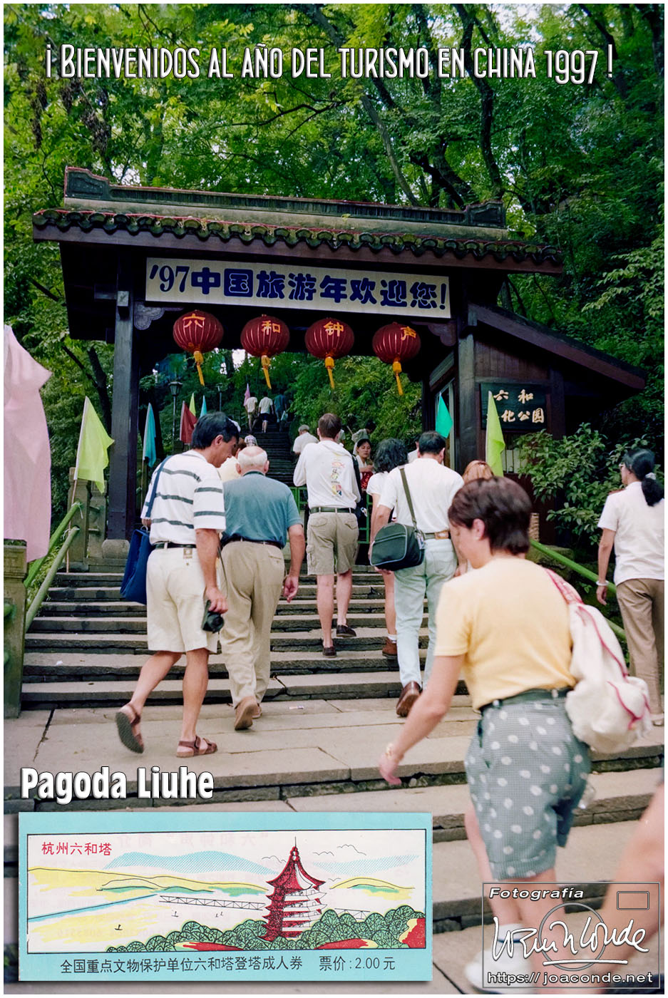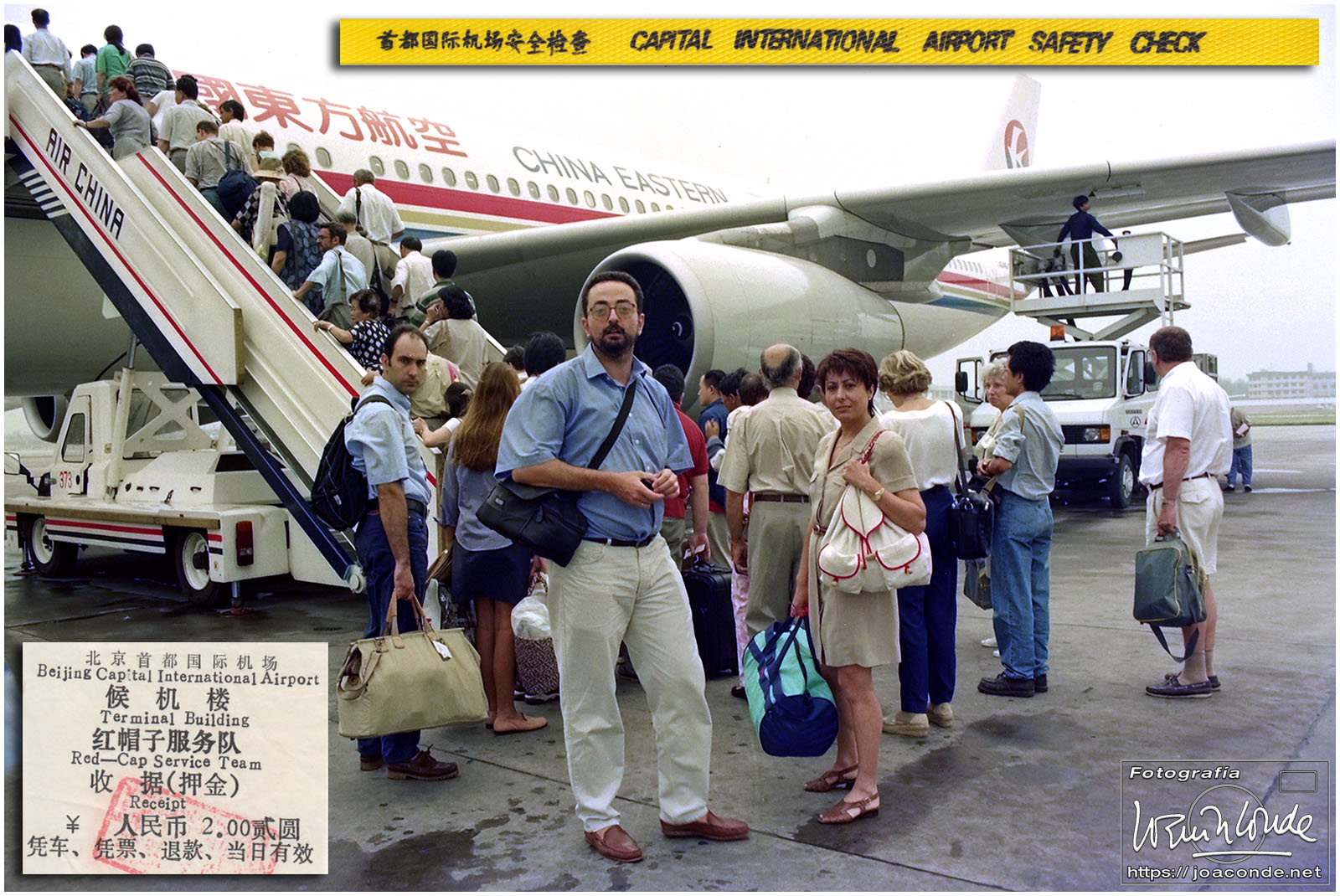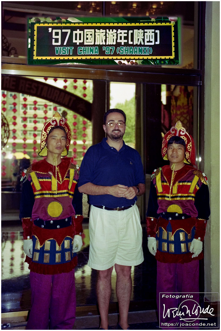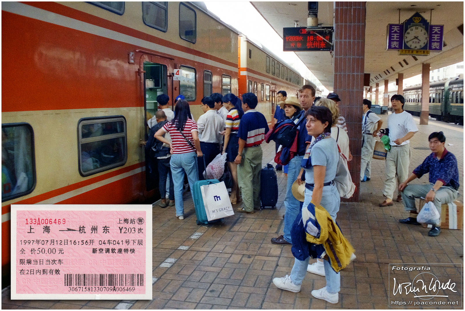 Viajamos a China en julio de 1997. En plena devolución de Hong Kong, se celebraba el Visit China ’97 y fuimos parte de los siete millones de extranjeros que llegamos aquel año. Era la primera vez que viajábamos a Asia y lo hicimos en un grupo organizado. Salimos de Madrid el día 9. El vuelo con China Eastern, que hizo escala en Bruselas, fue interminable; llegamos a Shanghai después de unas veinte horas. Llevábamos un visado colectivo, y en el tránsito por el aeropuerto de Pekín le pedimos a un funcionario que nos estampara algún sello en el pasaporte, para certificar nuestro paso por allí.