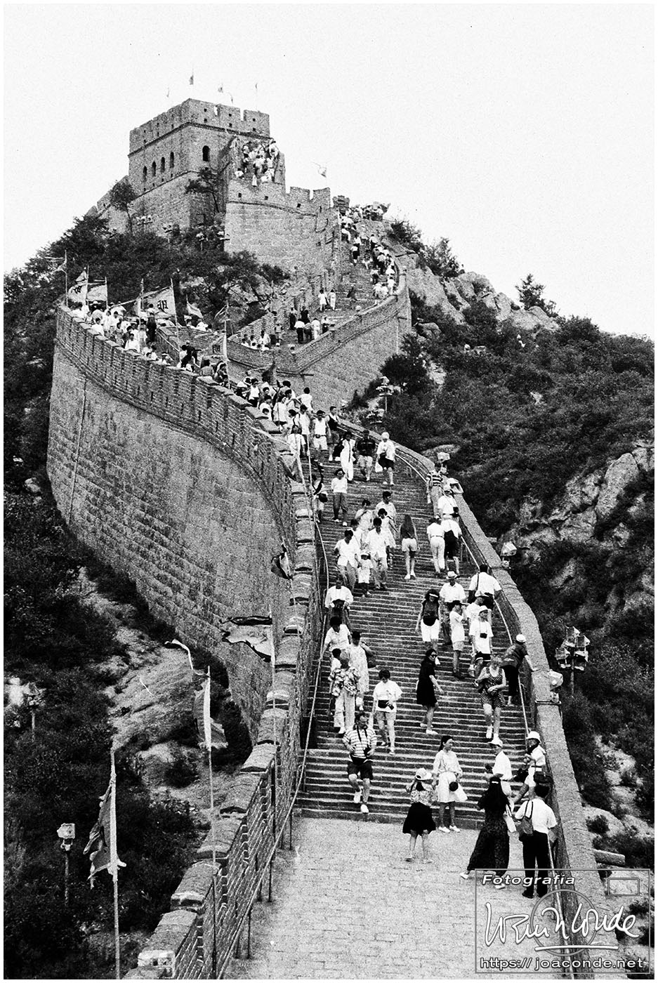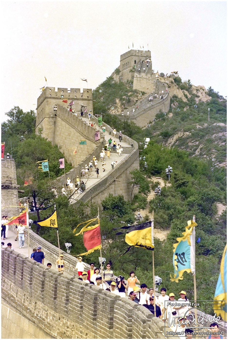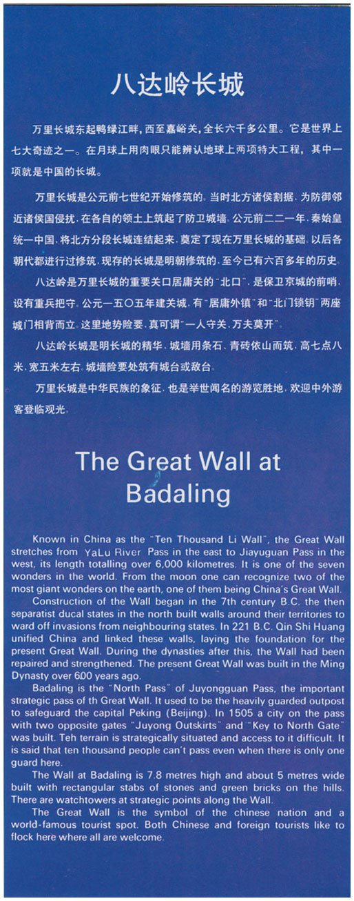 En nuestro último día en China fuimos a una factoría de cloisonné, y después visitamos las Tumbas Ming y la Gran Muralla en el sector de Badaling. La muralla que fue llamada de los 10.000 li (unos 5.000 km, aunque medía cuatro veces más) tenía unos desniveles impresionantes. A pesar de ello recorrimos un buen trecho.