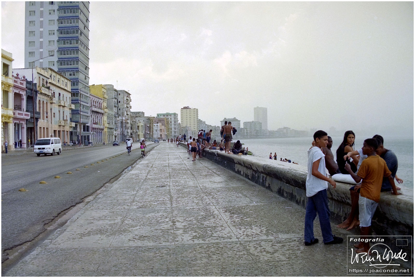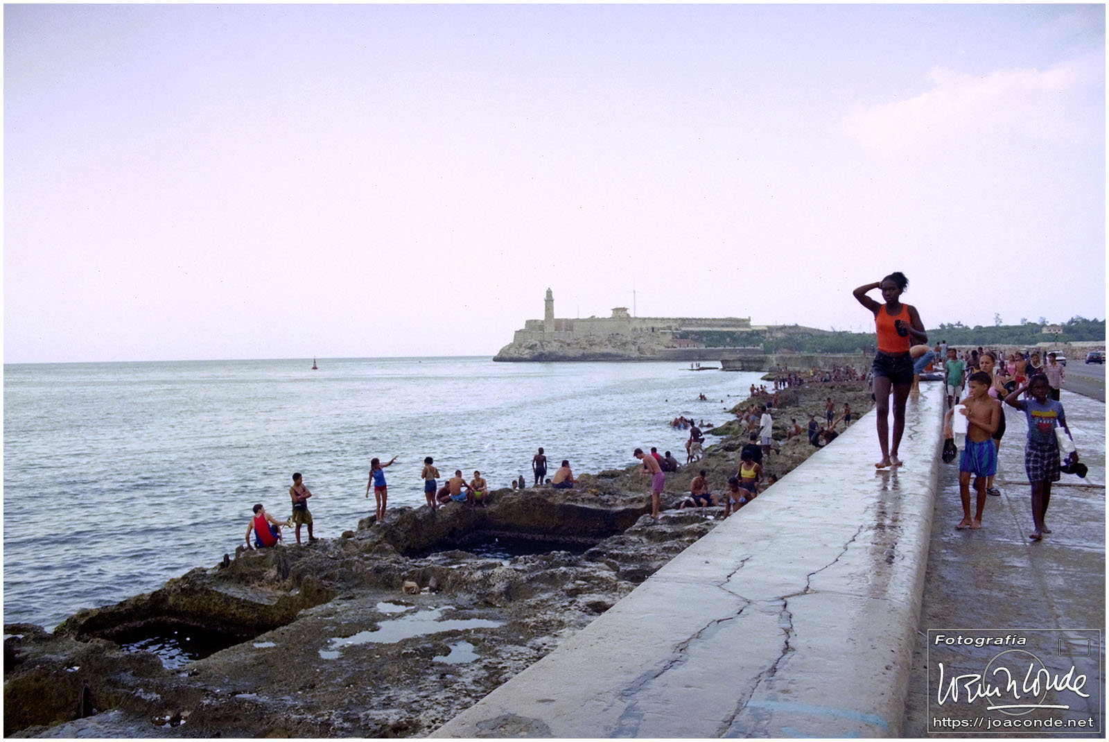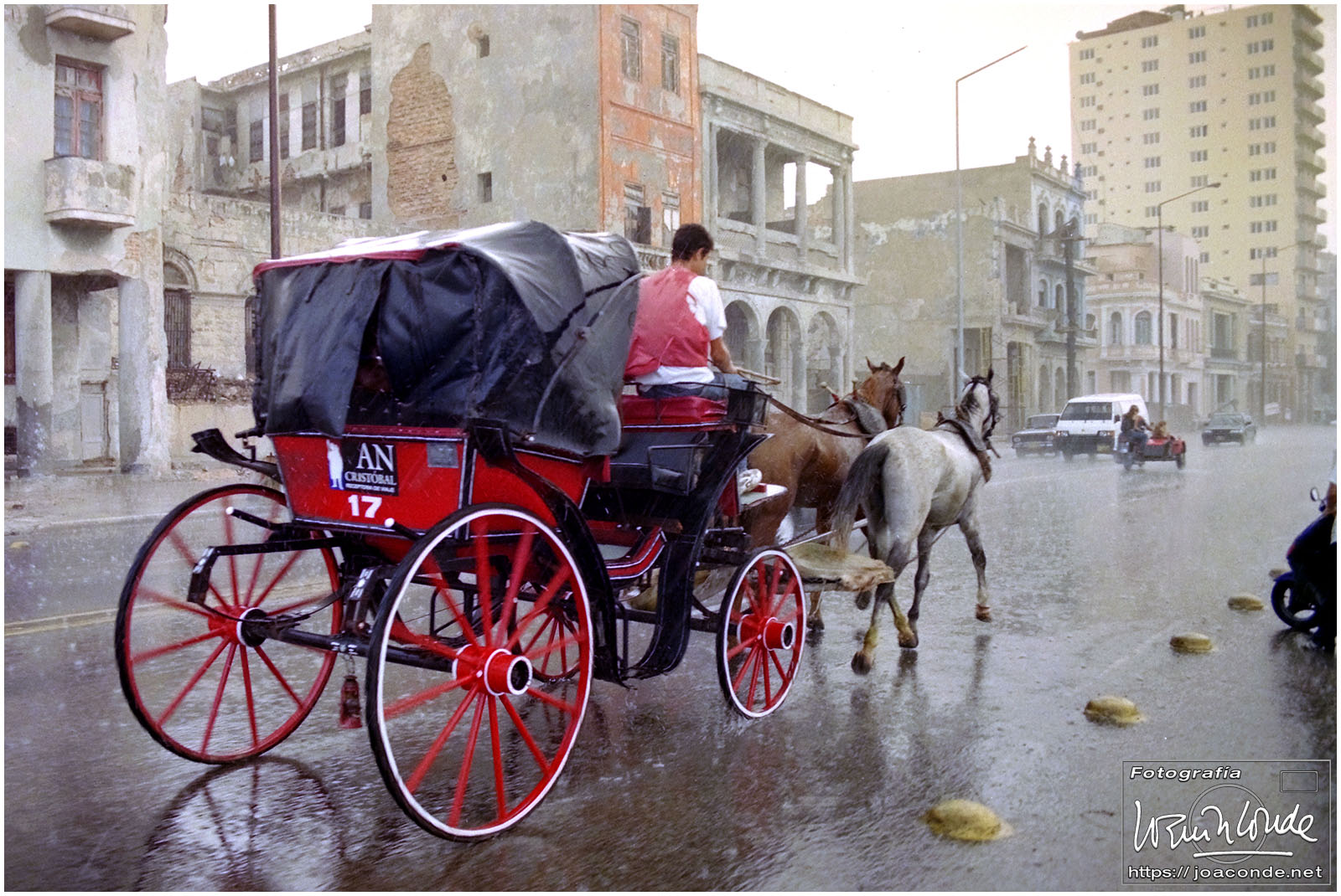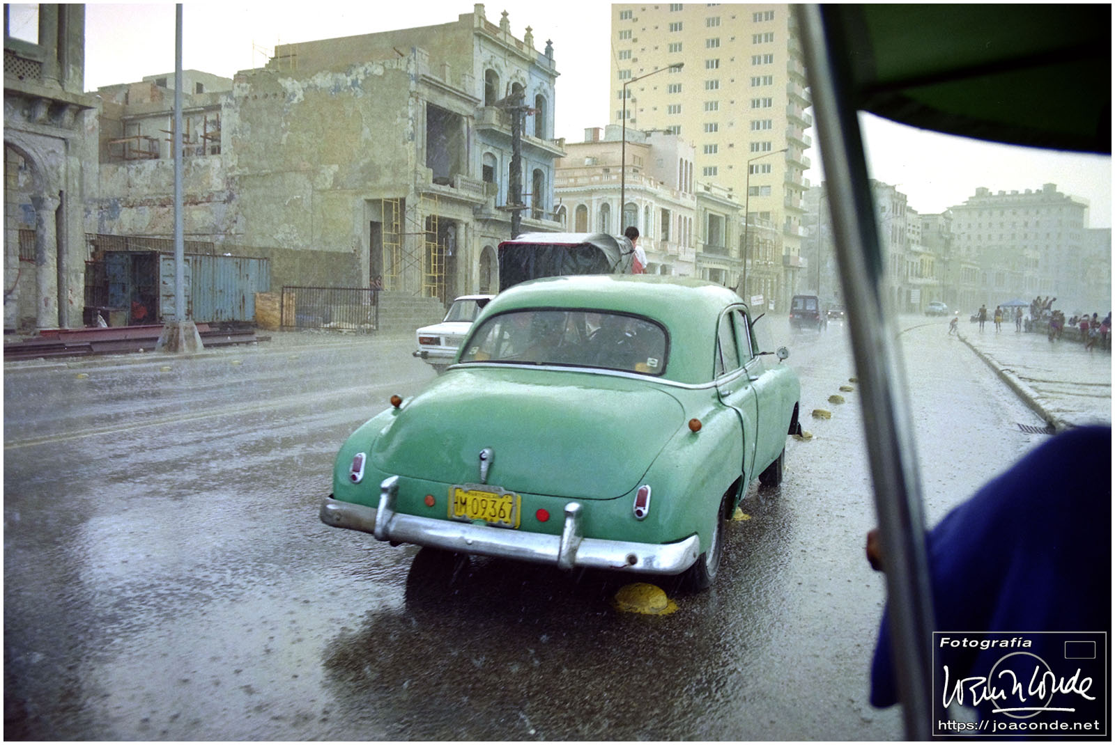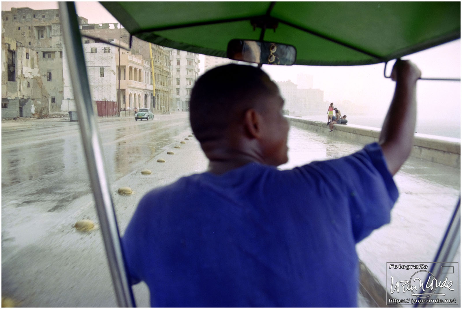 Por la tarde volvíamos al hotel paseando por el Malecón habanero. Una chica caminaba por el pretil en un contraluz perfecto; solo me dio tiempo a hacer una foto. En segundos comenzó el diluvio. Un joven nos rescató en un triciclo y nos llevó hasta cerca del hotel mientras caían chuzos de punta. Antes de llegar escampó y la policía detuvo el carrillo; el muchacho no tenía licencia y le echaron una bronca; nosotros seguimos unos metros caminando hasta el Cohiba.