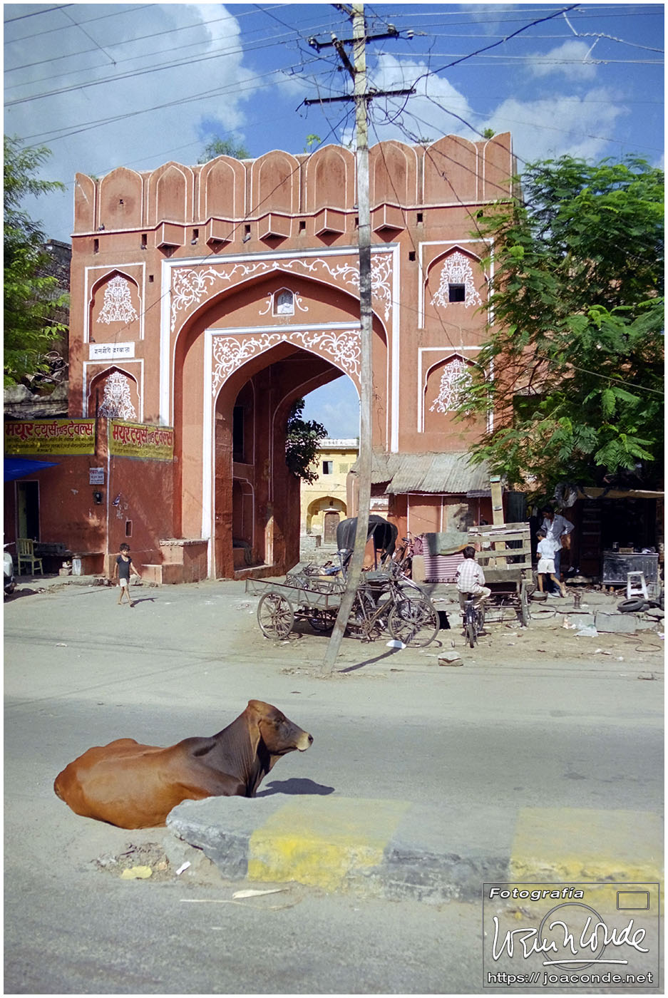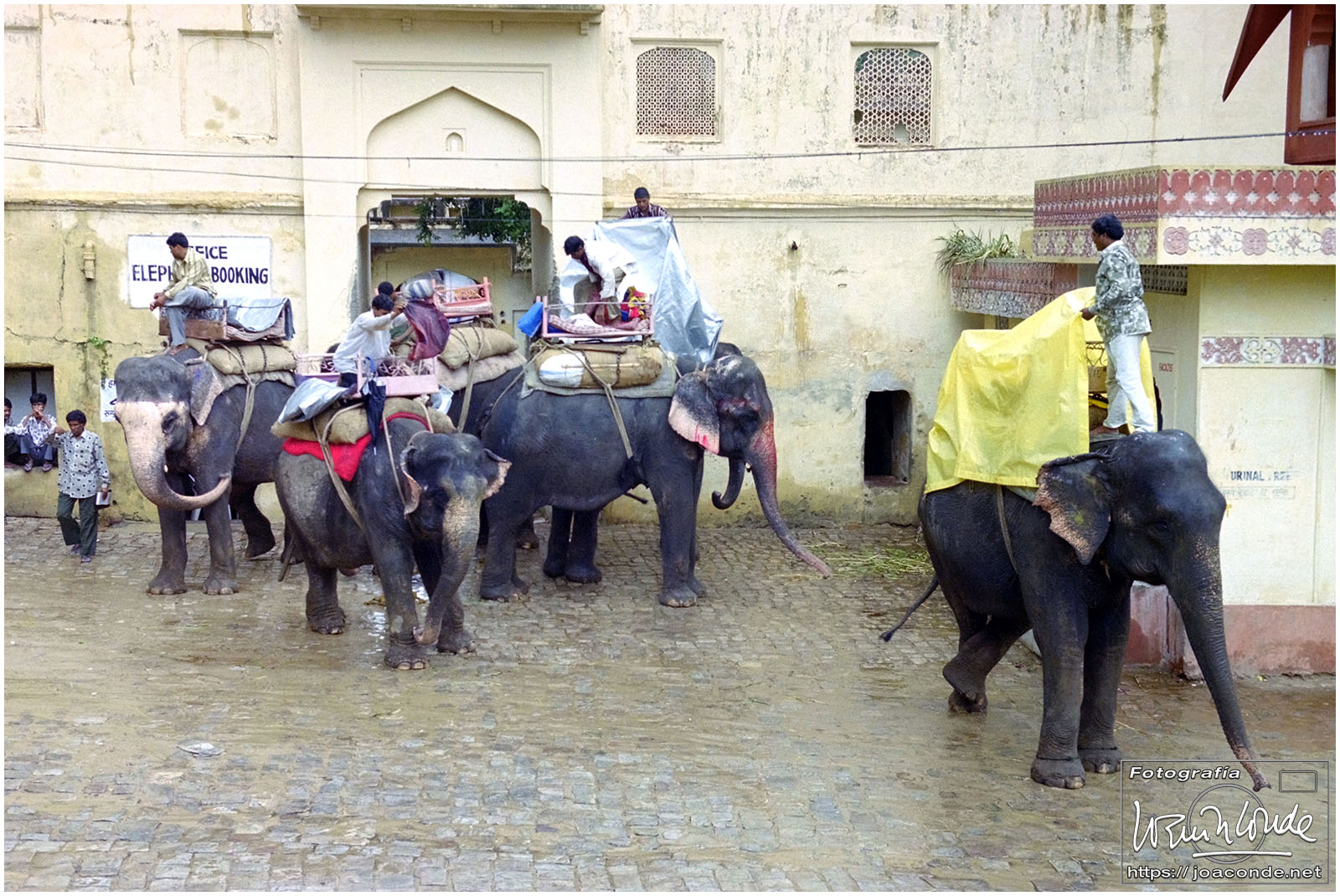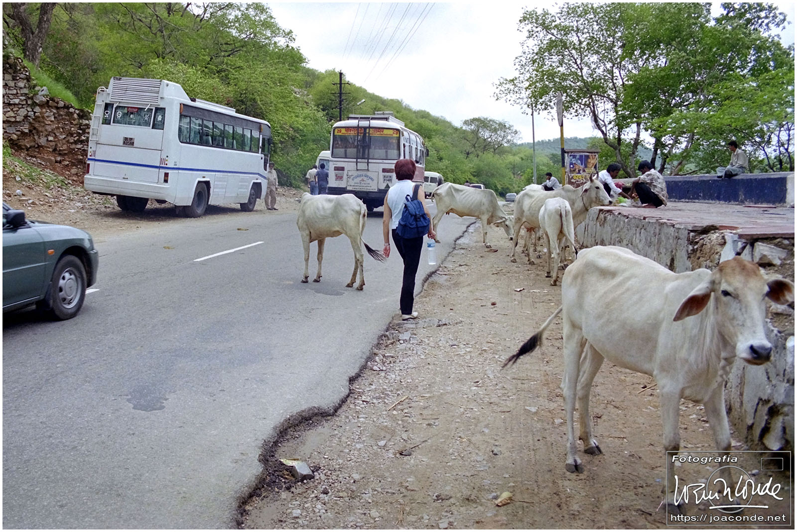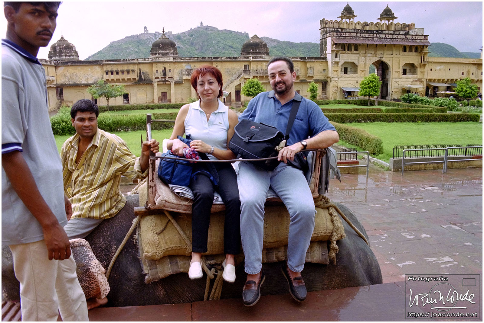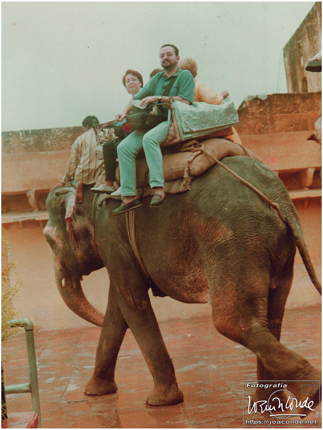 Llegando a Jaipur ya habíamos visto la mole del Fuerte Amber sobre un cerro. Era un complejo palaciego impresionante, al que se accedía a lomos de elefantes. Otra experiencia movidita. El interior era una espectacular sucesión de palacios, estancias y jardines. La decoración muy refinada, sorprendentes los sistemas de ventilación y la privacidad garantizada por infinitas celosías. A la salida, más vacas campando a sus anchas, tranquilas por su condición sagrada. Después fuimos a un almacén de alfombras y compramos una que nos gustó y que nos mandaron a casa por TNT.
