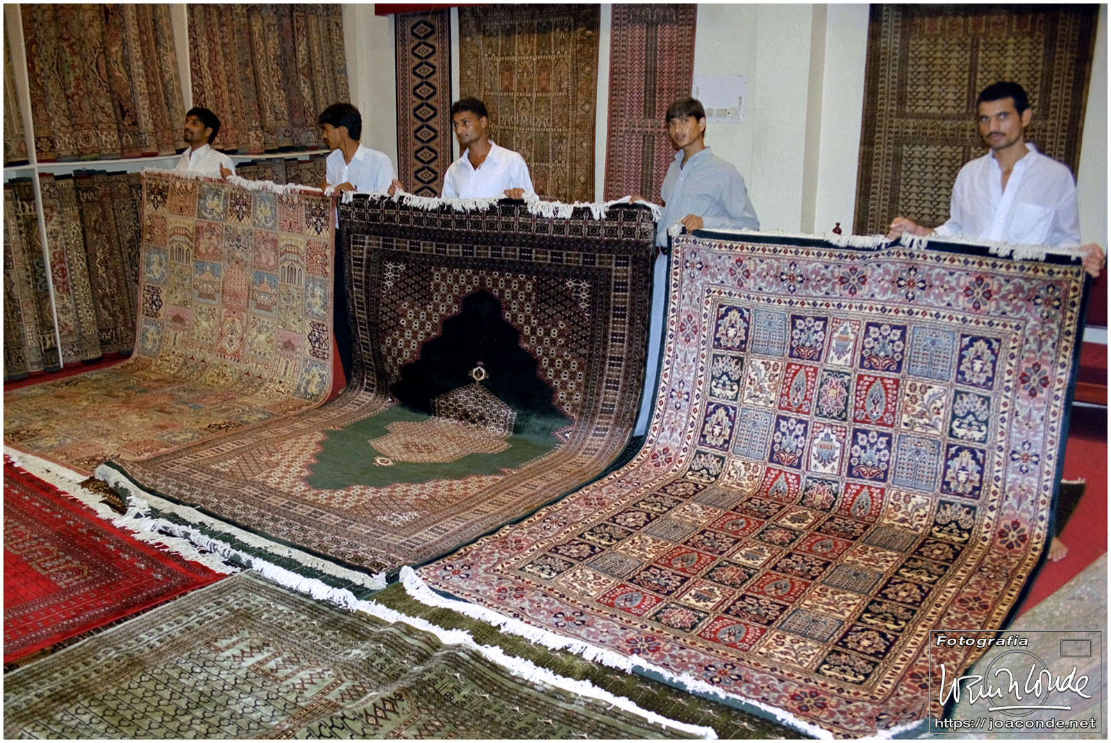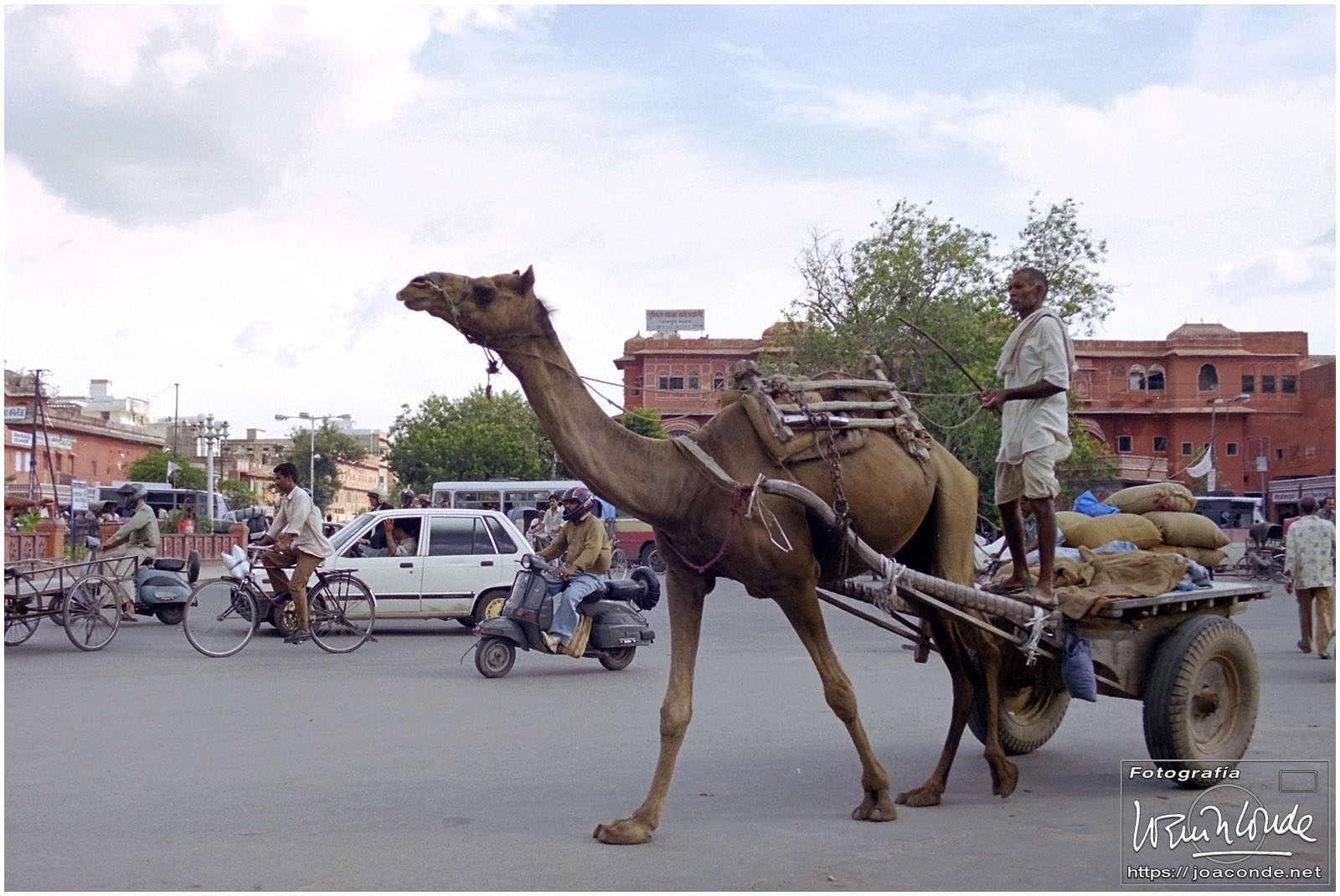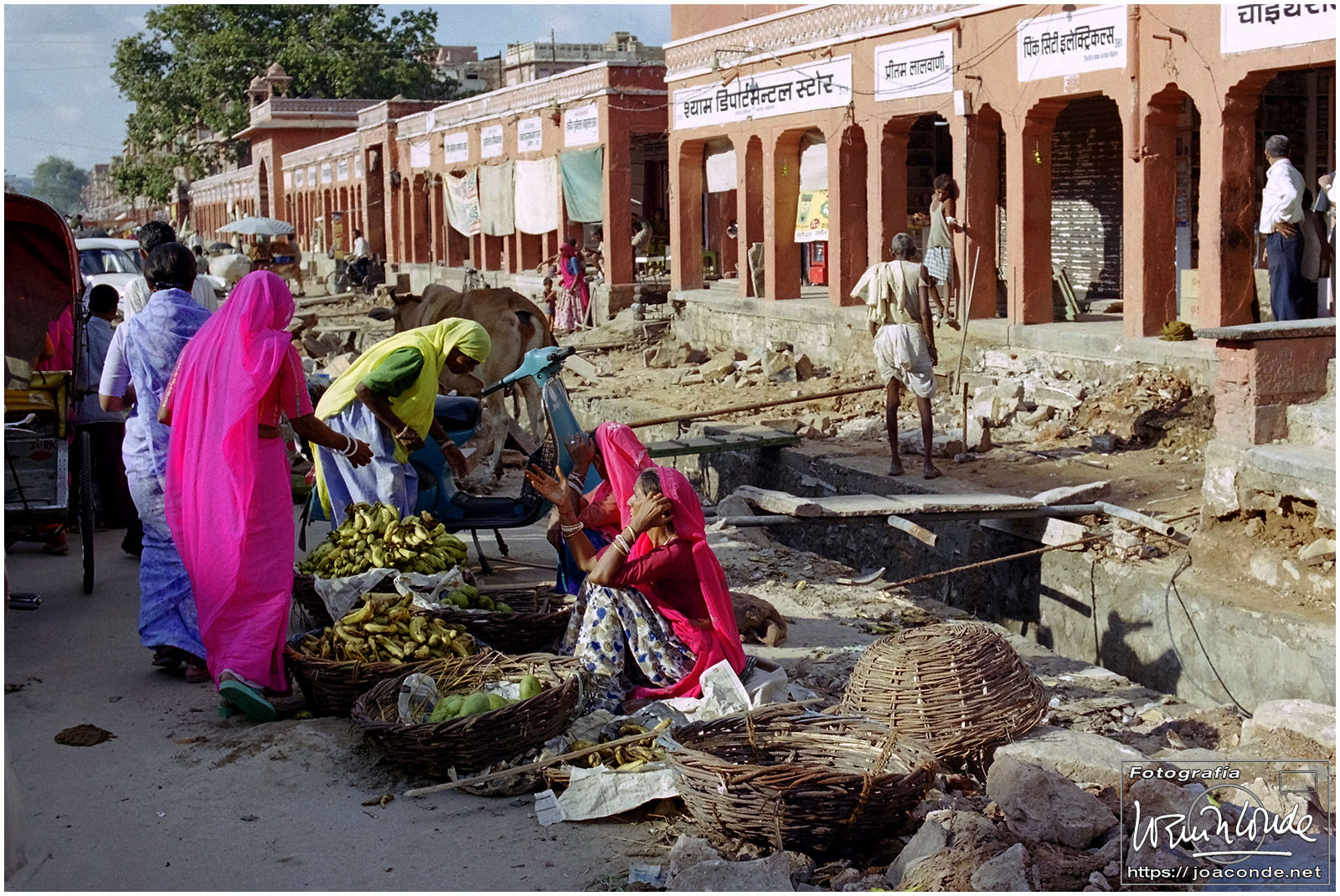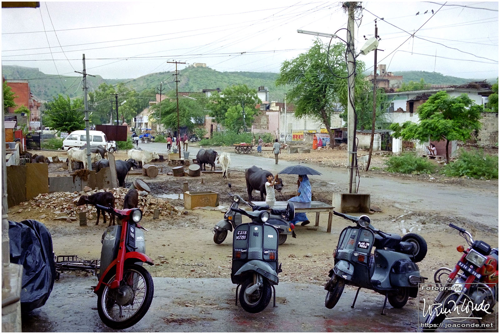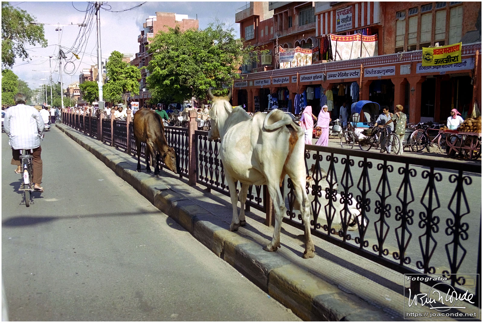 Llegando a Jaipur ya habíamos visto la mole del Fuerte Amber sobre un cerro. Era un complejo palaciego impresionante, al que se accedía a lomos de elefantes. Otra experiencia movidita. El interior era una espectacular sucesión de palacios, estancias y jardines. La decoración muy refinada, sorprendentes los sistemas de ventilación y la privacidad garantizada por infinitas celosías. A la salida, más vacas campando a sus anchas, tranquilas por su condición sagrada. Después fuimos a un almacén de alfombras y compramos una que nos gustó y que nos mandaron a casa por TNT.
