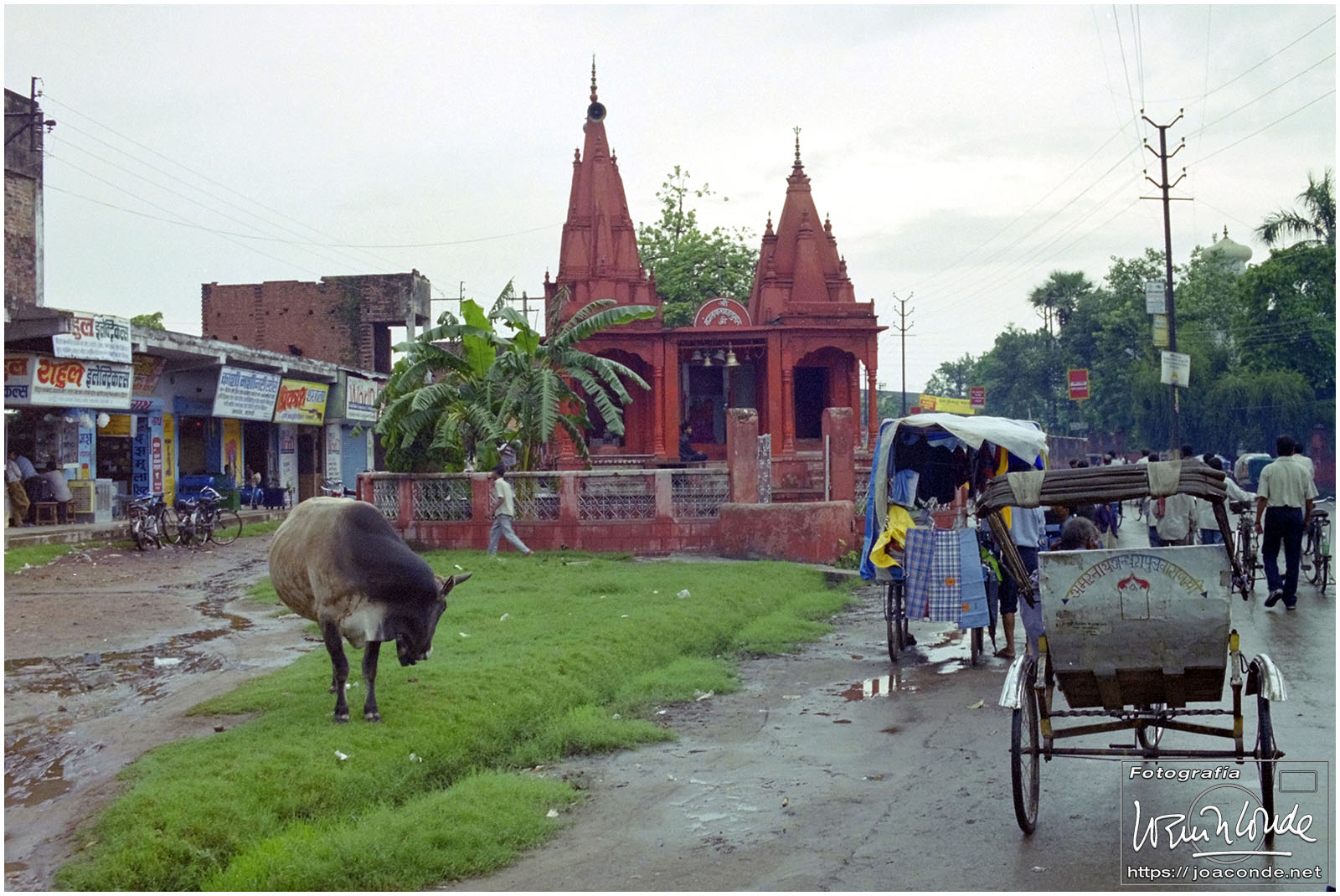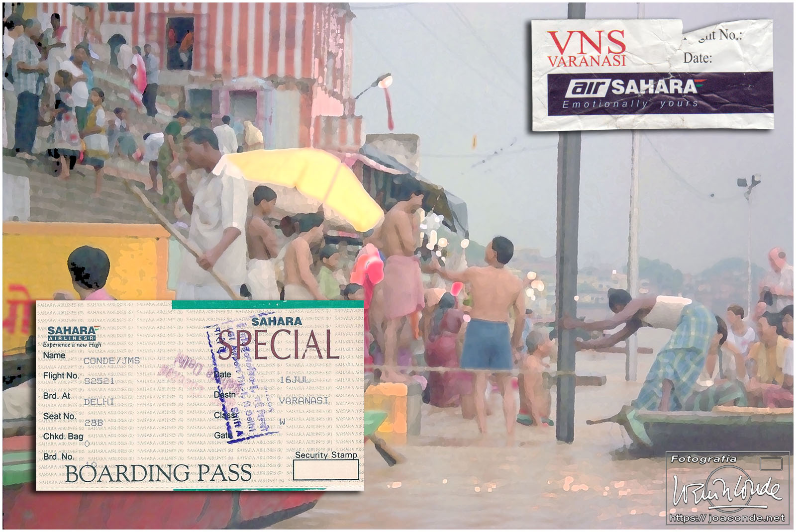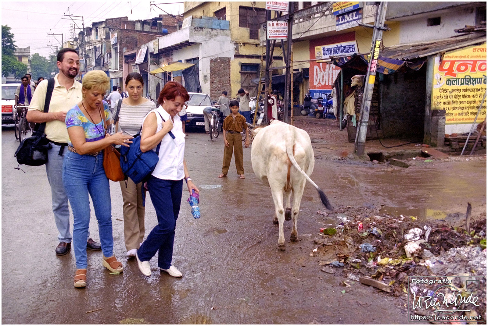 Volamos con Sahara Airlines a Benarés, la más sagrada de las 7 ciudades sagradas de la India. Camino al hotel Clarks vimos muchos peregrinos —yo los llamaba «los de las gaitas»— y algún que otro «entierro». Pasamos la tarde paseando entre atascos, vacas y montones de basura. A última hora fuimos a un telar; la seda, bonita y barata. Y nos acostamos muy temprano.