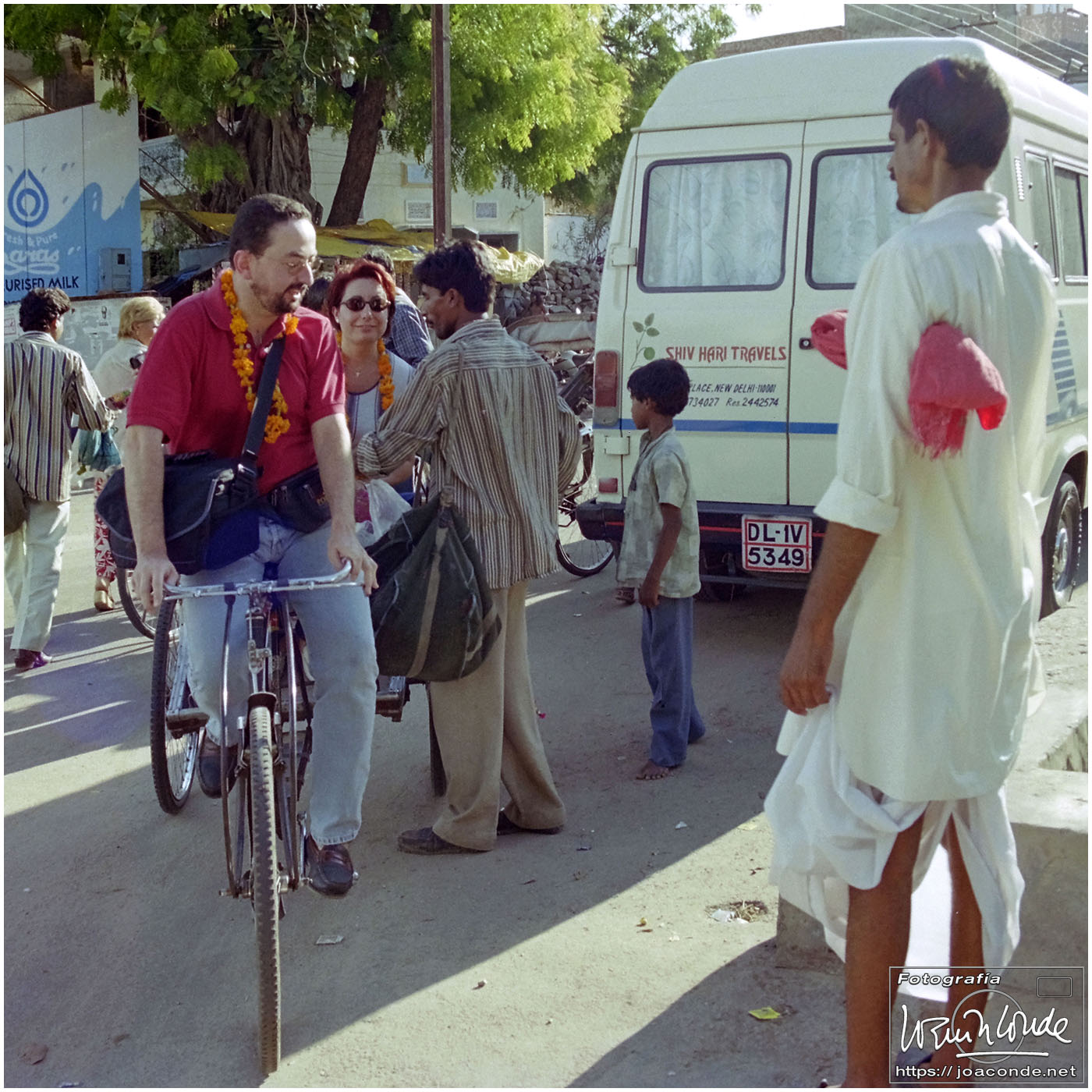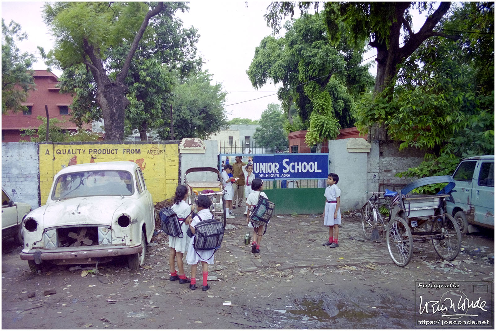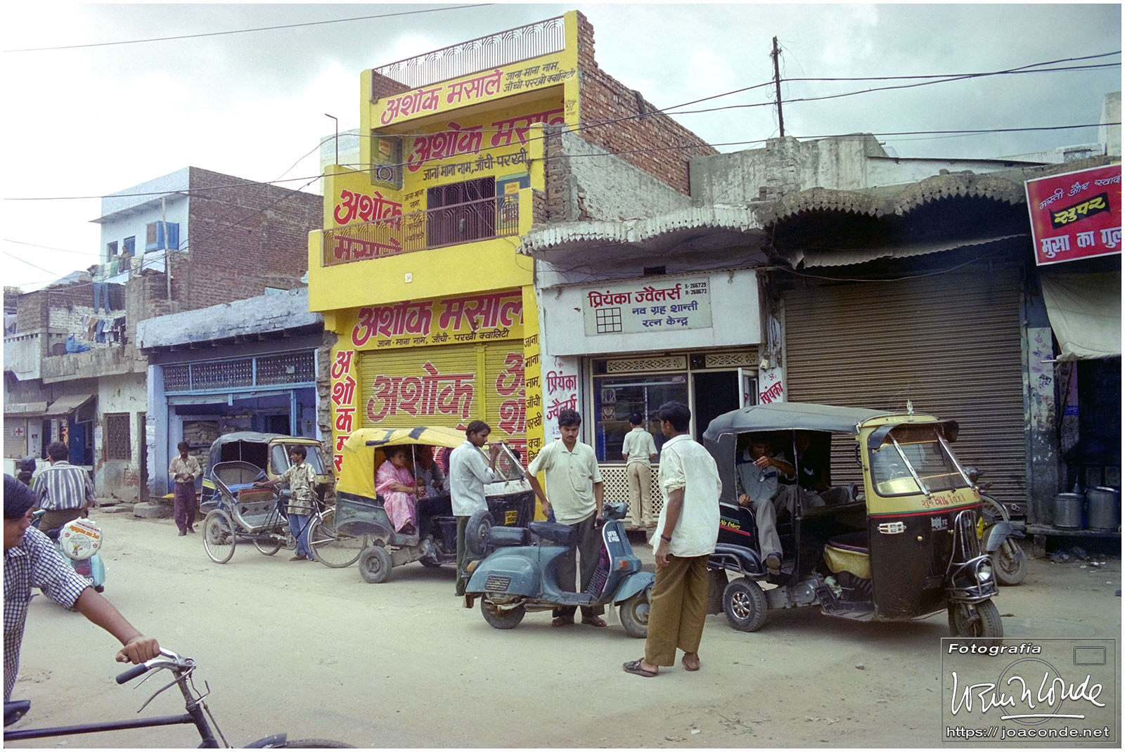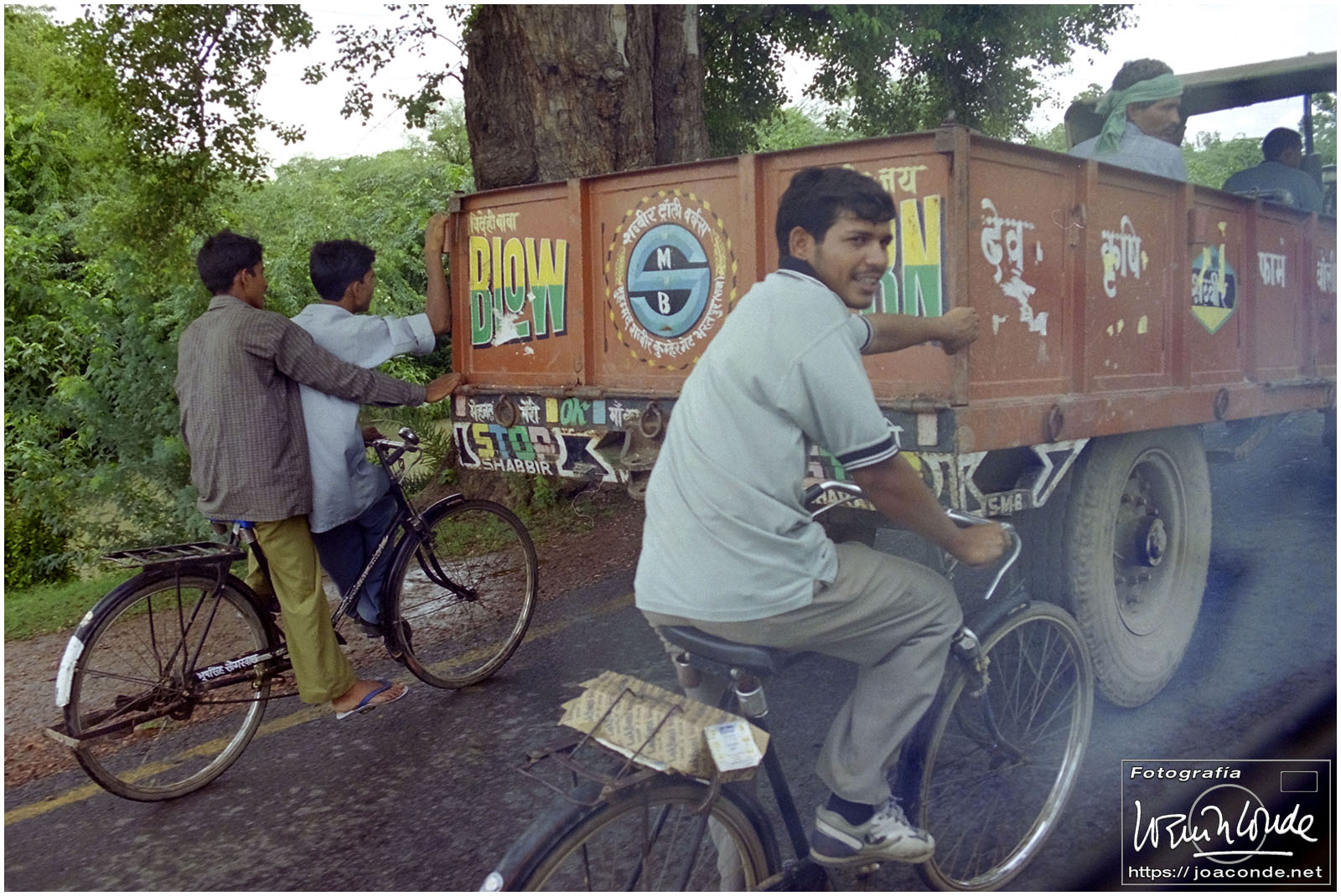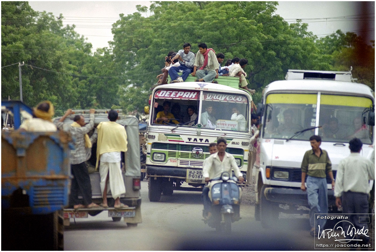 Agra estaba a unos 200 km. Salimos temprano y no solté la cámara por el camino, es que lo que estaba viendo no tenía precio. Mucha gente vivía a la intemperie, bajo unos plásticos; se les veía felices. Además se ahorrarían hipotecas y facturas… ¡qué poco hacía falta para vivir! Otro espectáculo, los bares de carretera. Y peregrinos, miles de jóvenes vestidos de naranja trayendo o llevando agua del Ganges en vasijas que jamás podía tocar el suelo; después del viaje me enteré de más detalles. Otra historia aparte era el tráfico: ¡una locura! Vehículos sobrecargados, cuando no con ciclistas enganchados, los coches iban a su bola y siempre tocando el claxon, y cuando había un accidente, nadie acudía, ni policía ni grúa.