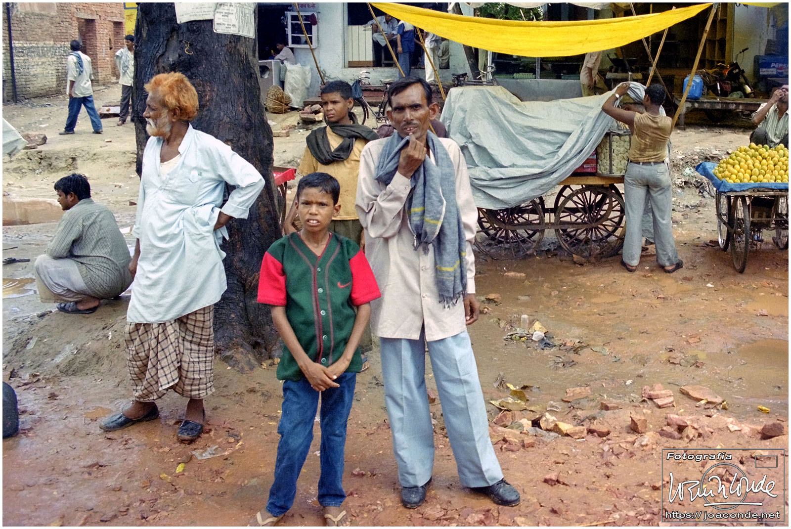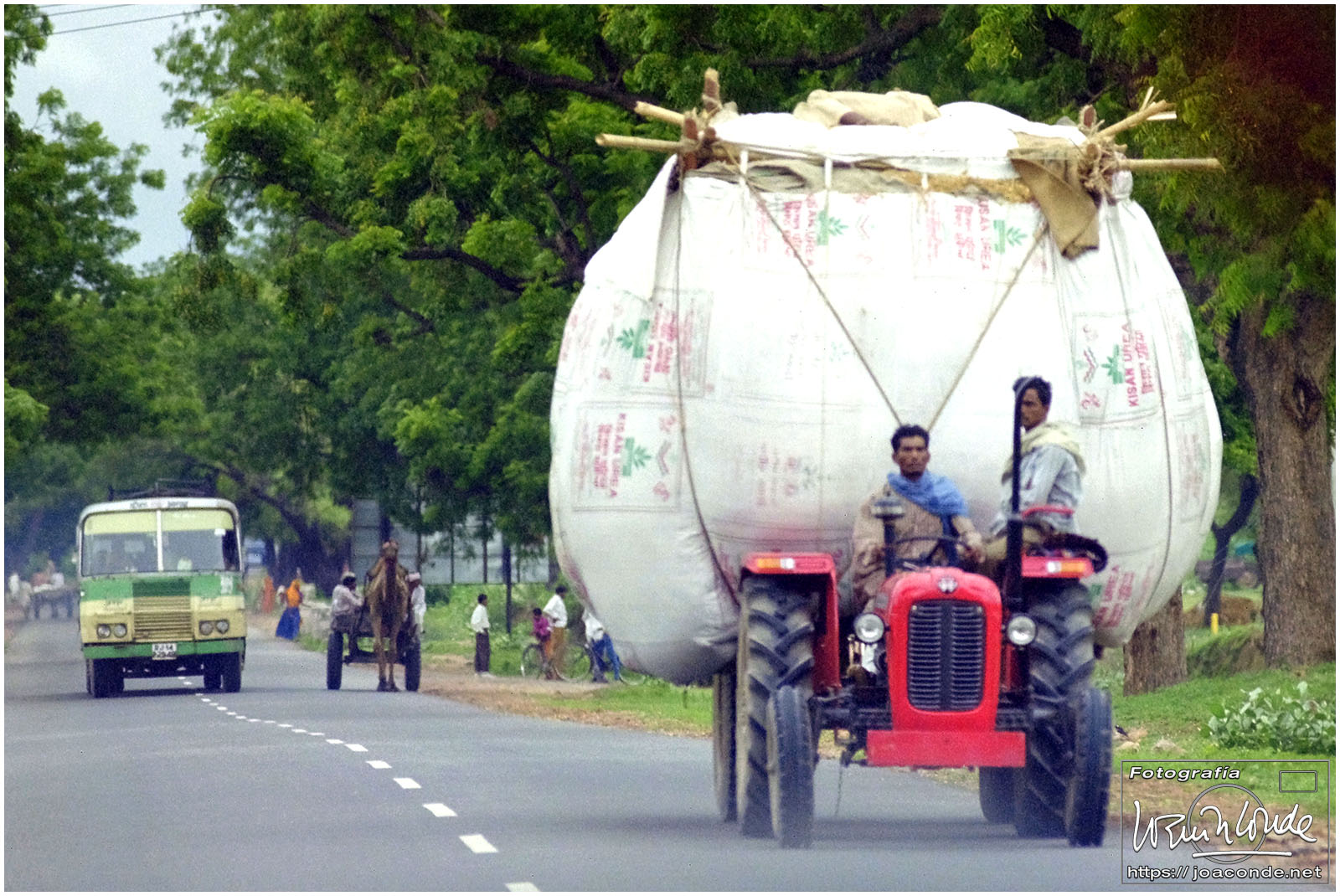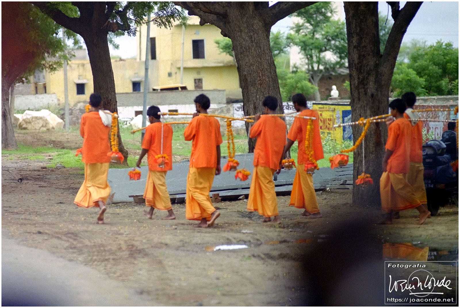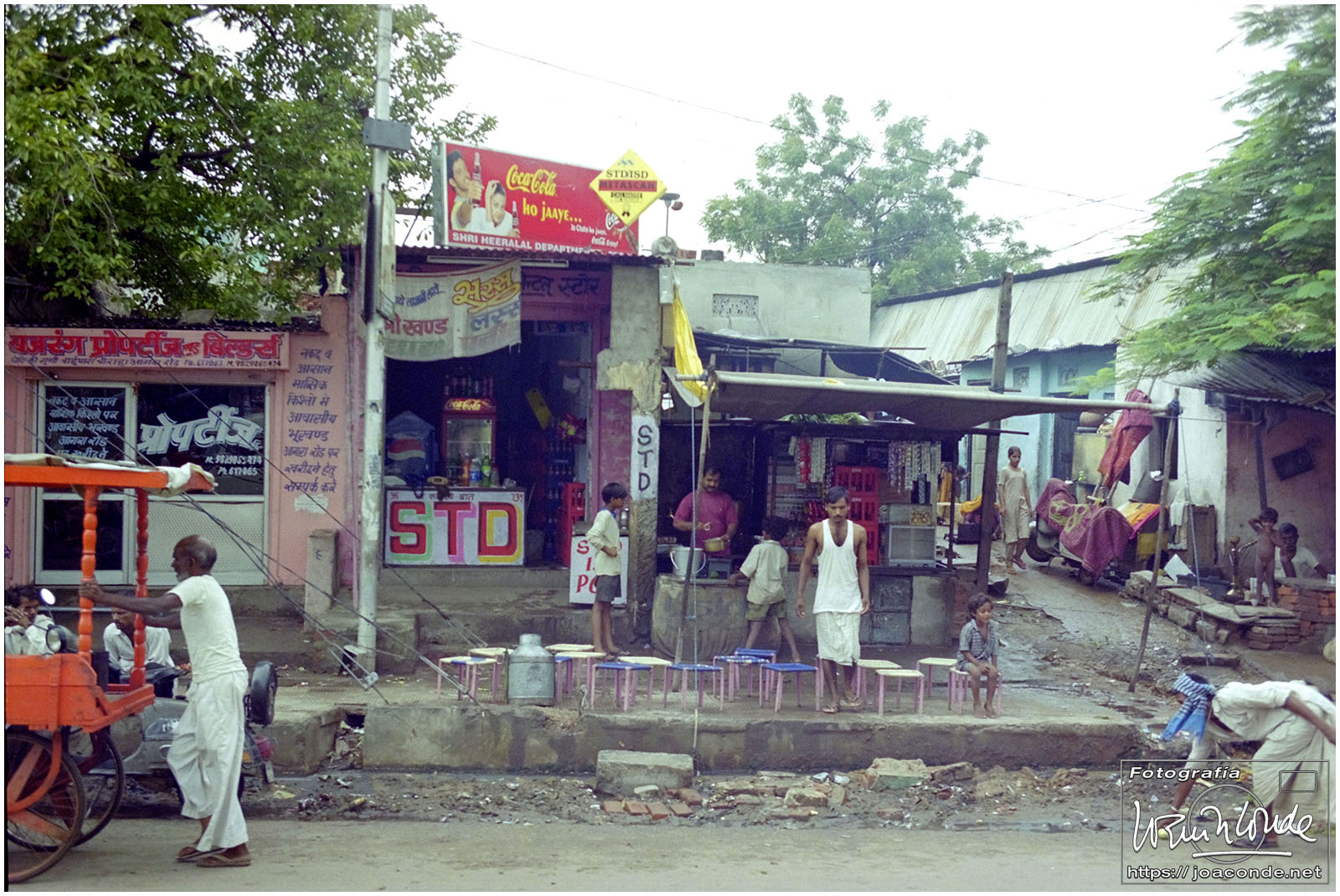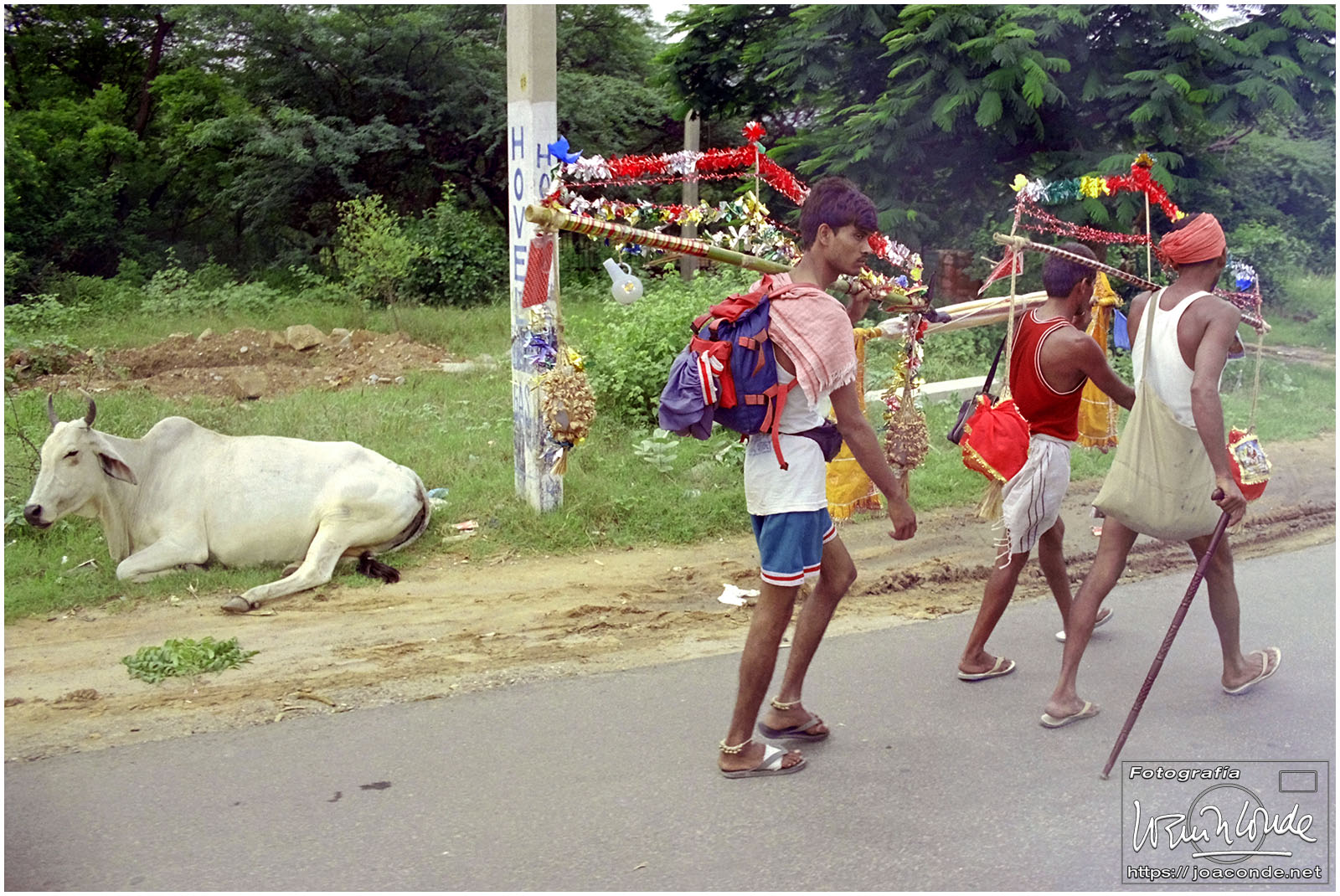 Agra estaba a unos 200 km. Salimos temprano y no solté la cámara por el camino, es que lo que estaba viendo no tenía precio. Mucha gente vivía a la intemperie, bajo unos plásticos; se les veía felices. Además se ahorrarían hipotecas y facturas… ¡qué poco hacía falta para vivir! Otro espectáculo, los bares de carretera. Y peregrinos, miles de jóvenes vestidos de naranja trayendo o llevando agua del Ganges en vasijas que jamás podía tocar el suelo; después del viaje me enteré de más detalles. Otra historia aparte era el tráfico: ¡una locura! Vehículos sobrecargados, cuando no con ciclistas enganchados, los coches iban a su bola y siempre tocando el claxon, y cuando había un accidente, nadie acudía, ni policía ni grúa.