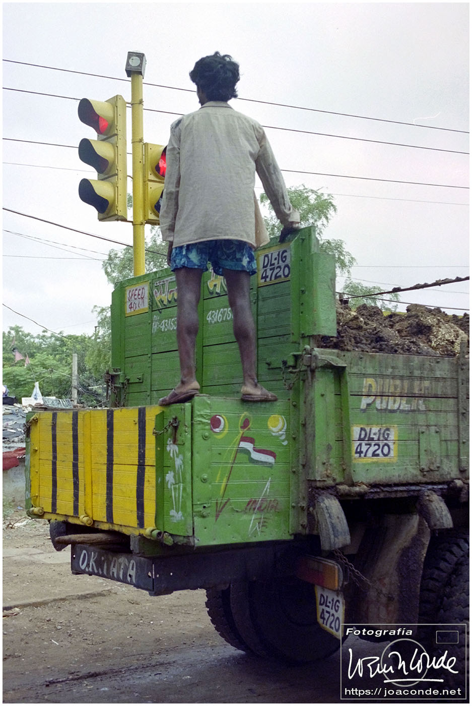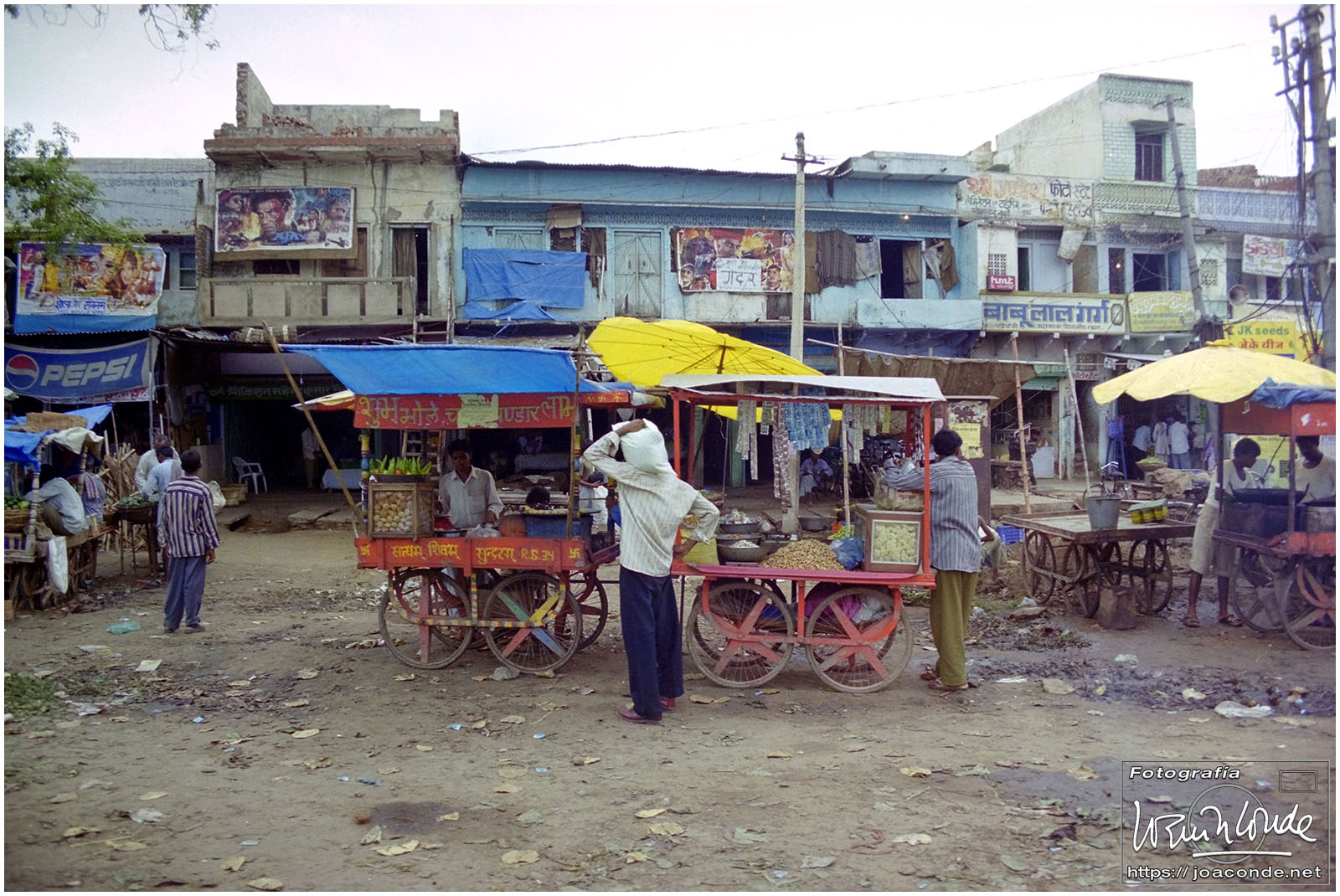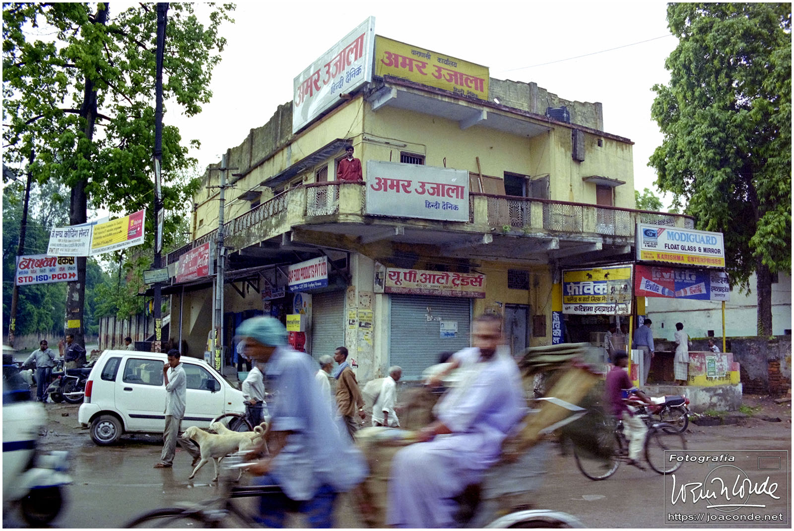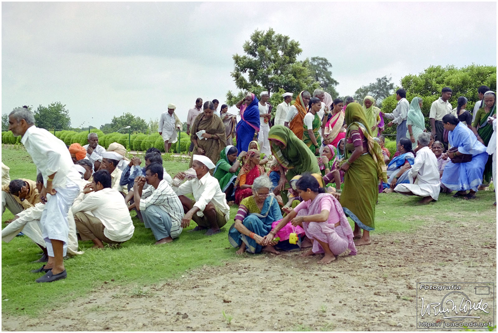 Agra estaba a unos 200 km. Salimos temprano y no solté la cámara por el camino, es que lo que estaba viendo no tenía precio. Mucha gente vivía a la intemperie, bajo unos plásticos; se les veía felices. Además se ahorrarían hipotecas y facturas… ¡qué poco hacía falta para vivir! Otro espectáculo, los bares de carretera. Y peregrinos, miles de jóvenes vestidos de naranja trayendo o llevando agua del Ganges en vasijas que jamás podía tocar el suelo; después del viaje me enteré de más detalles. Otra historia aparte era el tráfico: ¡una locura! Vehículos sobrecargados, cuando no con ciclistas enganchados, los coches iban a su bola y siempre tocando el claxon, y cuando había un accidente, nadie acudía, ni policía ni grúa.