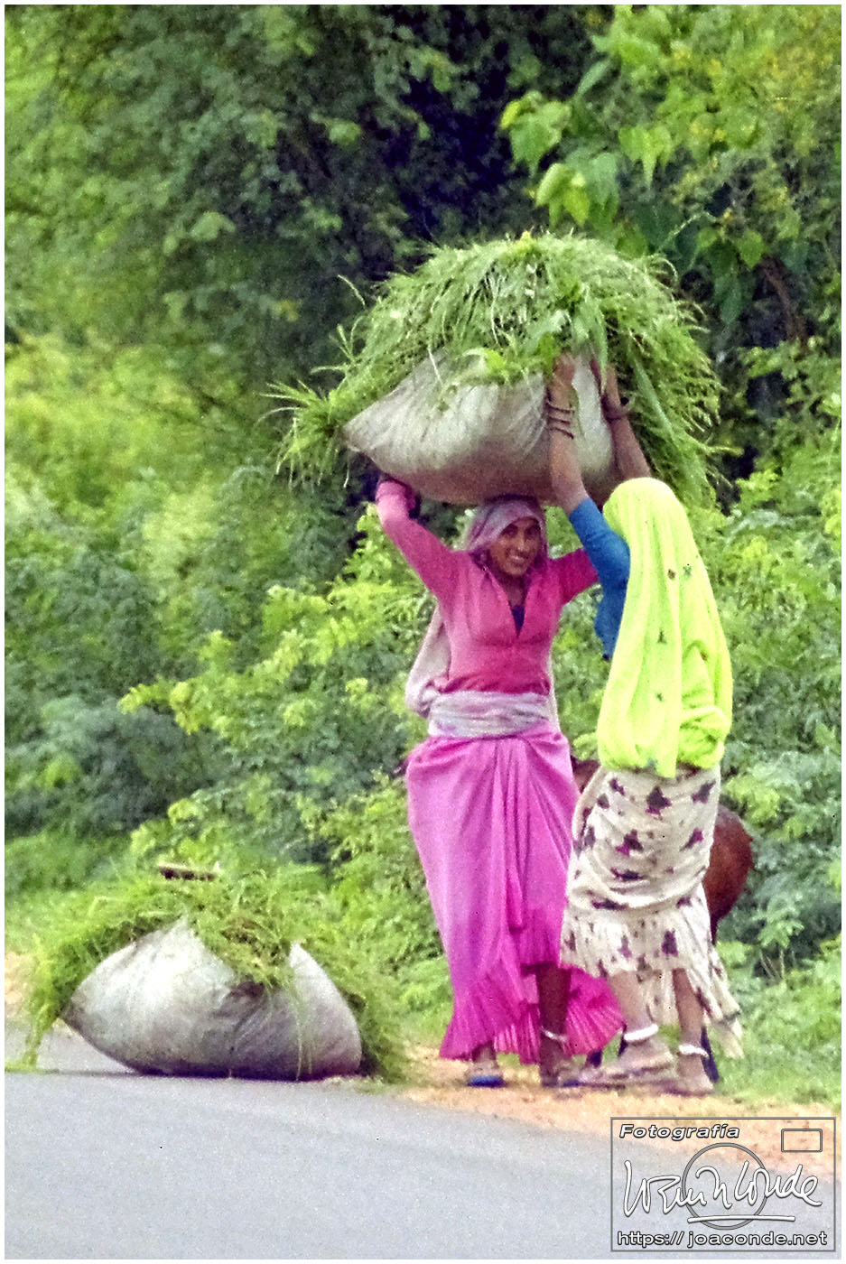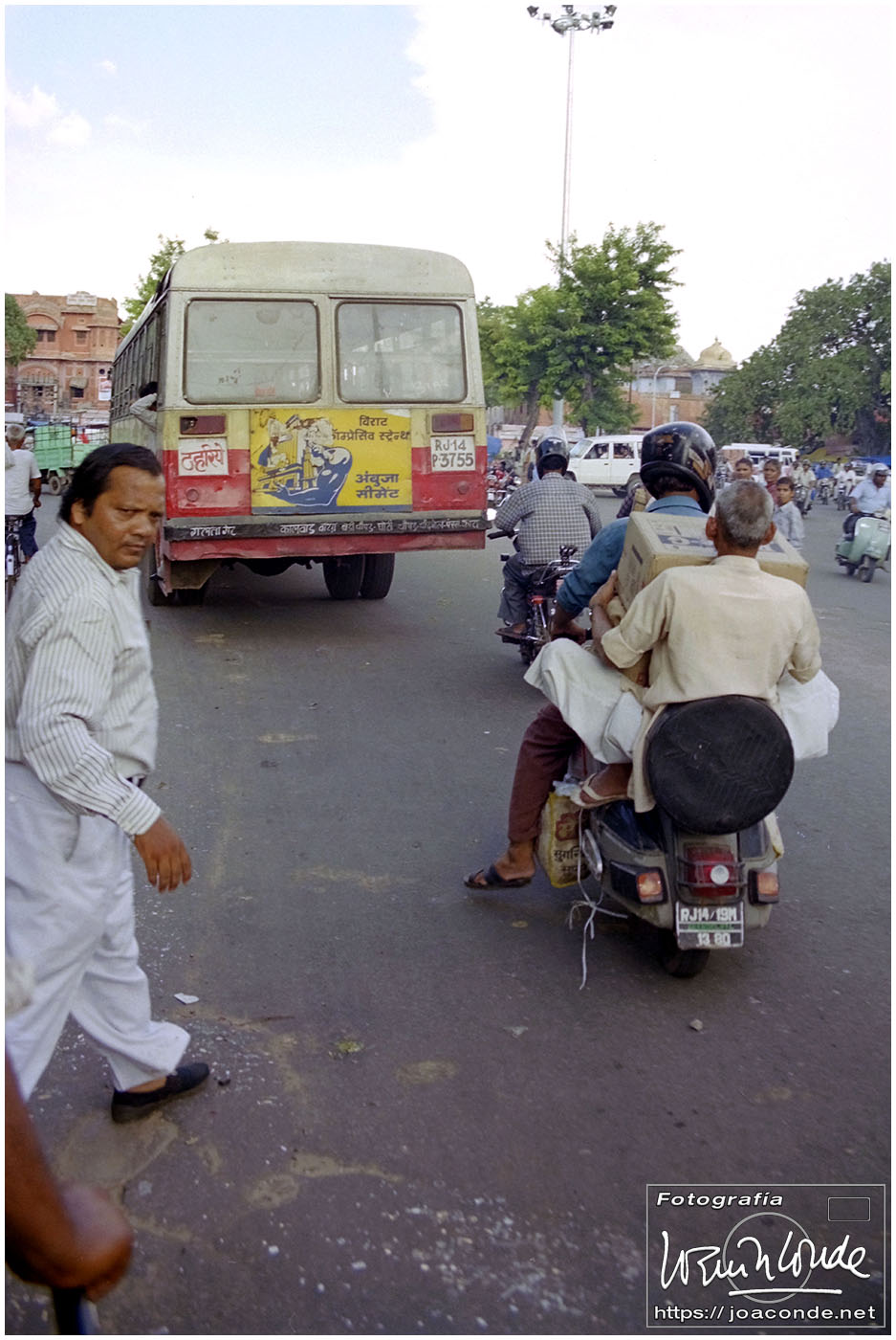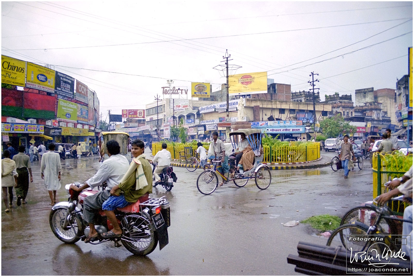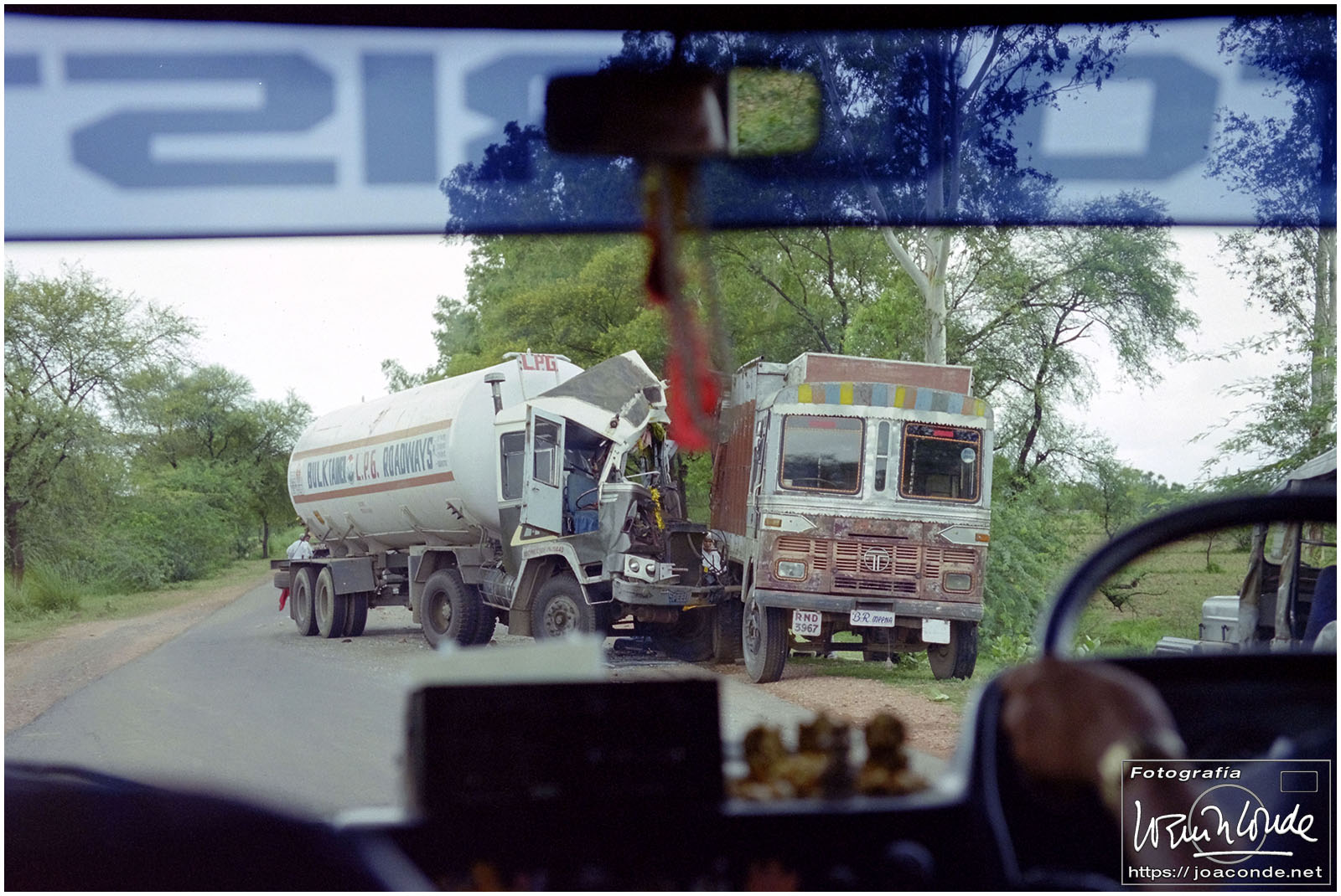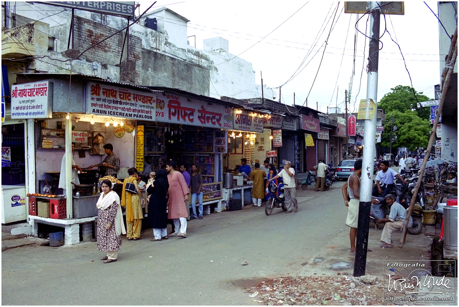 Agra estaba a unos 200 km. Salimos temprano y no solté la cámara por el camino, es que lo que estaba viendo no tenía precio. Mucha gente vivía a la intemperie, bajo unos plásticos; se les veía felices. Además se ahorrarían hipotecas y facturas… ¡qué poco hacía falta para vivir! Otro espectáculo, los bares de carretera. Y peregrinos, miles de jóvenes vestidos de naranja trayendo o llevando agua del Ganges en vasijas que jamás podía tocar el suelo; después del viaje me enteré de más detalles. Otra historia aparte era el tráfico: ¡una locura! Vehículos sobrecargados, cuando no con ciclistas enganchados, los coches iban a su bola y siempre tocando el claxon, y cuando había un accidente, nadie acudía, ni policía ni grúa.
