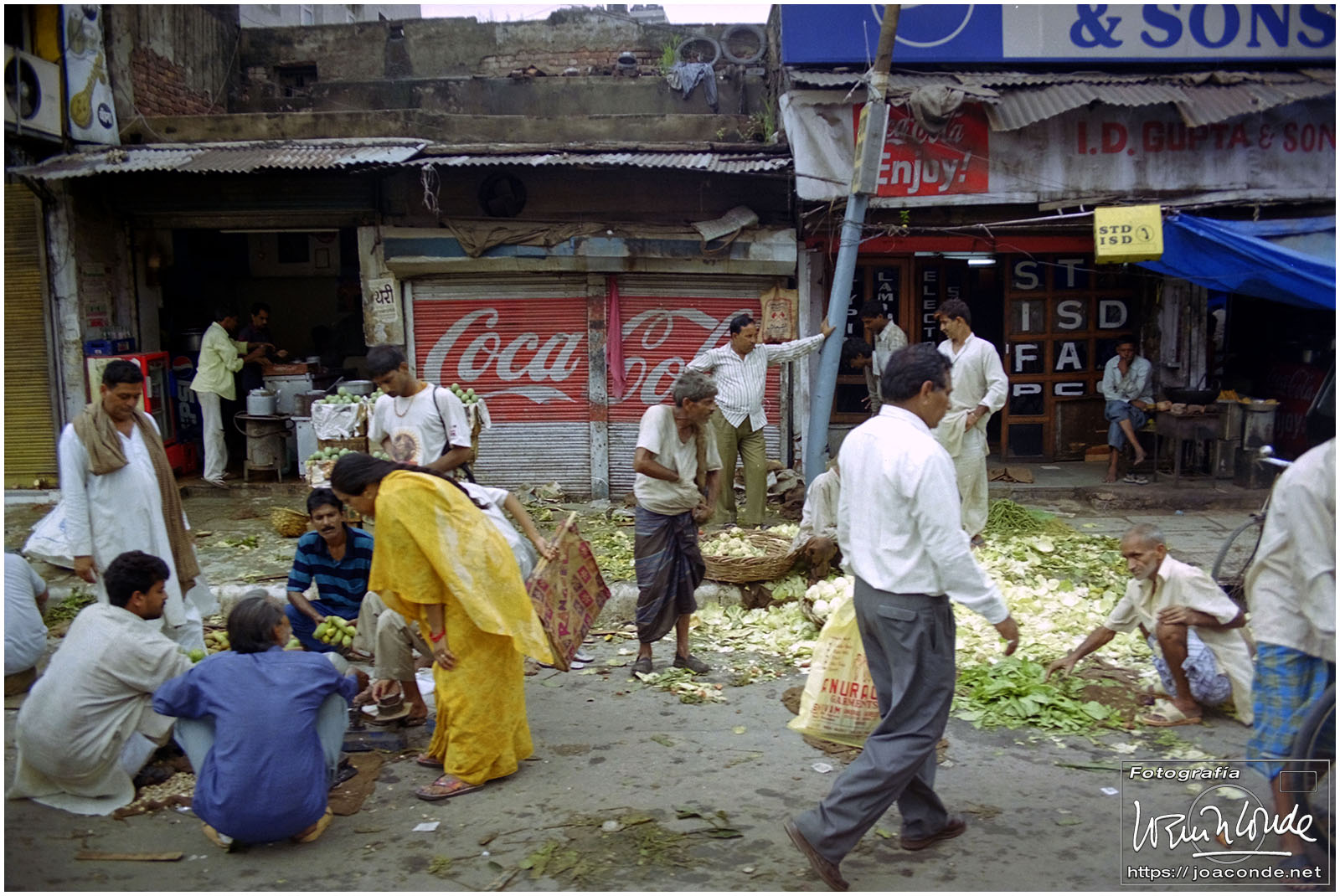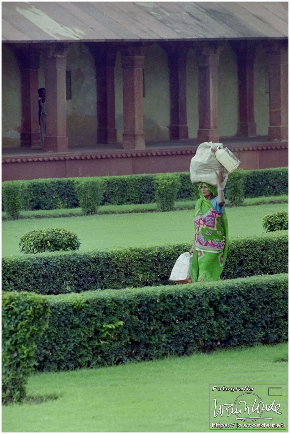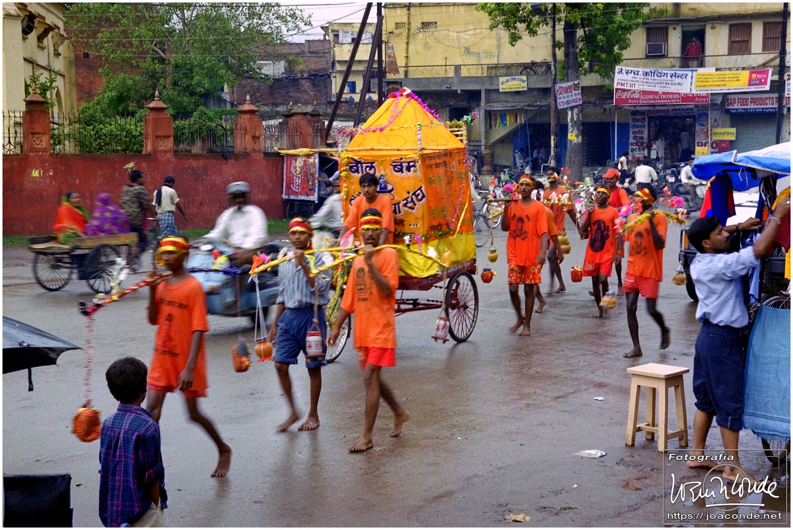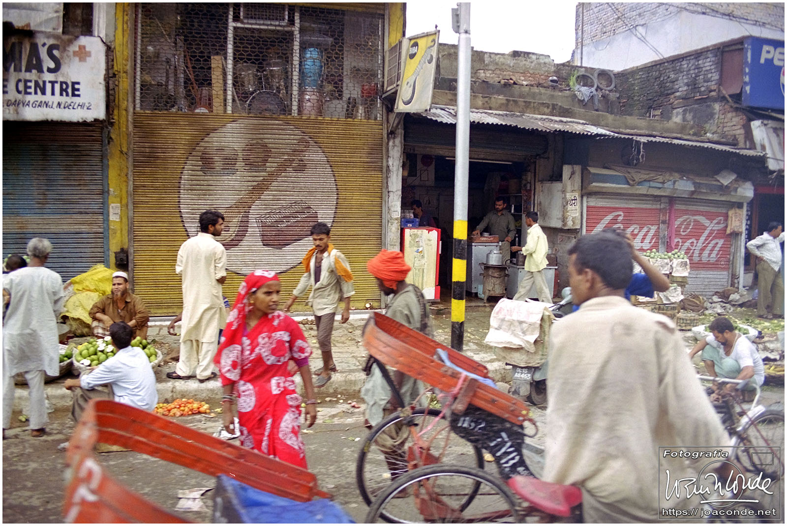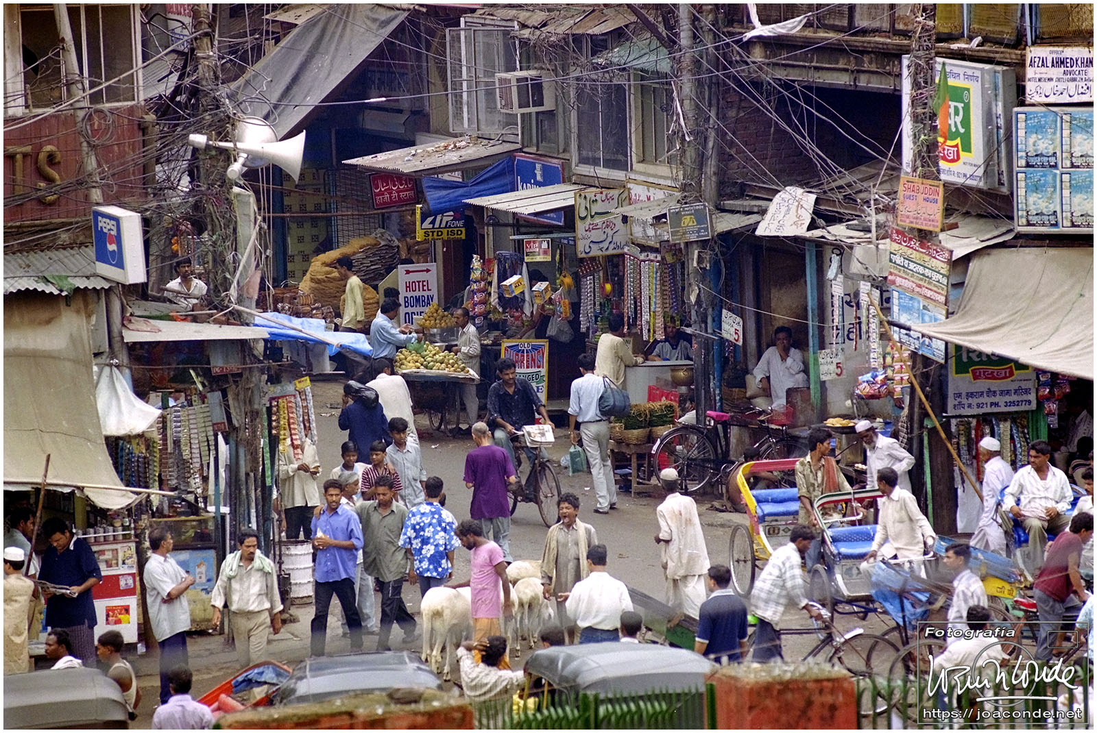 Agra estaba a unos 200 km. Salimos temprano y no solté la cámara por el camino, es que lo que estaba viendo no tenía precio. Mucha gente vivía a la intemperie, bajo unos plásticos; se les veía felices. Además se ahorrarían hipotecas y facturas… ¡qué poco hacía falta para vivir! Otro espectáculo, los bares de carretera. Y peregrinos, miles de jóvenes vestidos de naranja trayendo o llevando agua del Ganges en vasijas que jamás podía tocar el suelo; después del viaje me enteré de más detalles. Otra historia aparte era el tráfico: ¡una locura! Vehículos sobrecargados, cuando no con ciclistas enganchados, los coches iban a su bola y siempre tocando el claxon, y cuando había un accidente, nadie acudía, ni policía ni grúa.
