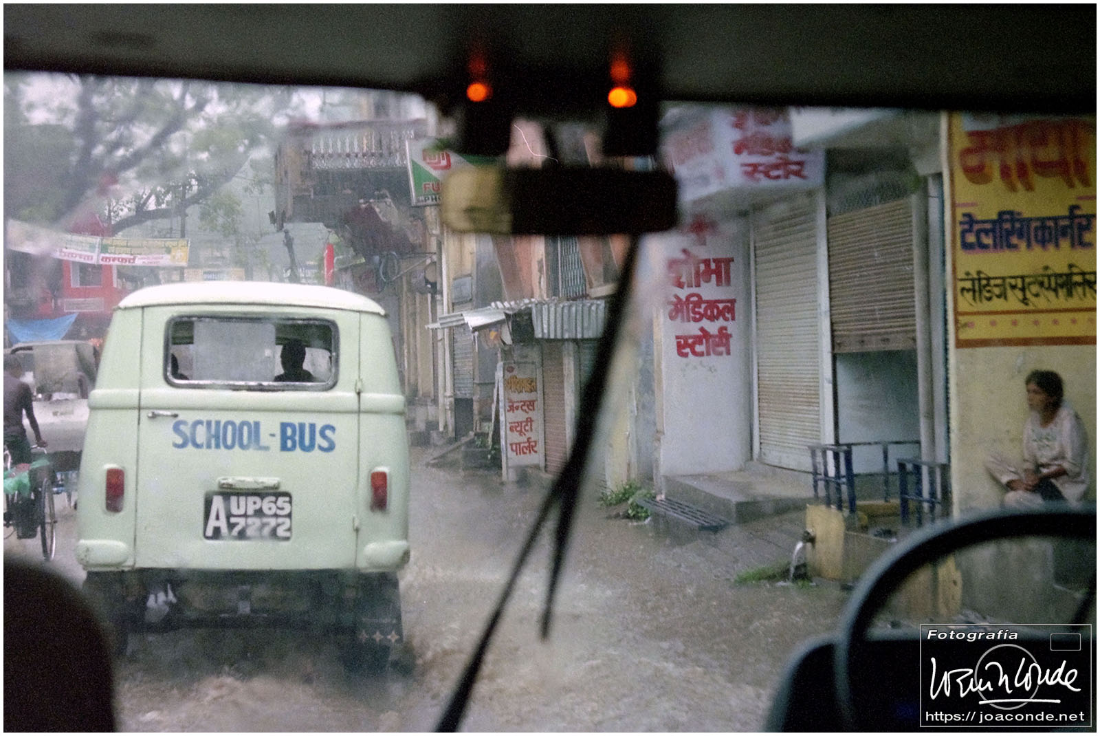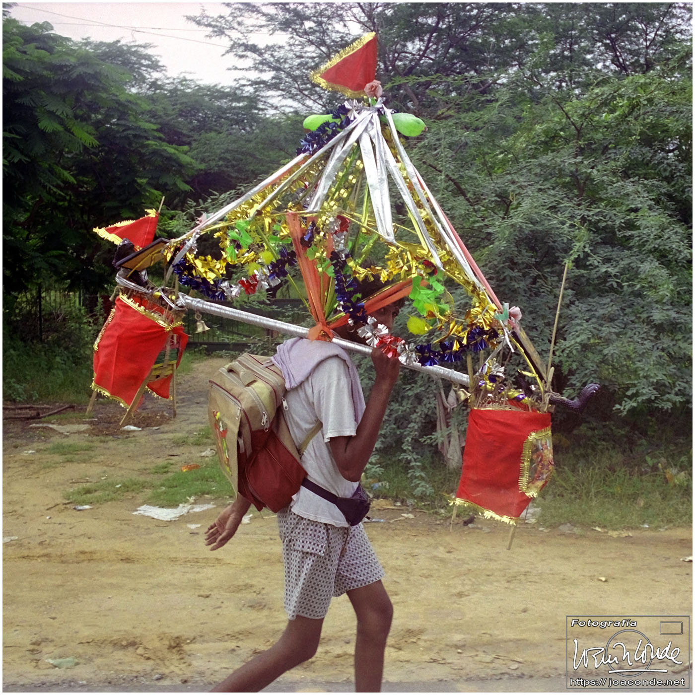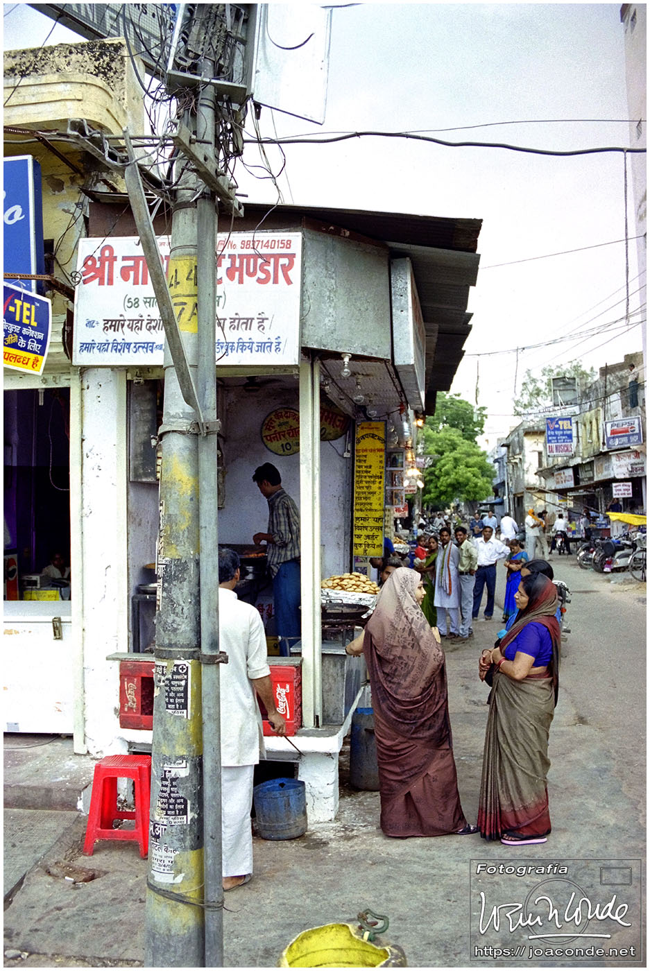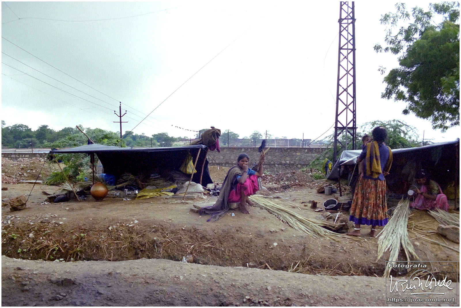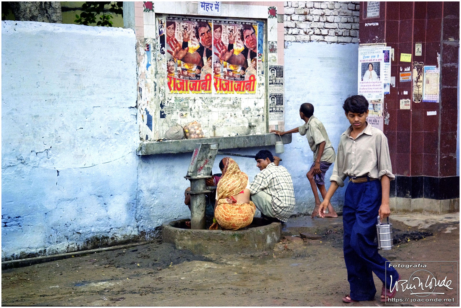 Agra estaba a unos 200 km. Salimos temprano y no solté la cámara por el camino, es que lo que estaba viendo no tenía precio. Mucha gente vivía a la intemperie, bajo unos plásticos; se les veía felices. Además se ahorrarían hipotecas y facturas… ¡qué poco hacía falta para vivir! Otro espectáculo, los bares de carretera. Y peregrinos, miles de jóvenes vestidos de naranja trayendo o llevando agua del Ganges en vasijas que jamás podía tocar el suelo; después del viaje me enteré de más detalles. Otra historia aparte era el tráfico: ¡una locura! Vehículos sobrecargados, cuando no con ciclistas enganchados, los coches iban a su bola y siempre tocando el claxon, y cuando había un accidente, nadie acudía, ni policía ni grúa.