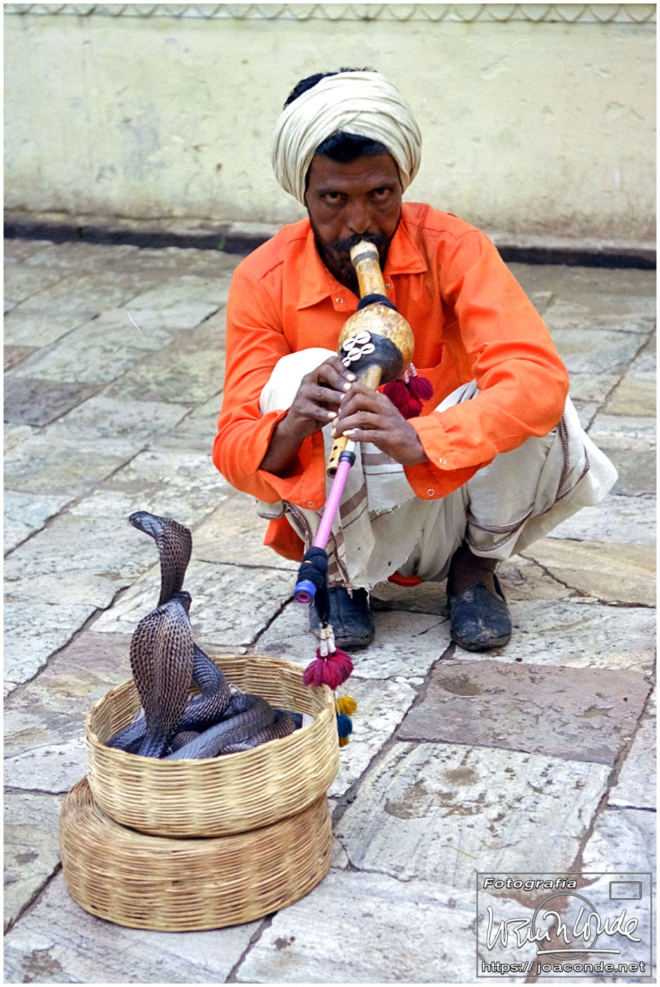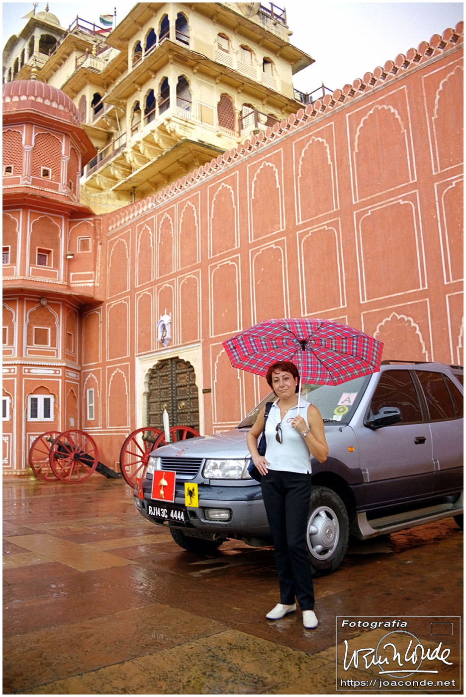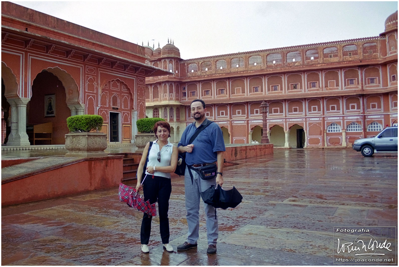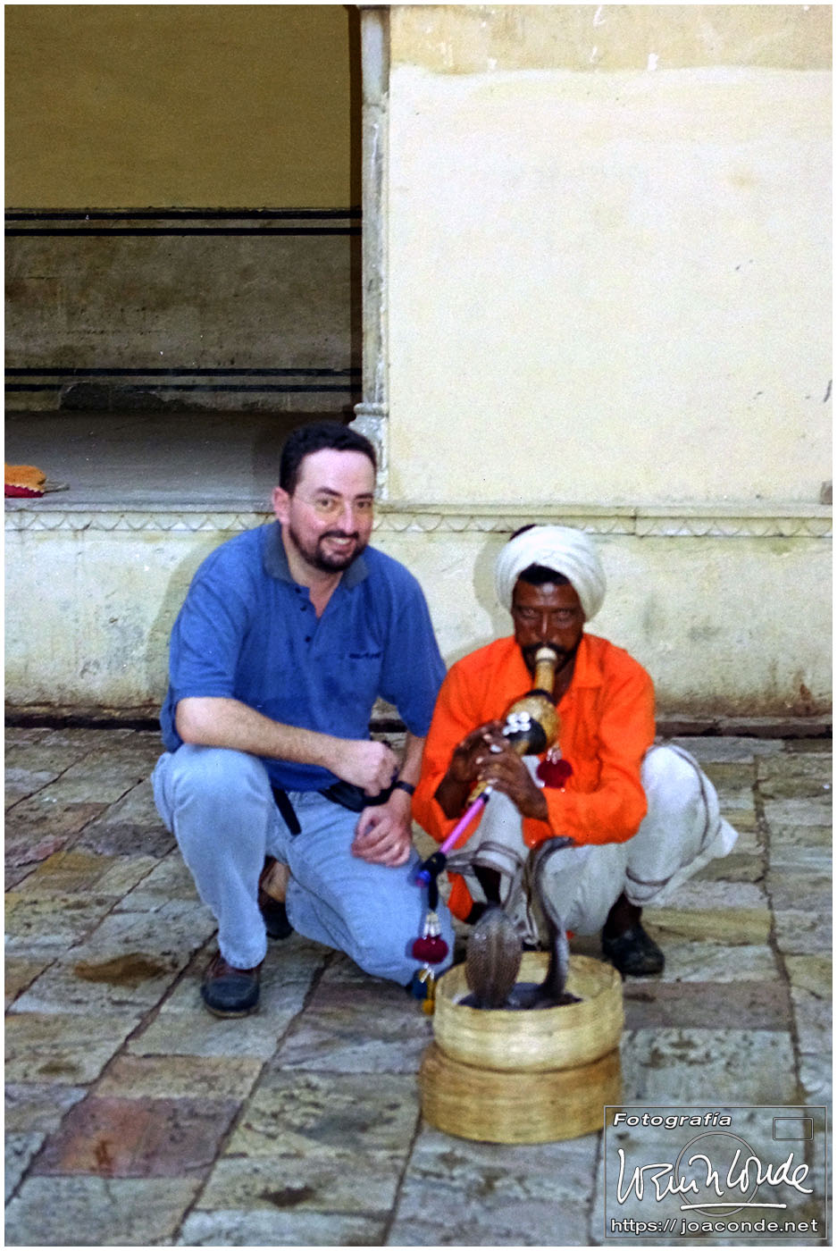 Por la tarde, después de comer —en la India todo lo cocinaban muy, pero que muy spicy— se puso a diluviar. Estábamos en el Observatorio Solar y solo pude hacer una foto de la torre. Entonces entramos en el Palacio de Jaipur, parte de la residencia del Marajá que se podía visitar. Después echamos un rato con un encantador de serpientes —a ver si le cogía el truco— y fuimos a un taller donde engastaban joyas. Los zafiros de Cachemira estaban a muy buen precio.