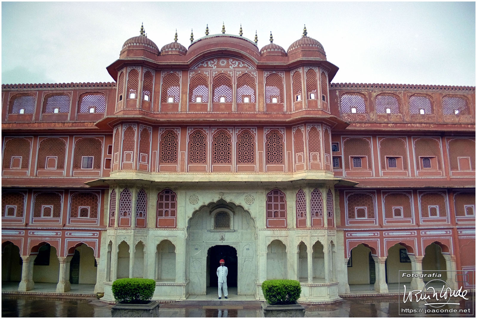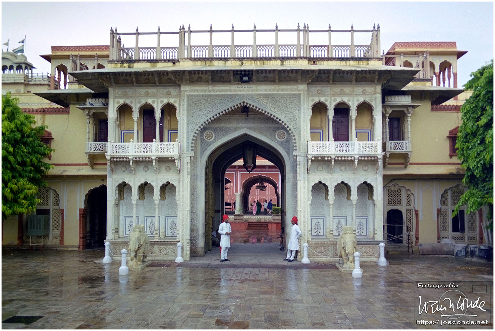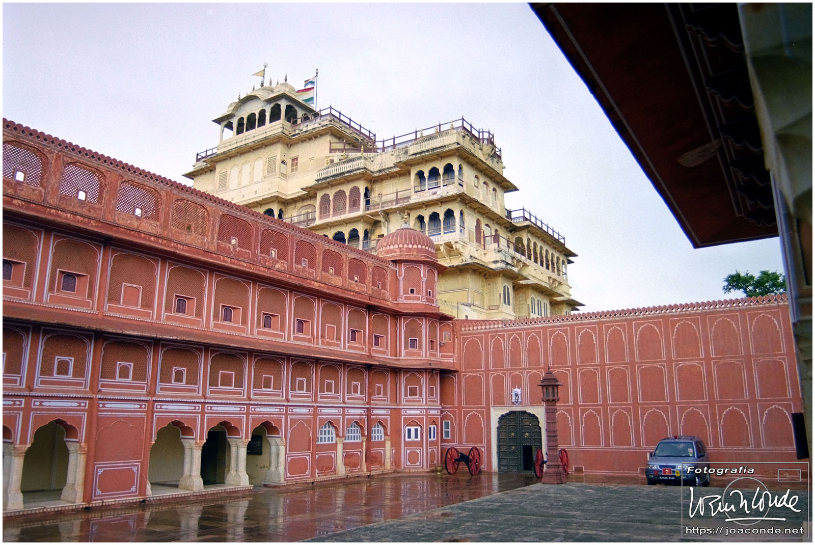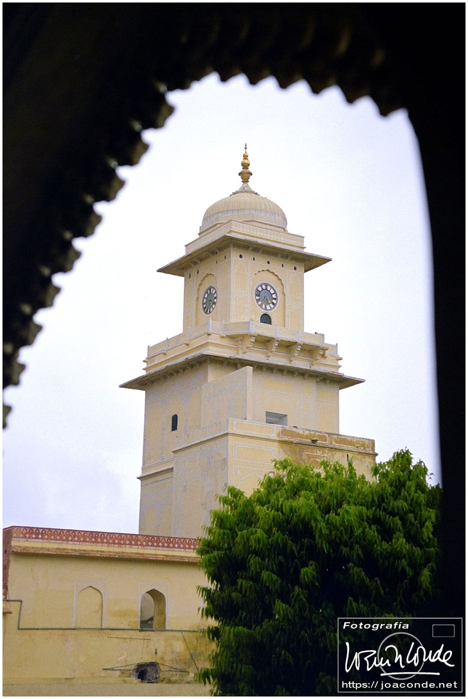 Por la tarde, después de comer —en la India todo lo cocinaban muy, pero que muy spicy— se puso a diluviar. Estábamos en el Observatorio Solar y solo pude hacer una foto de la torre. Entonces entramos en el Palacio de Jaipur, parte de la residencia del Marajá que se podía visitar. Después echamos un rato con un encantador de serpientes —a ver si le cogía el truco— y fuimos a un taller donde engastaban joyas. Los zafiros de Cachemira estaban a muy buen precio.