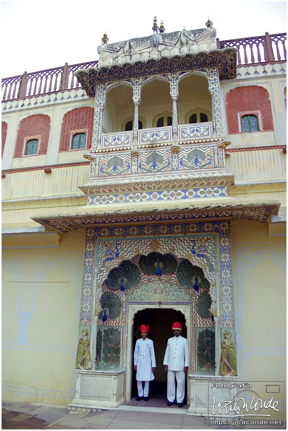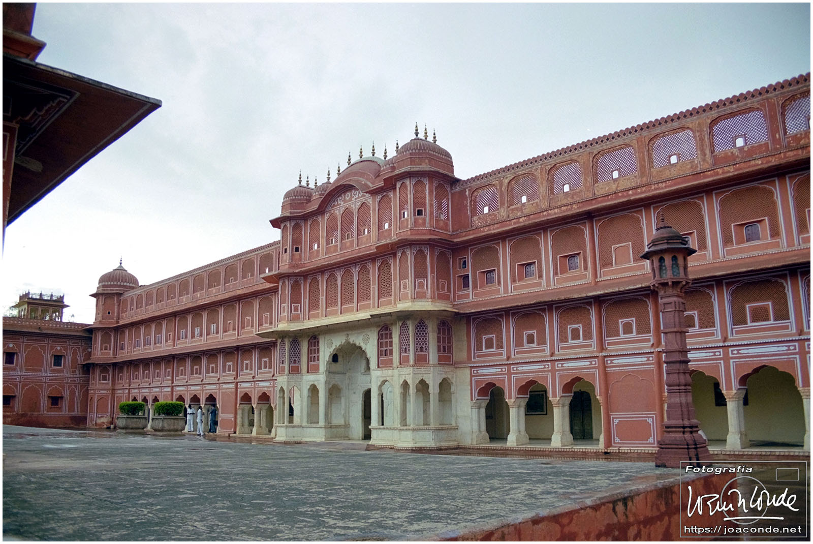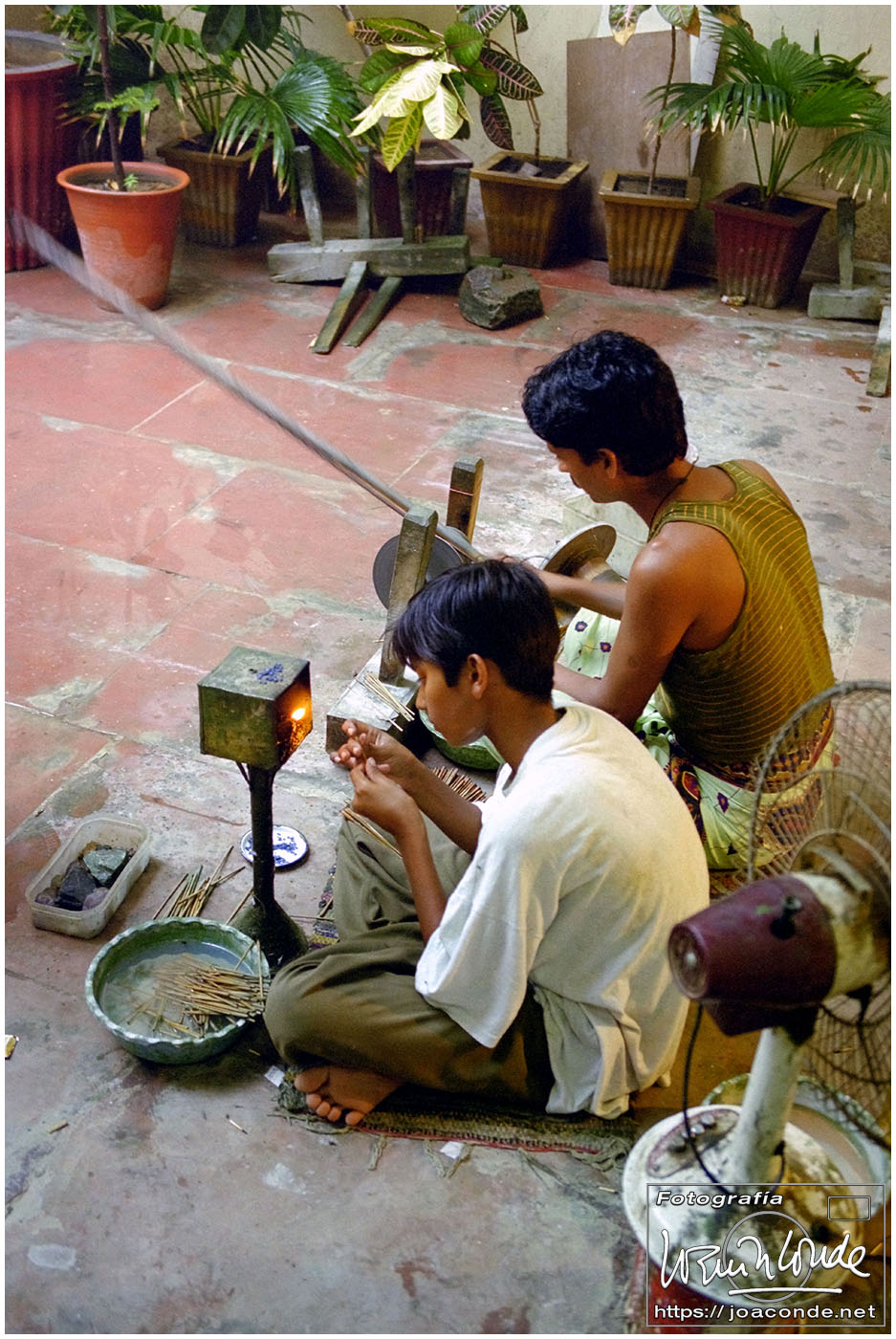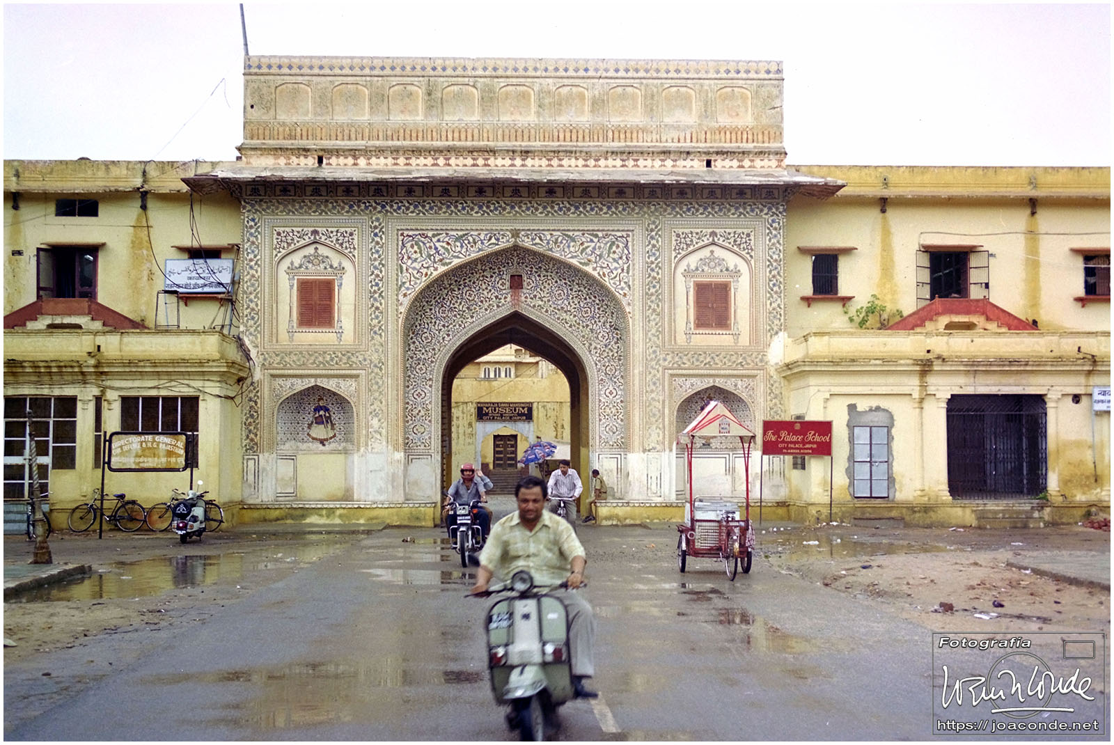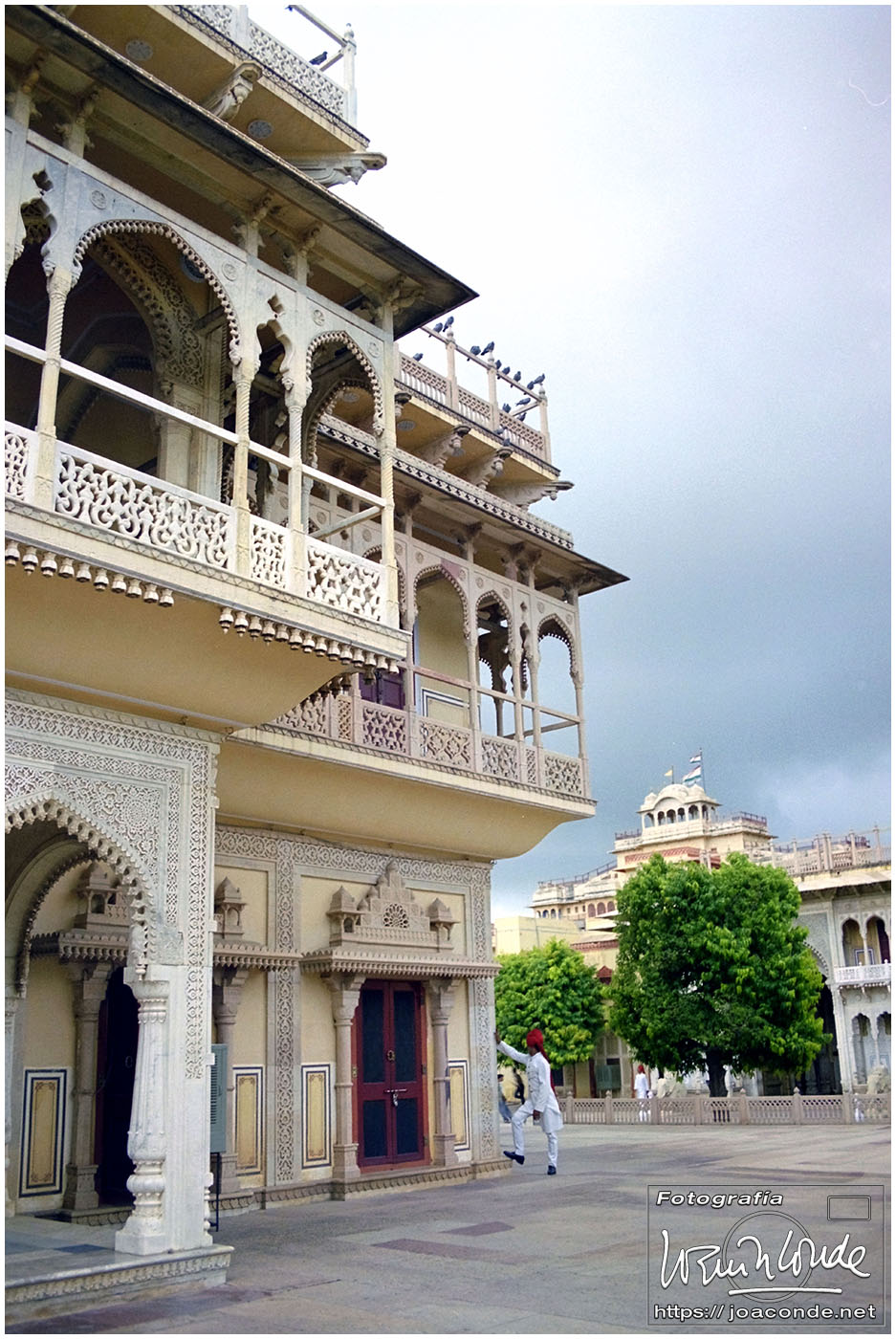 Por la tarde, después de comer —en la India todo lo cocinaban muy, pero que muy spicy— se puso a diluviar. Estábamos en el Observatorio Solar y solo pude hacer una foto de la torre. Entonces entramos en el Palacio de Jaipur, parte de la residencia del Marajá que se podía visitar. Después echamos un rato con un encantador de serpientes —a ver si le cogía el truco— y fuimos a un taller donde engastaban joyas. Los zafiros de Cachemira estaban a muy buen precio.