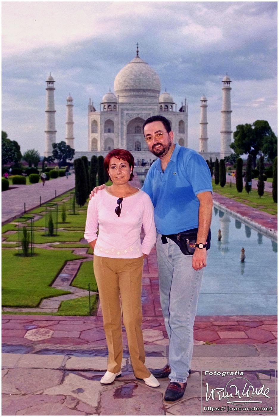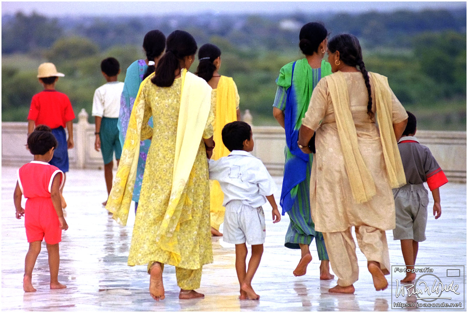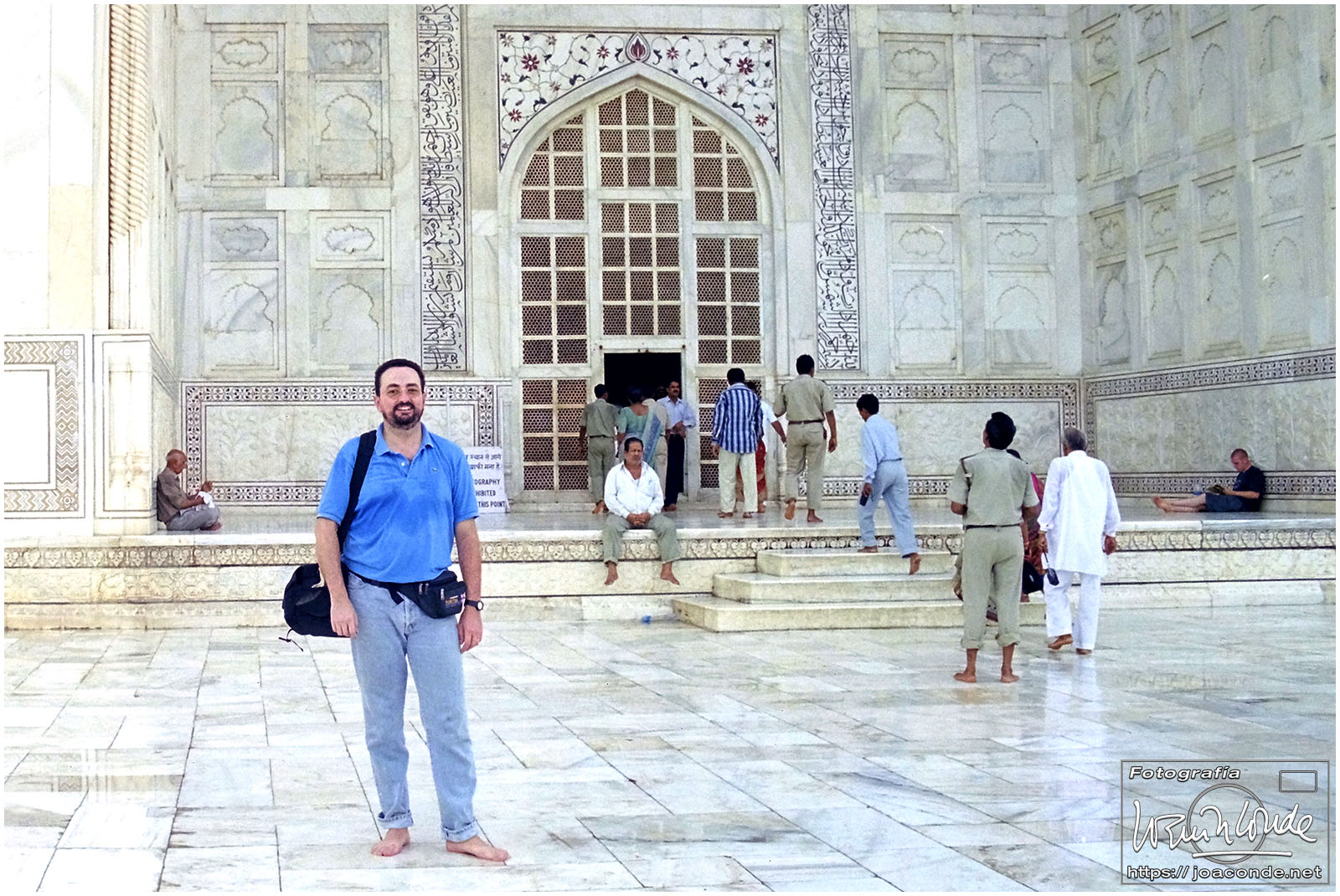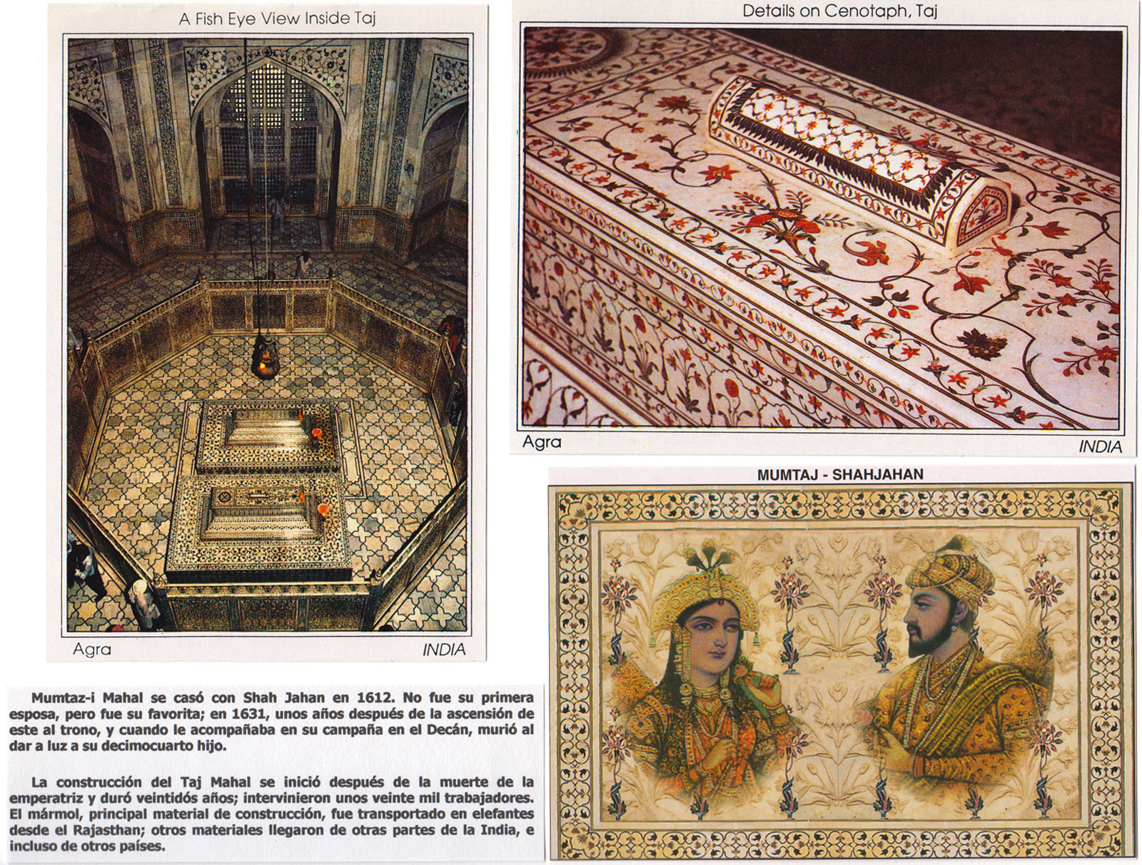 Estuvimos toda la tarde disfrutando en el Taj Mahal. Era precioso. Además, cambiaba de tonalidad según pasaban las nubes o descendía el sol. Las dos mezquitas, situadas a ambos lados de la explanada, eran menos vistosas al ser de arenisca roja. Nos acercamos y subimos las escalinatas; había que quitarse los zapatos. Pisar aquel mármol cálido y húmedo fue una de las sensaciones más intensas que había vivido. Descubrimos las incrustaciones de piedras semipreciosas en el mármol, finamente tallado. El interior era muy oscuro y no se podían hacer fotos; al salir compré las postales que cierran la galería.