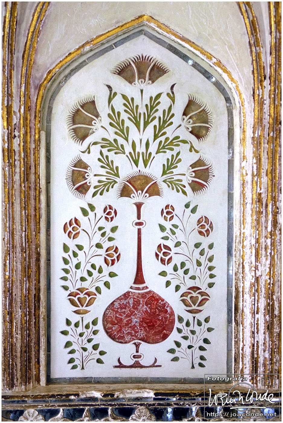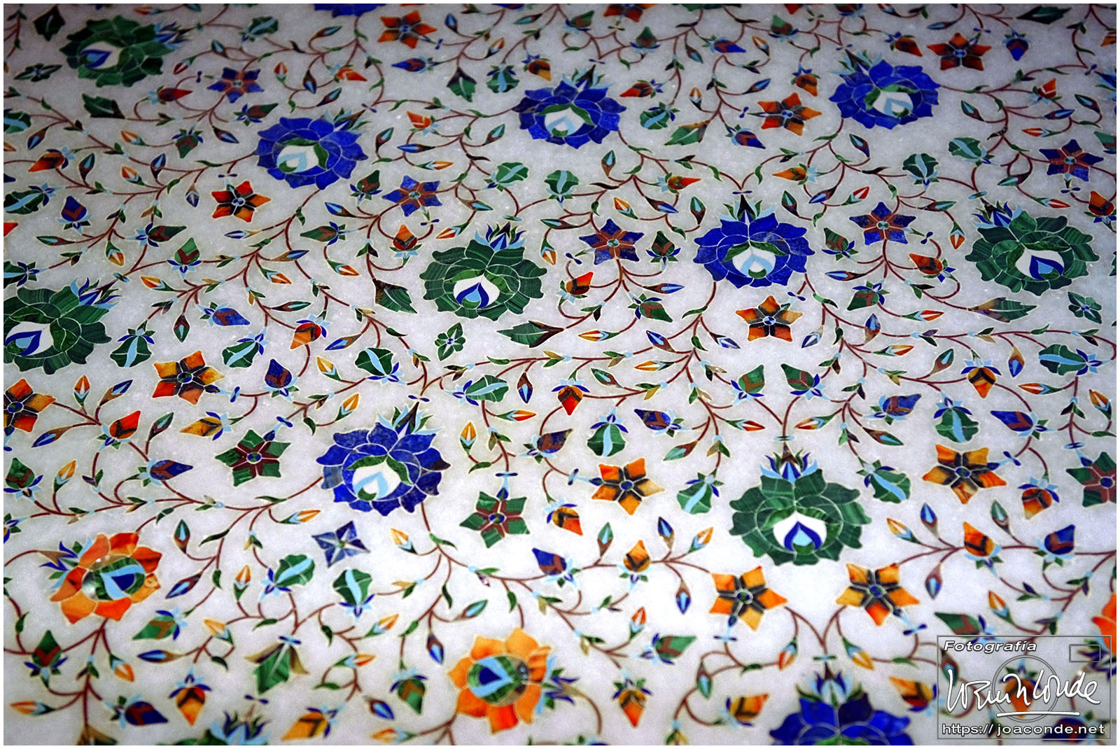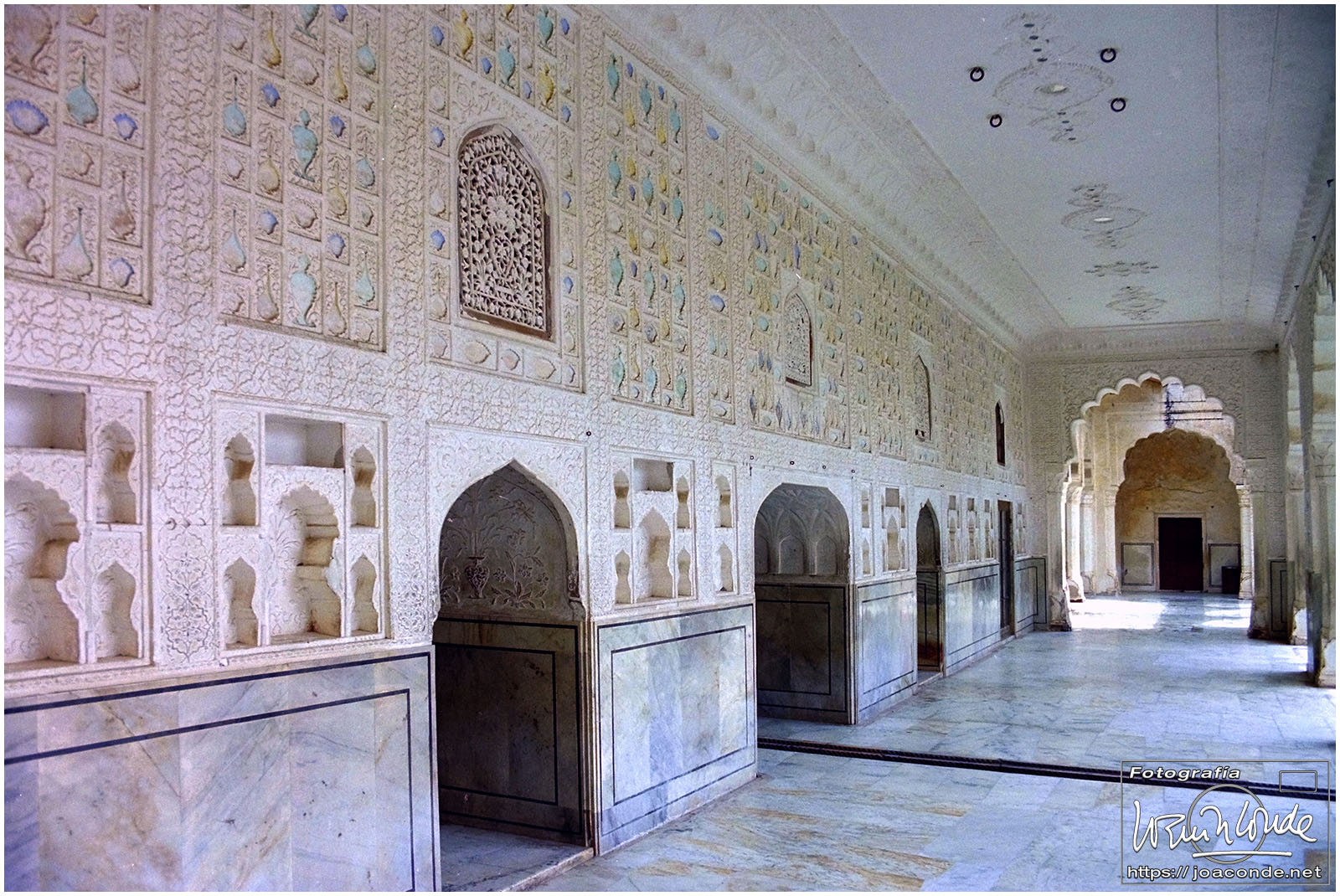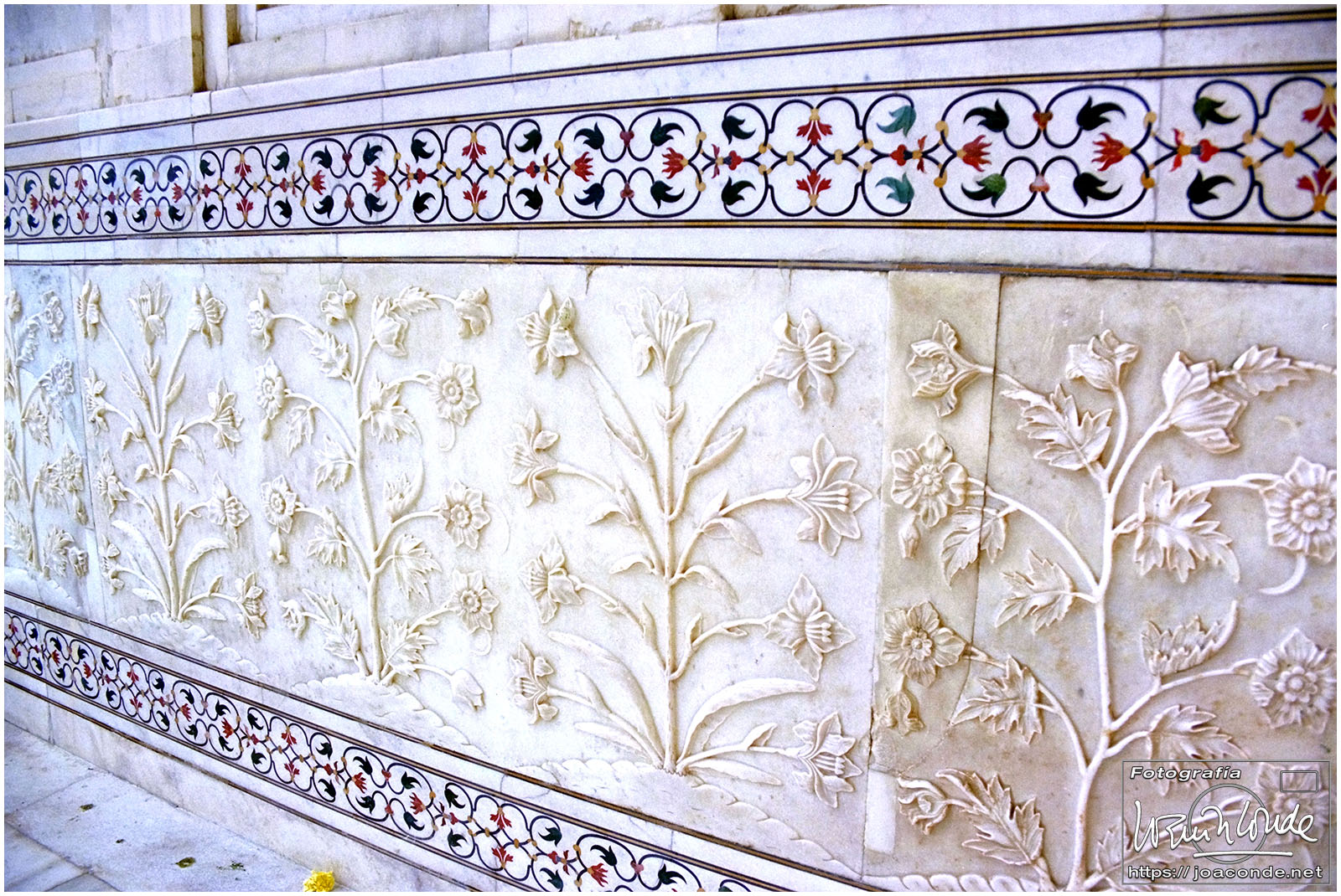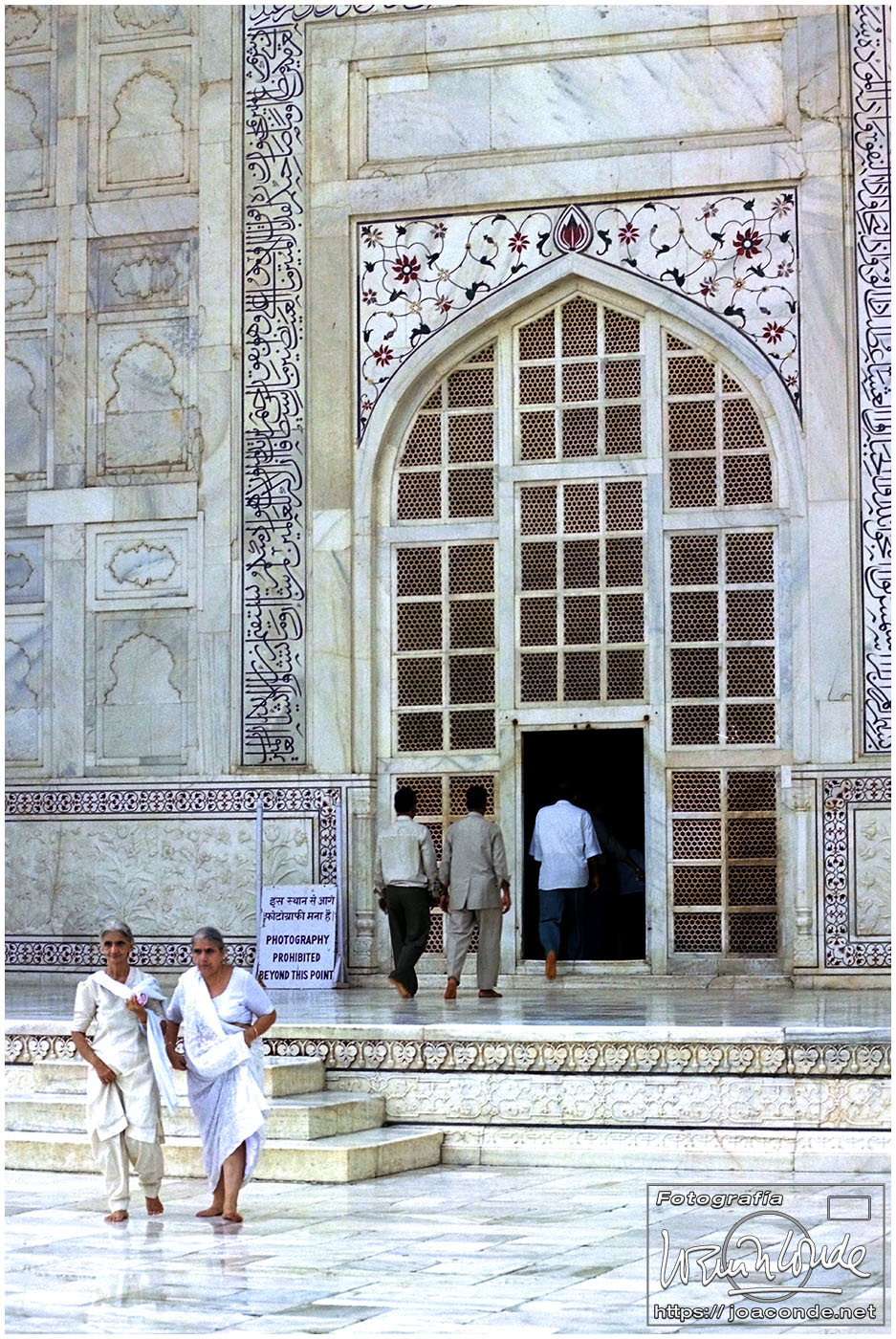 Estuvimos toda la tarde disfrutando en el Taj Mahal. Era precioso. Además, cambiaba de tonalidad según pasaban las nubes o descendía el sol. Las dos mezquitas, situadas a ambos lados de la explanada, eran menos vistosas al ser de arenisca roja. Nos acercamos y subimos las escalinatas; había que quitarse los zapatos. Pisar aquel mármol cálido y húmedo fue una de las sensaciones más intensas que había vivido. Descubrimos las incrustaciones de piedras semipreciosas en el mármol, finamente tallado. El interior era muy oscuro y no se podían hacer fotos; al salir compré las postales que cierran la galería.