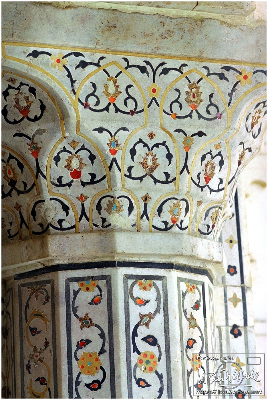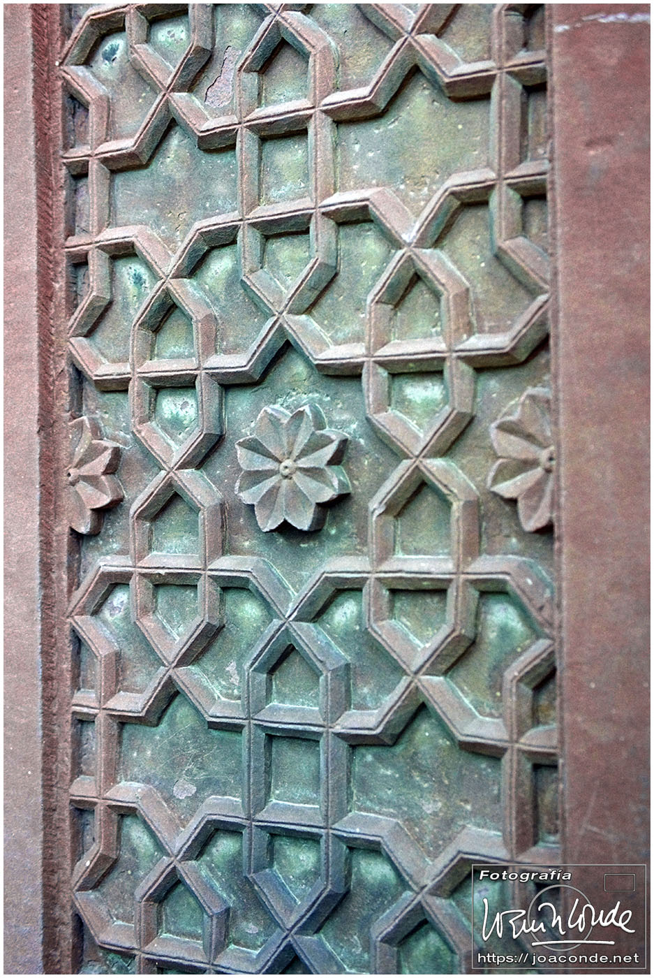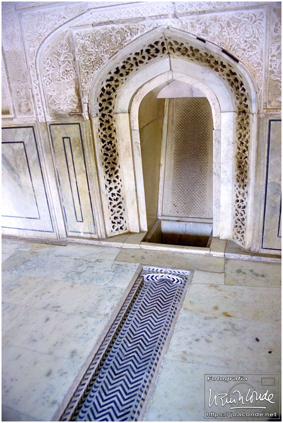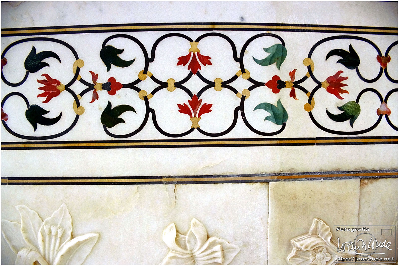 Estuvimos toda la tarde disfrutando en el Taj Mahal. Era precioso. Además, cambiaba de tonalidad según pasaban las nubes o descendía el sol. Las dos mezquitas, situadas a ambos lados de la explanada, eran menos vistosas al ser de arenisca roja. Nos acercamos y subimos las escalinatas; había que quitarse los zapatos. Pisar aquel mármol cálido y húmedo fue una de las sensaciones más intensas que había vivido. Descubrimos las incrustaciones de piedras semipreciosas en el mármol, finamente tallado. El interior era muy oscuro y no se podían hacer fotos; al salir compré las postales que cierran la galería.