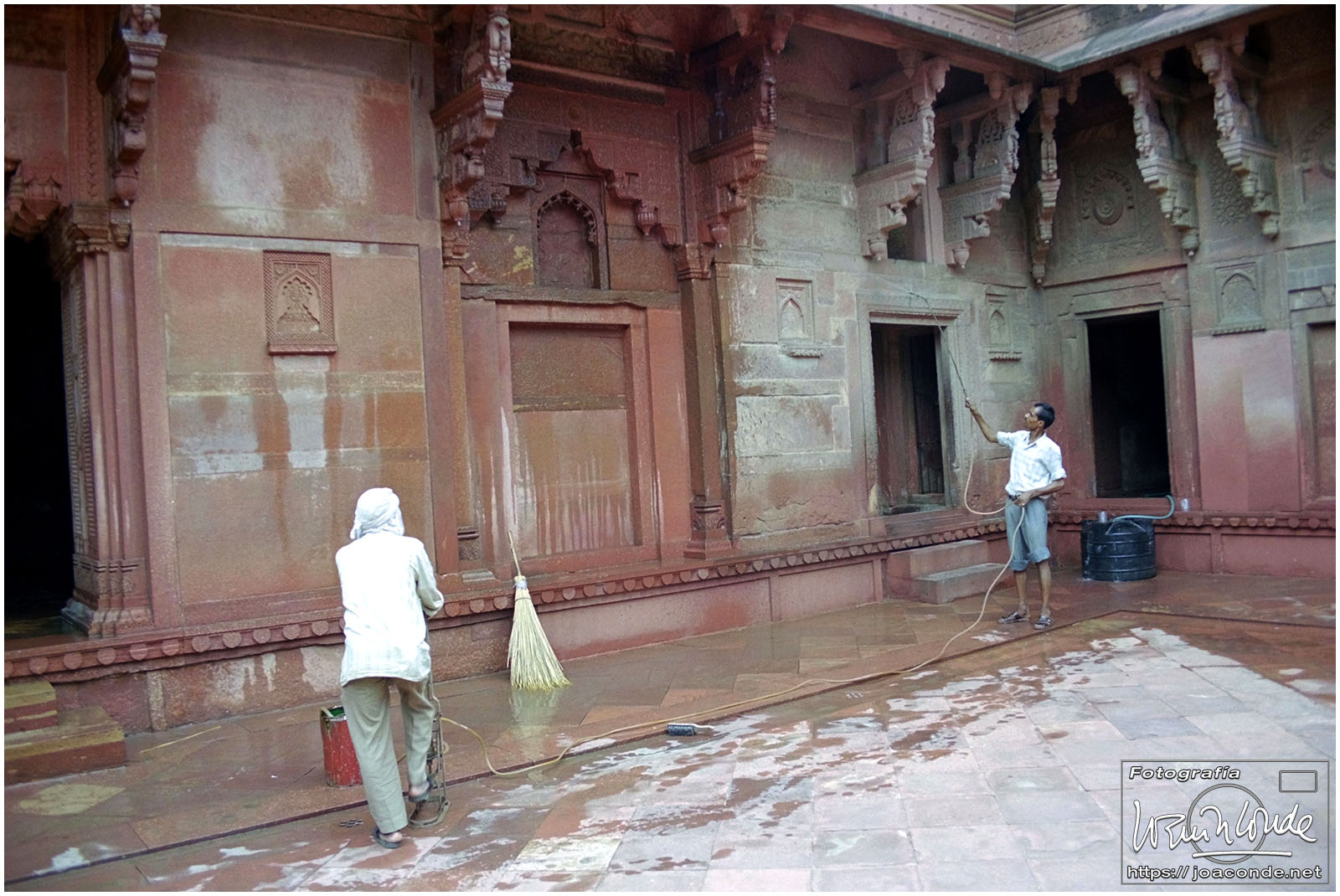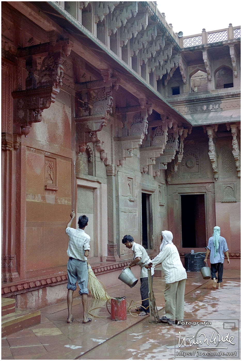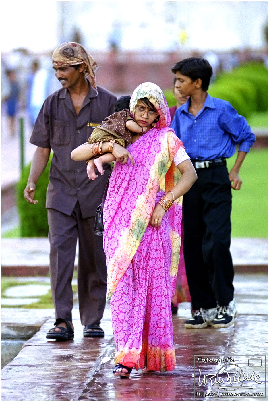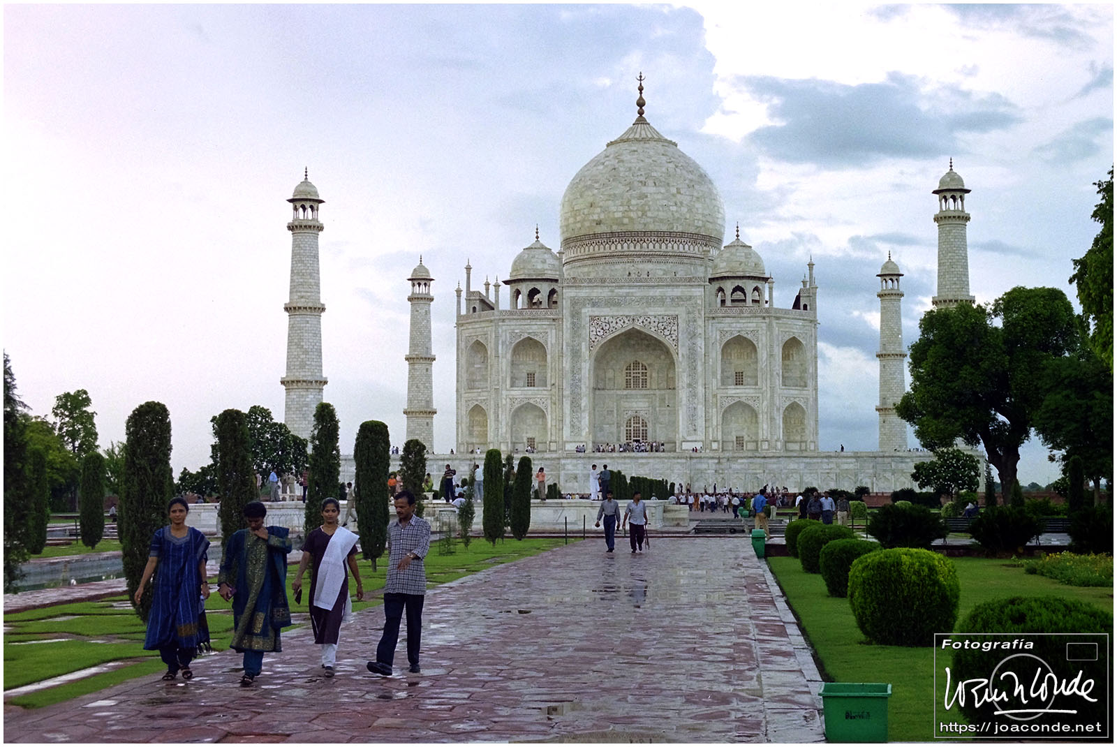 En un plis plas estábamos en Fatehpur Sikri, una ciudad fallida del s. XVI, capital del imperio mogol durante 14 años, hasta que se dieron cuenta de que no tenía agua y la abandonaron. A unos kilómetros estaba Agra y el indescriptible Taj Mahal. Tuvimos mucha suerte. El monzón se tomó un respiro, y no llovió en toda la tarde. Además, iban a cerrar el mausoleo unos días por la visita de Musharraf. Se celebraba la Cumbre de Agra, en la que no se resolvió el litigio entre India y Pakistán por la posesión de Cachemira.
