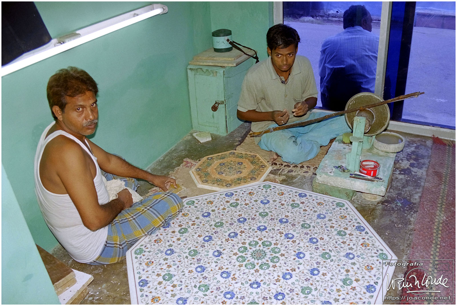 Por la tarde fuimos al taller de Oswal, un artesano que hacía maravillas con las incrustaciones en mármol. Nos enseñaron el laborioso proceso y nos encantó una mesita, que nos mandaron perfectamente embalada a casa. Después paseamos por Agra hasta que nos recogimos en el Trident; me hubiera dado un remojón en la piscina, pero ya diluviaba. En la tele hablaban en hindi de la cumbre.