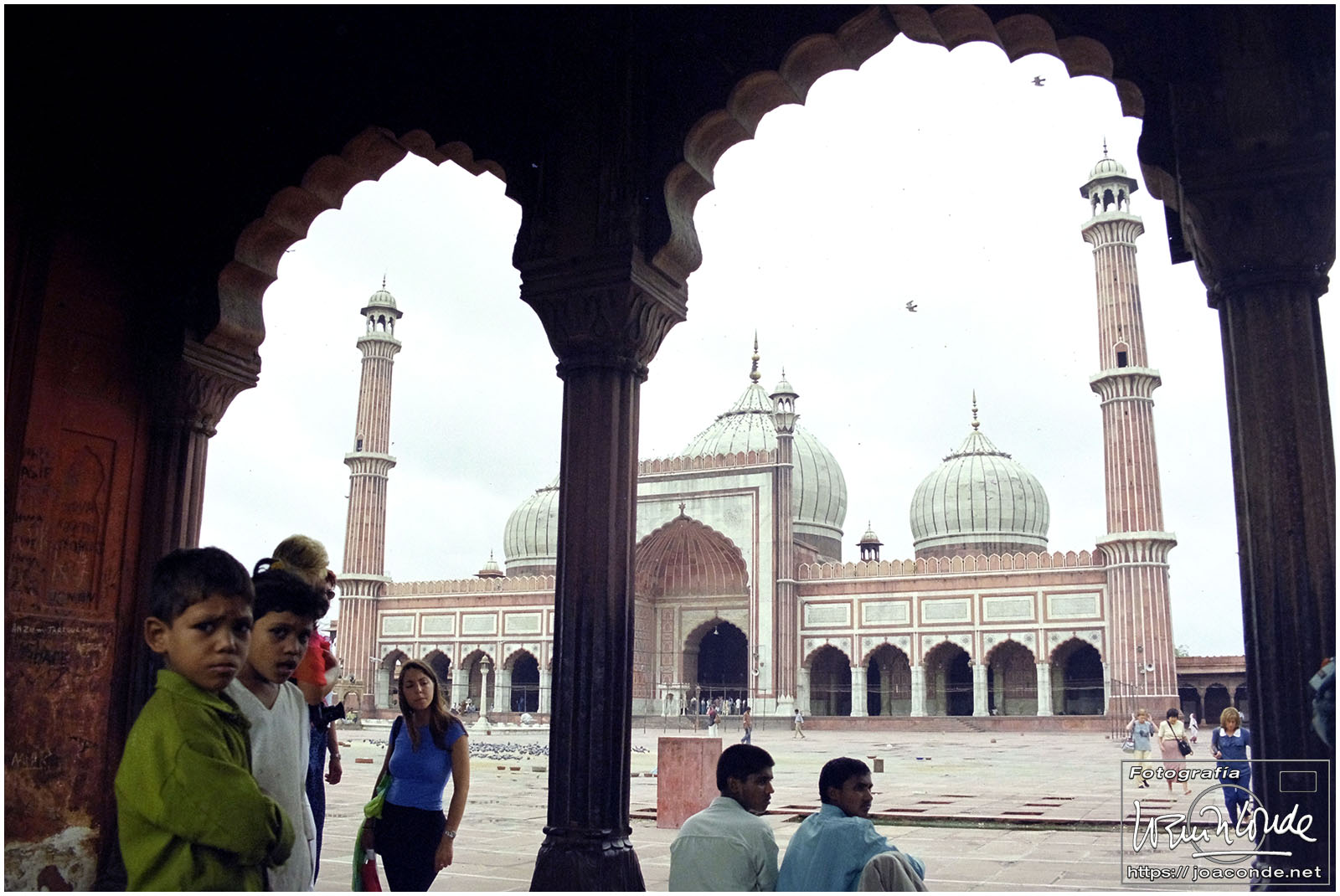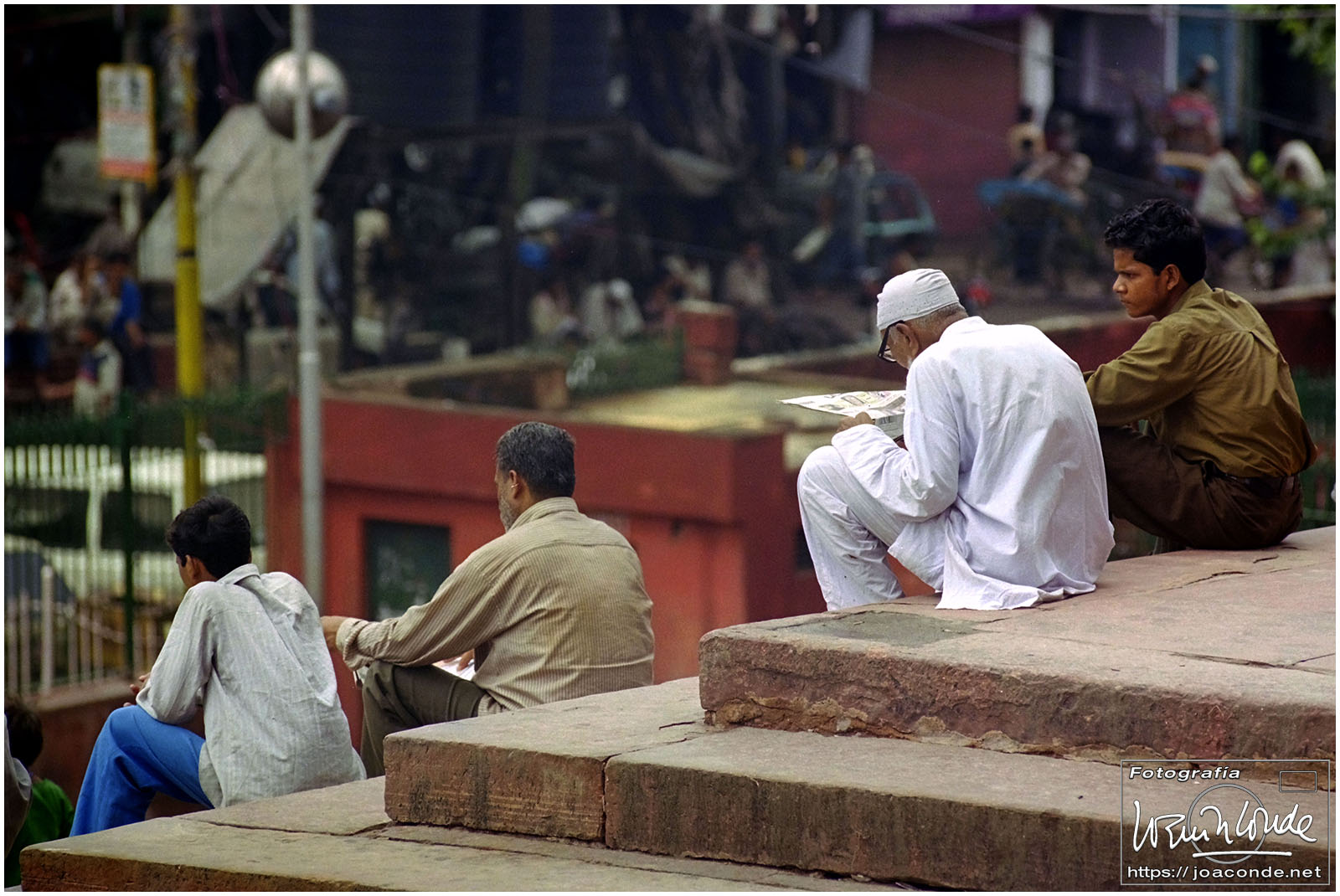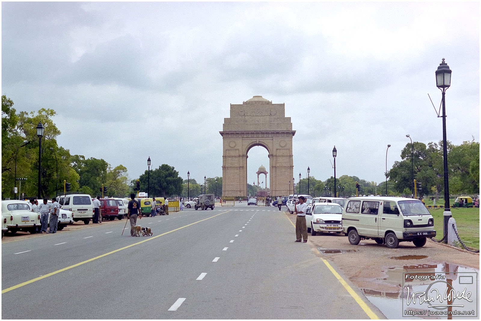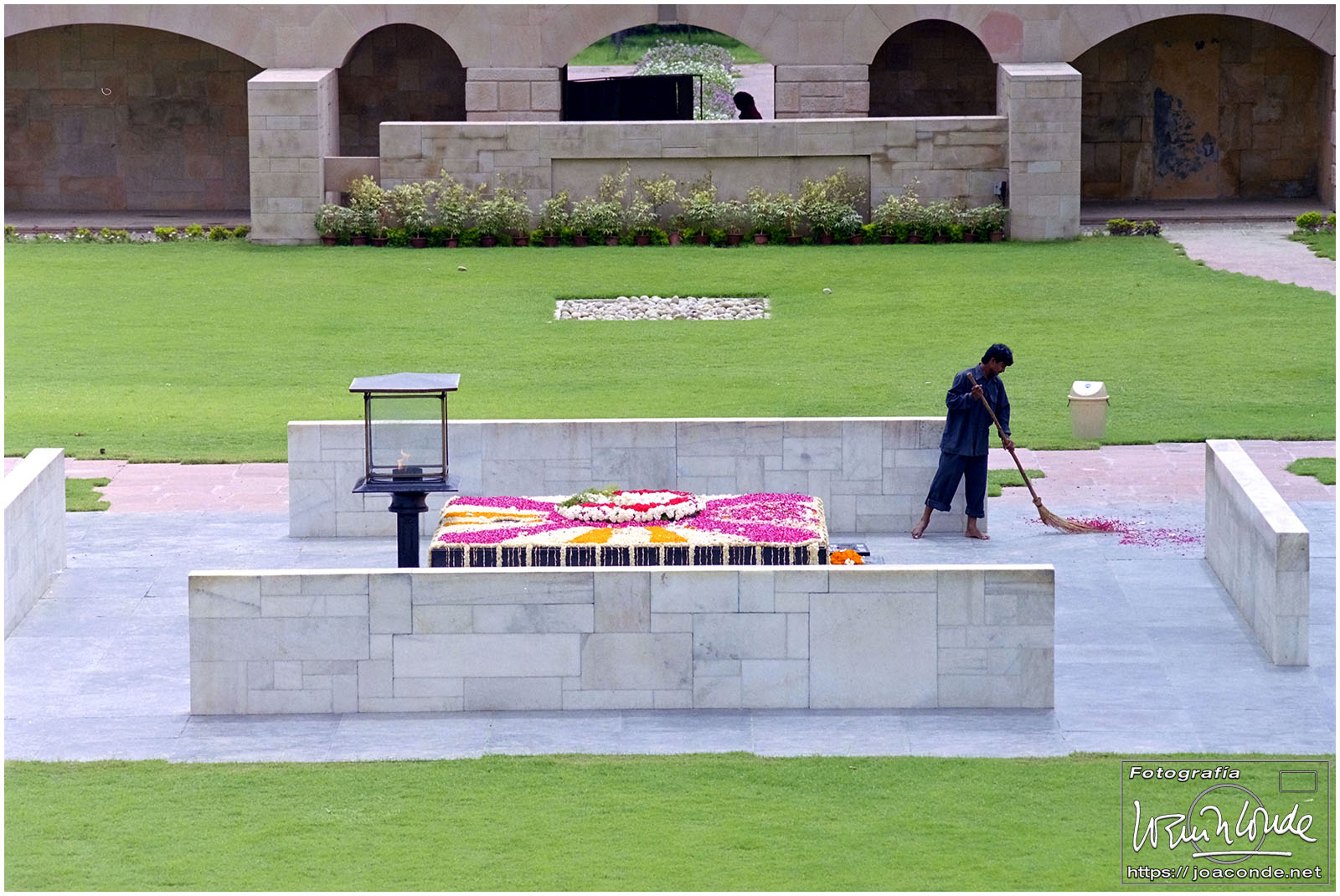 La prensa se hacía eco de la ofrenda de Musharraf en el Raj Ghat, que íbamos a visitar después. Antes fuimos al barrio musulmán y entramos en la Jama Masjid —Mezquita del Viernes—. Era enorme y descubierta, con capacidad para 25.000 personas. A continuación visitamos el Raj Ghat, lugar donde se incineró el cuerpo de Gandhi y se conservaban parte de sus cenizas; un empleado barría los pétalos fucsia que echó el presidente pakistaní el día anterior. Era un lugar de reflexión y esparcimiento. Luego estuvimos en la Puerta de la India, un enorme arco de triunfo en memoria de los soldados indios muertos en la Primera Guerra Mundial.