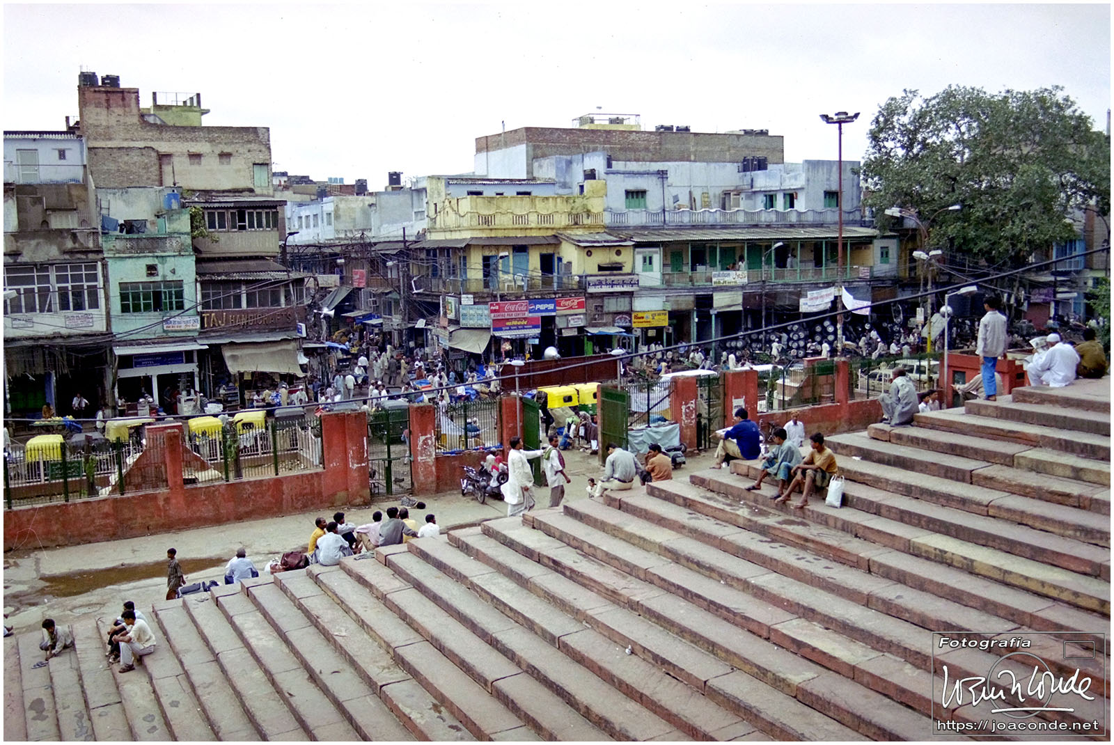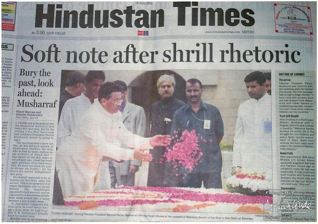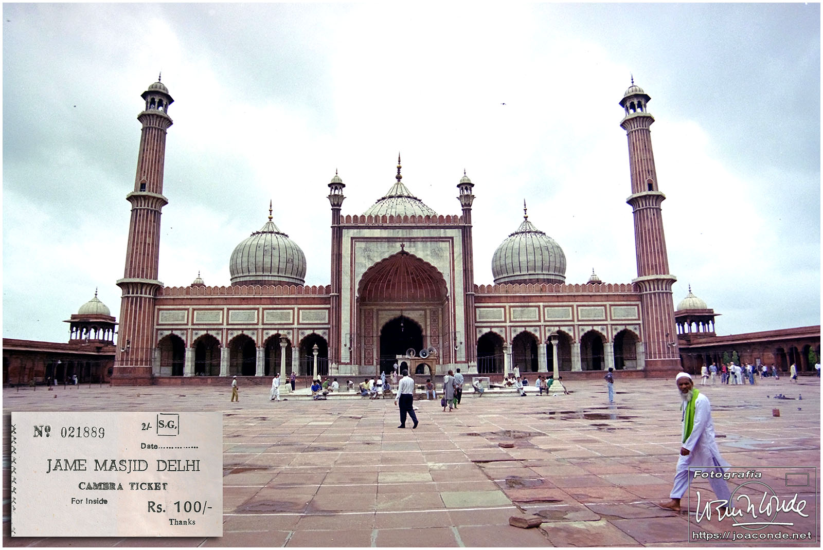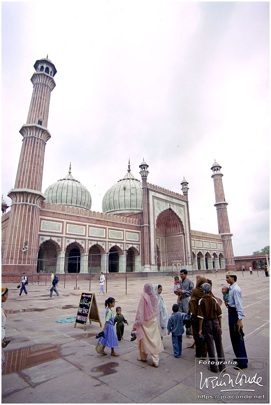 La prensa se hacía eco de la ofrenda de Musharraf en el Raj Ghat, que íbamos a visitar después. Antes fuimos al barrio musulmán y entramos en la Jama Masjid —Mezquita del Viernes—. Era enorme y descubierta, con capacidad para 25.000 personas. A continuación visitamos el Raj Ghat, lugar donde se incineró el cuerpo de Gandhi y se conservaban parte de sus cenizas; un empleado barría los pétalos fucsia que echó el presidente pakistaní el día anterior. Era un lugar de reflexión y esparcimiento. Luego estuvimos en la Puerta de la India, un enorme arco de triunfo en memoria de los soldados indios muertos en la Primera Guerra Mundial.