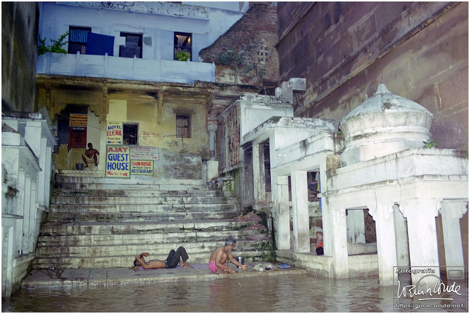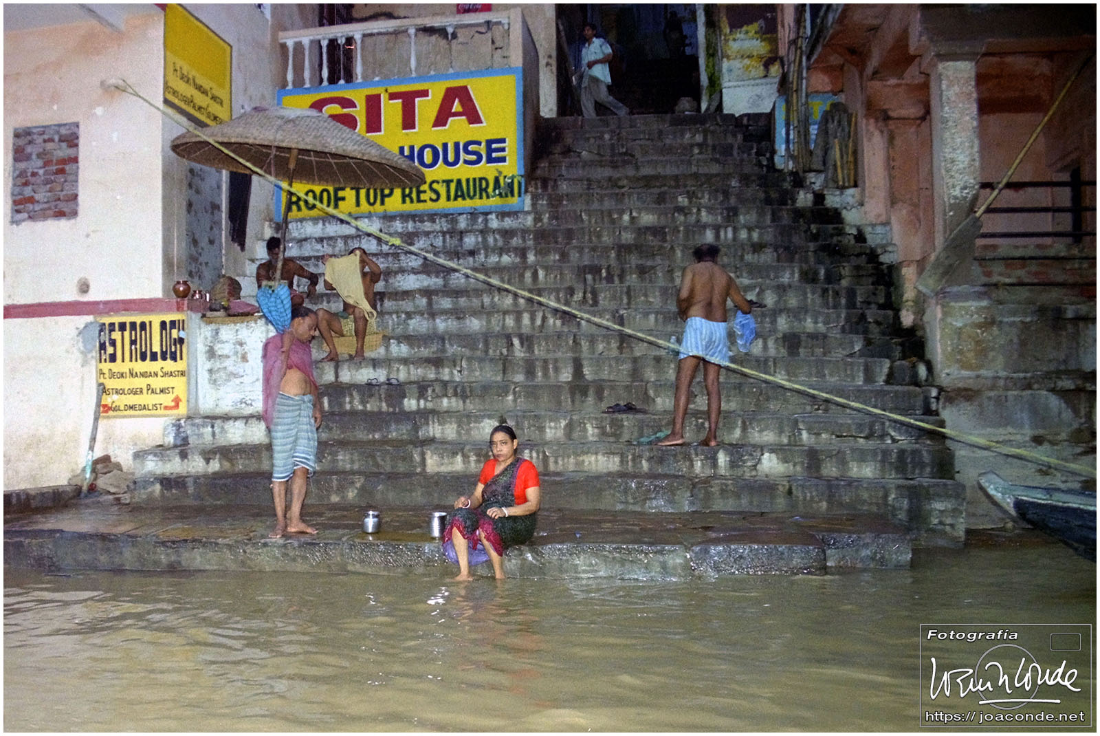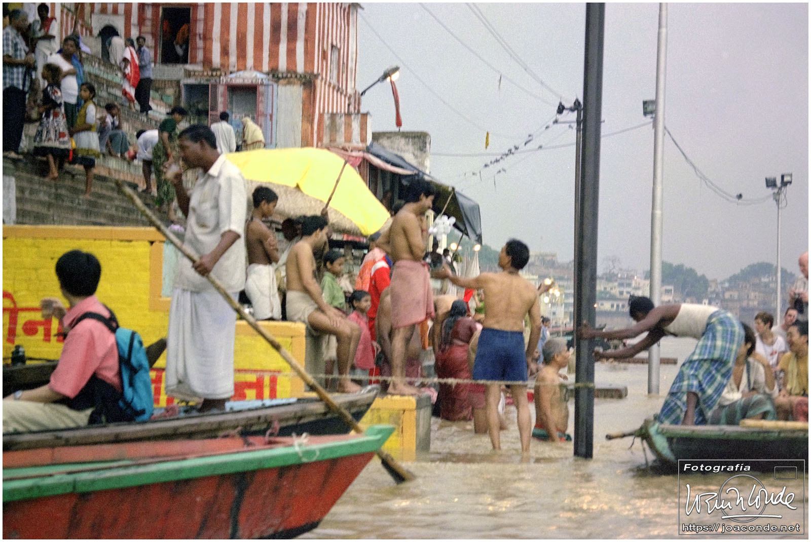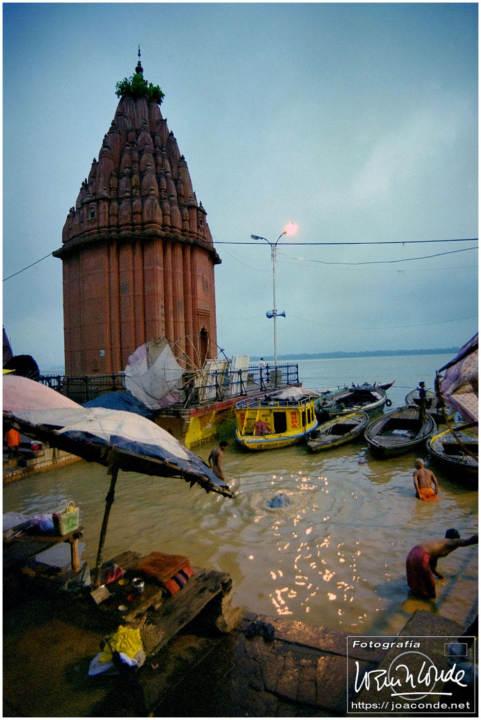 Los momentos más intensos de este viaje a la India los vivimos en la madrugada del martes. Era de noche cuando nos llevaron a los ghats, unas gradas que van descendiendo hasta el río. El nivel Ganges estaba muy alto por las lluvias y fue complicado embarcar. Era todavía de noche cuando salimos a la corriente; ante nosotros cientos de personas hacían sus abluciones, oraban o cogían agua. Tiré con película de ISO 800 y en algunas metí el flash, a pesar de eso, algunas fotos me salieron movidas. Después de pasar por las chimeneas del crematorio eléctrico regresamos al embarcadero. Empezaba a llover con fuerza y seguían llegando más y más peregrinos —y también algunos turistas—. Desayunamos en el hotel y fuimos al aeropuerto bajo un fuerte aguacero. Después de la India, nuestro viaje continuó unos días más en Nepal.