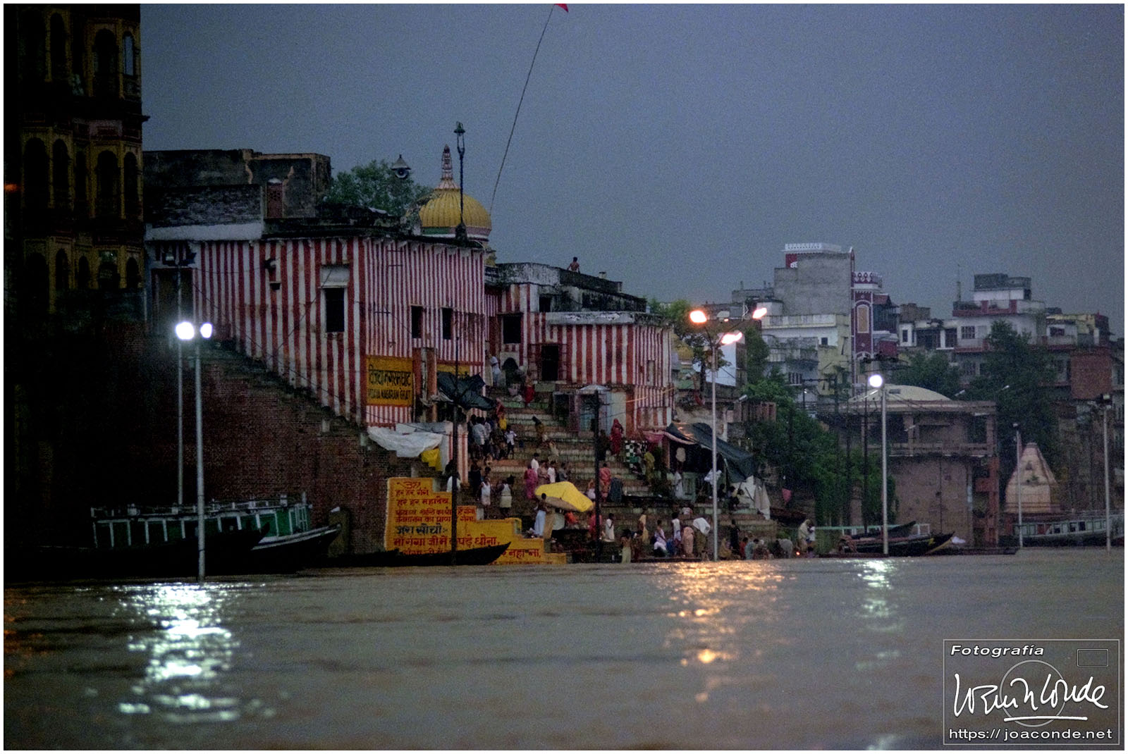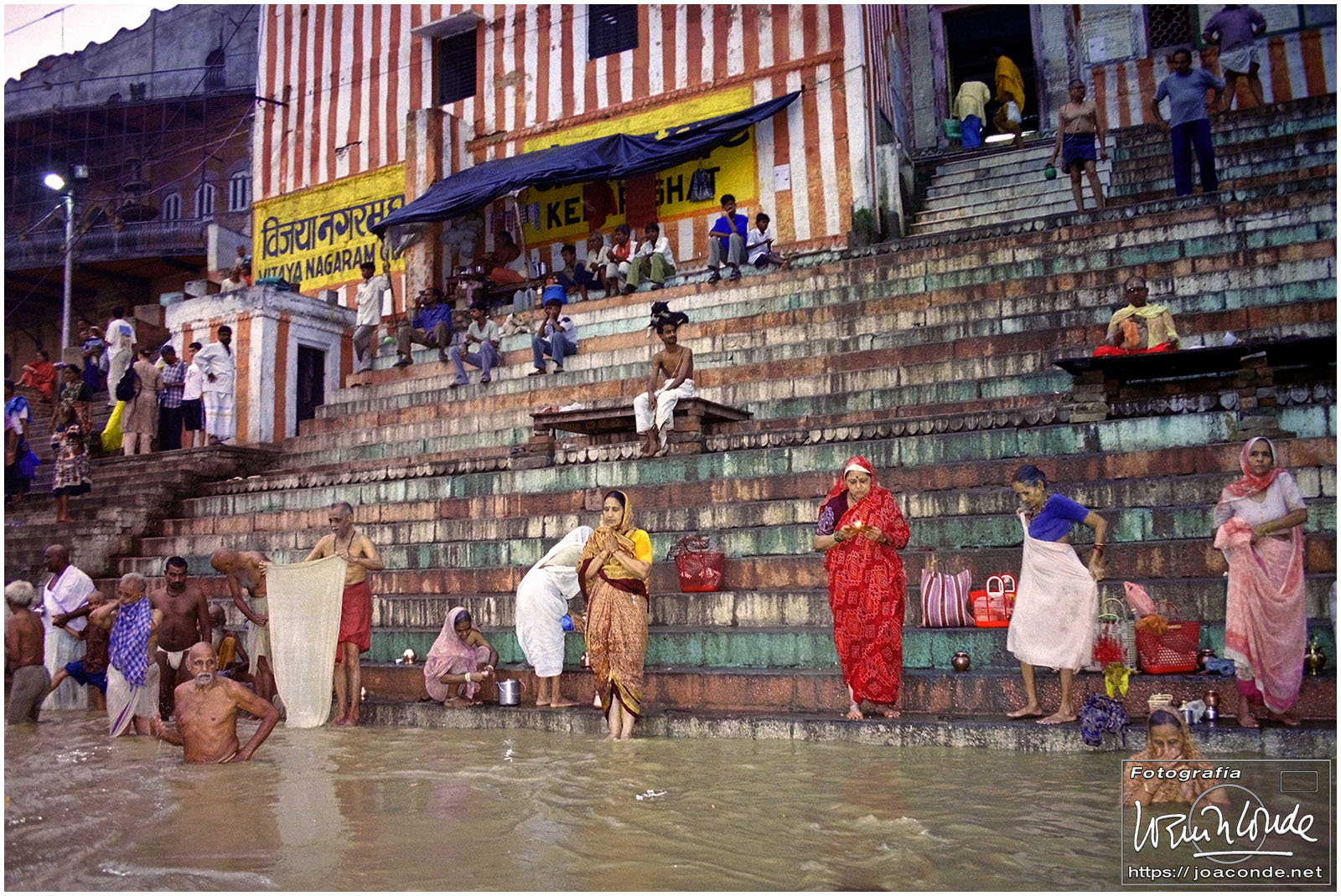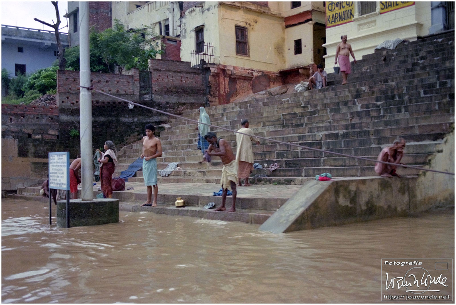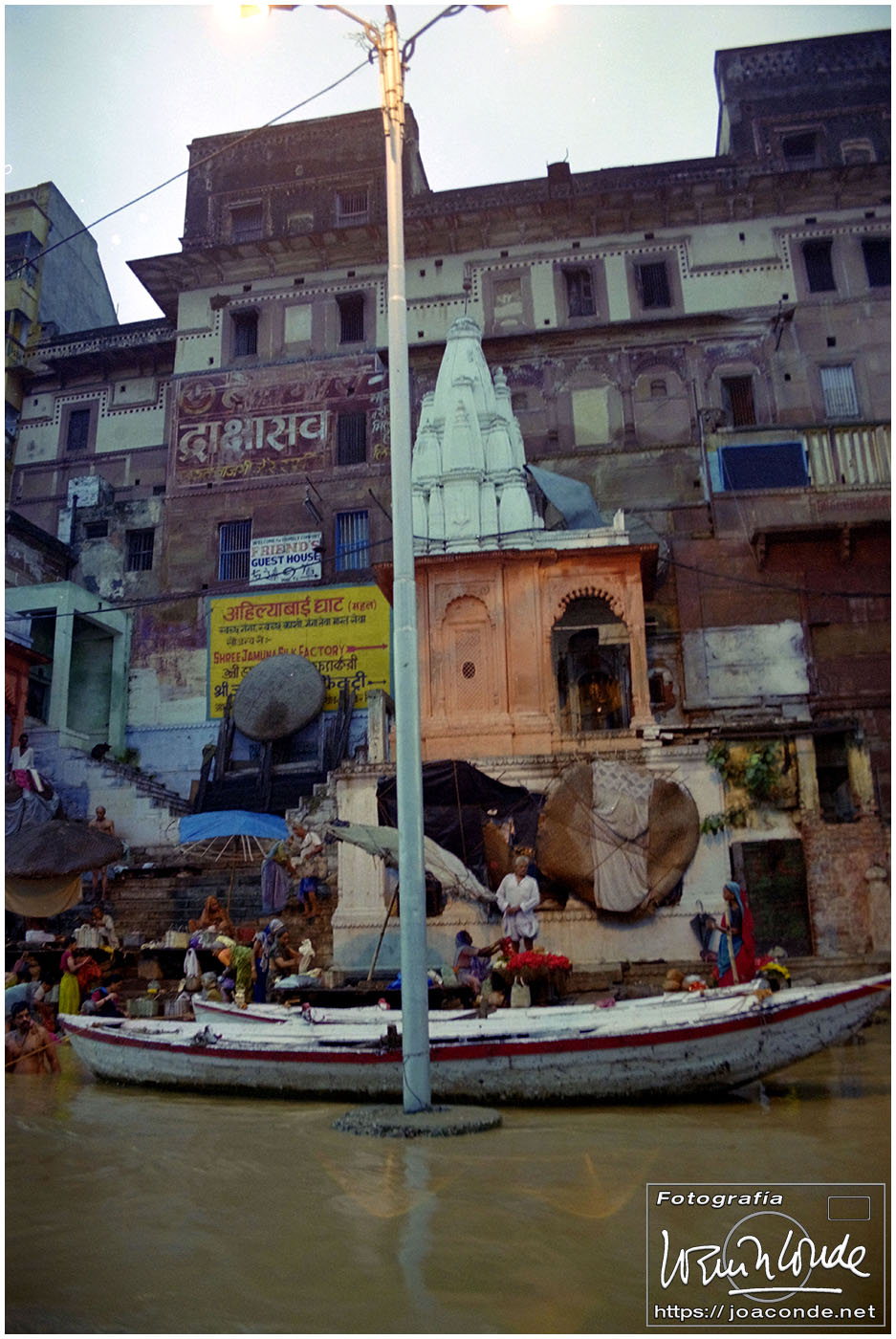Los momentos más intensos de este viaje a la India los vivimos en la madrugada del martes. Era de noche cuando nos llevaron a los ghats, unas gradas que van descendiendo hasta el río. El nivel Ganges estaba muy alto por las lluvias y fue complicado embarcar. Era todavía de noche cuando salimos a la corriente; ante nosotros cientos de personas hacían sus abluciones, oraban o cogían agua. Tiré con película de ISO 800 y en algunas metí el flash, a pesar de eso, algunas fotos me salieron movidas. Después de pasar por las chimeneas del crematorio eléctrico regresamos al embarcadero. Empezaba a llover con fuerza y seguían llegando más y más peregrinos —y también algunos turistas—. Desayunamos en el hotel y fuimos al aeropuerto bajo un fuerte aguacero. Después de la India, nuestro viaje continuó unos días más en Nepal.