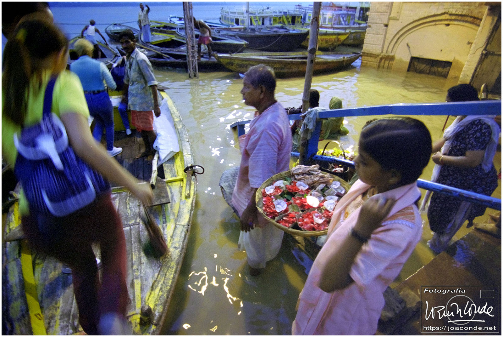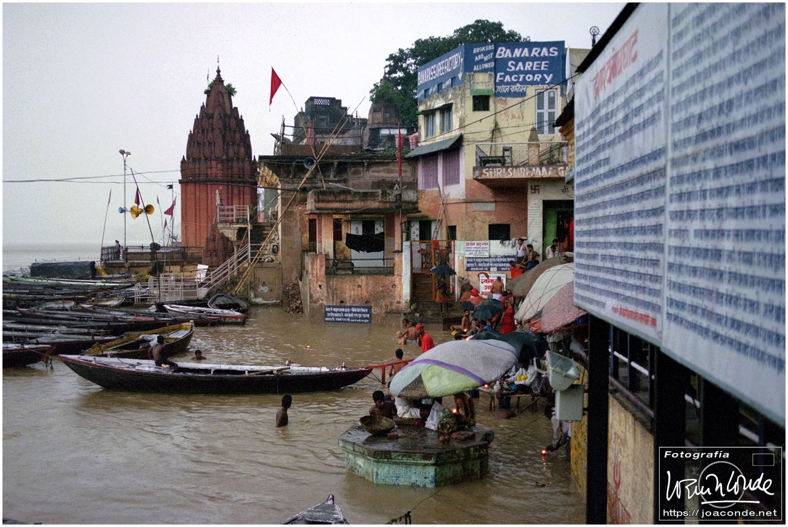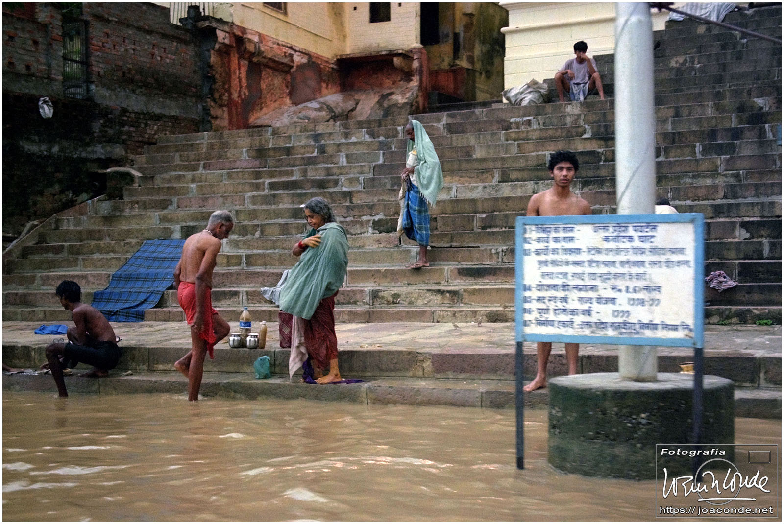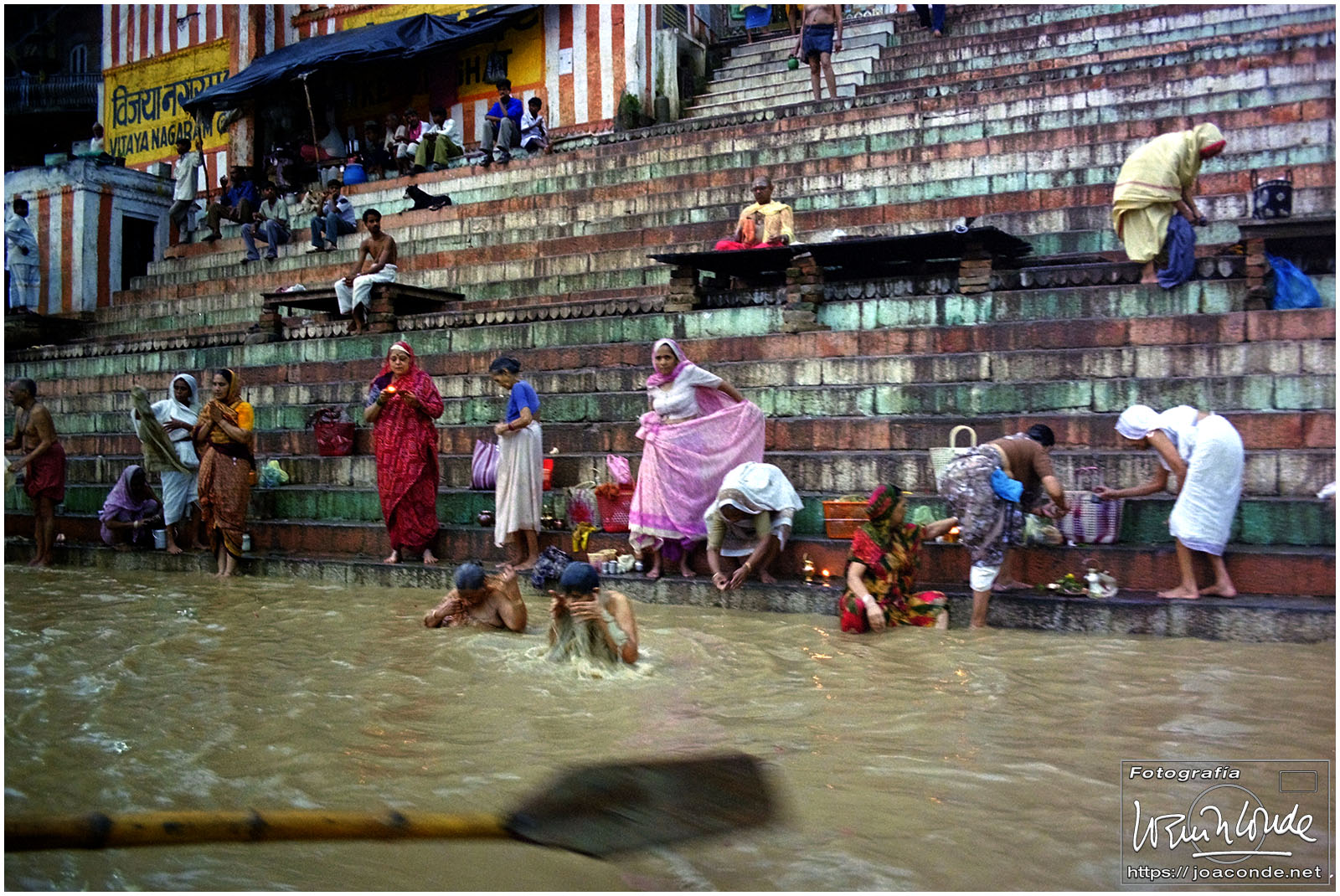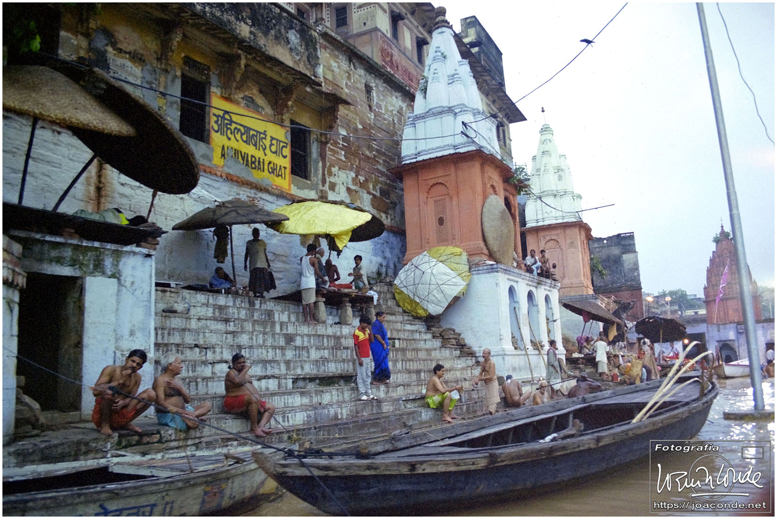 Los momentos más intensos de este viaje a la India los vivimos en la madrugada del martes. Era de noche cuando nos llevaron a los ghats, unas gradas que van descendiendo hasta el río. El nivel Ganges estaba muy alto por las lluvias y fue complicado embarcar. Era todavía de noche cuando salimos a la corriente; ante nosotros cientos de personas hacían sus abluciones, oraban o cogían agua. Tiré con película de ISO 800 y en algunas metí el flash, a pesar de eso, algunas fotos me salieron movidas. Después de pasar por las chimeneas del crematorio eléctrico regresamos al embarcadero. Empezaba a llover con fuerza y seguían llegando más y más peregrinos —y también algunos turistas—. Desayunamos en el hotel y fuimos al aeropuerto bajo un fuerte aguacero. Después de la India, nuestro viaje continuó unos días más en Nepal.