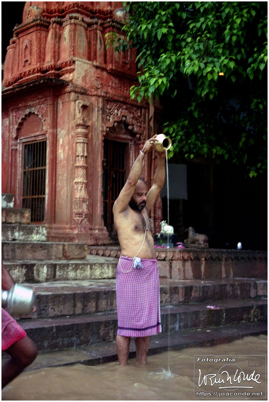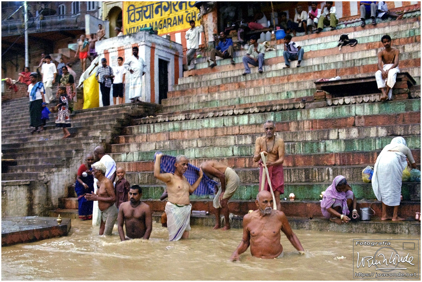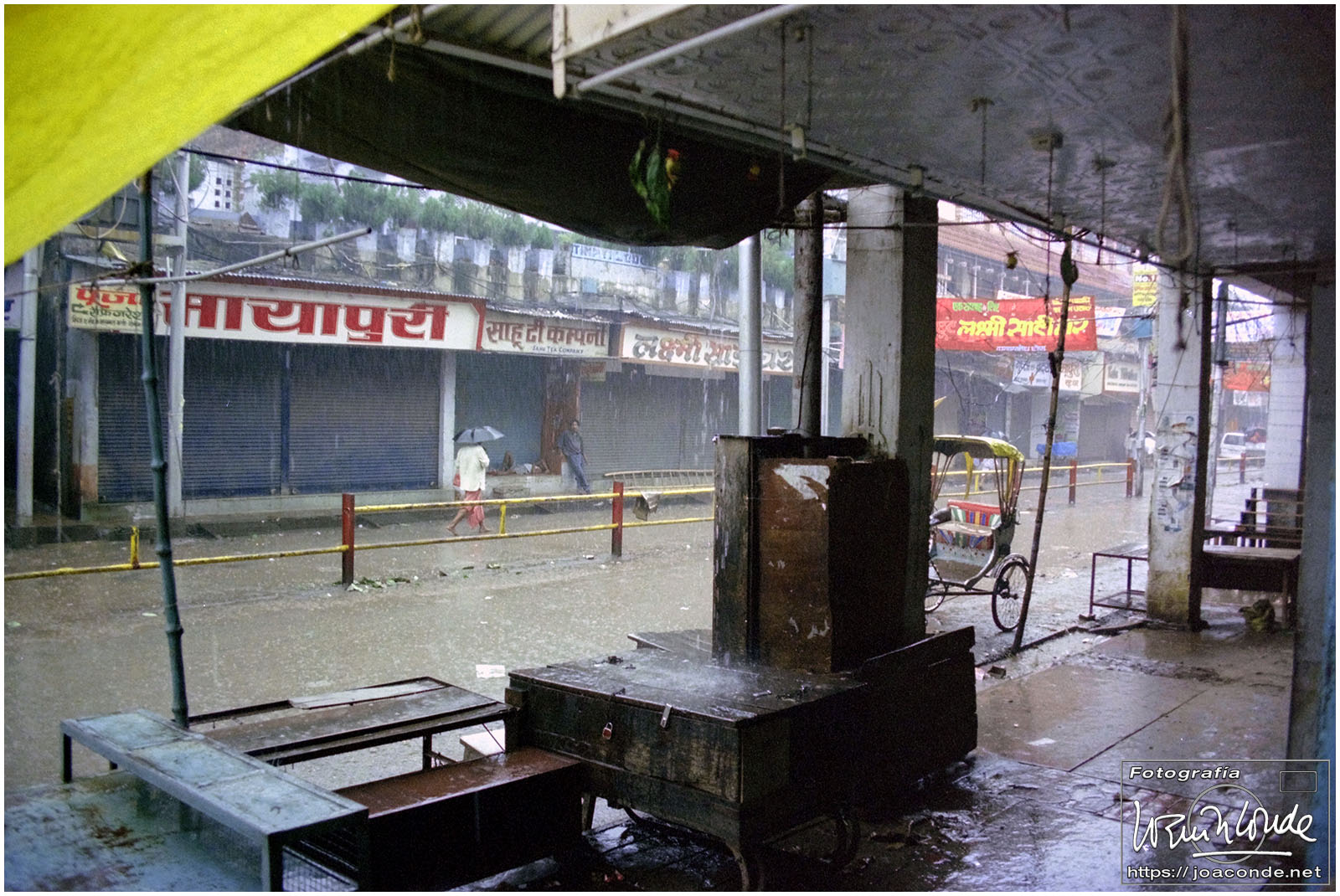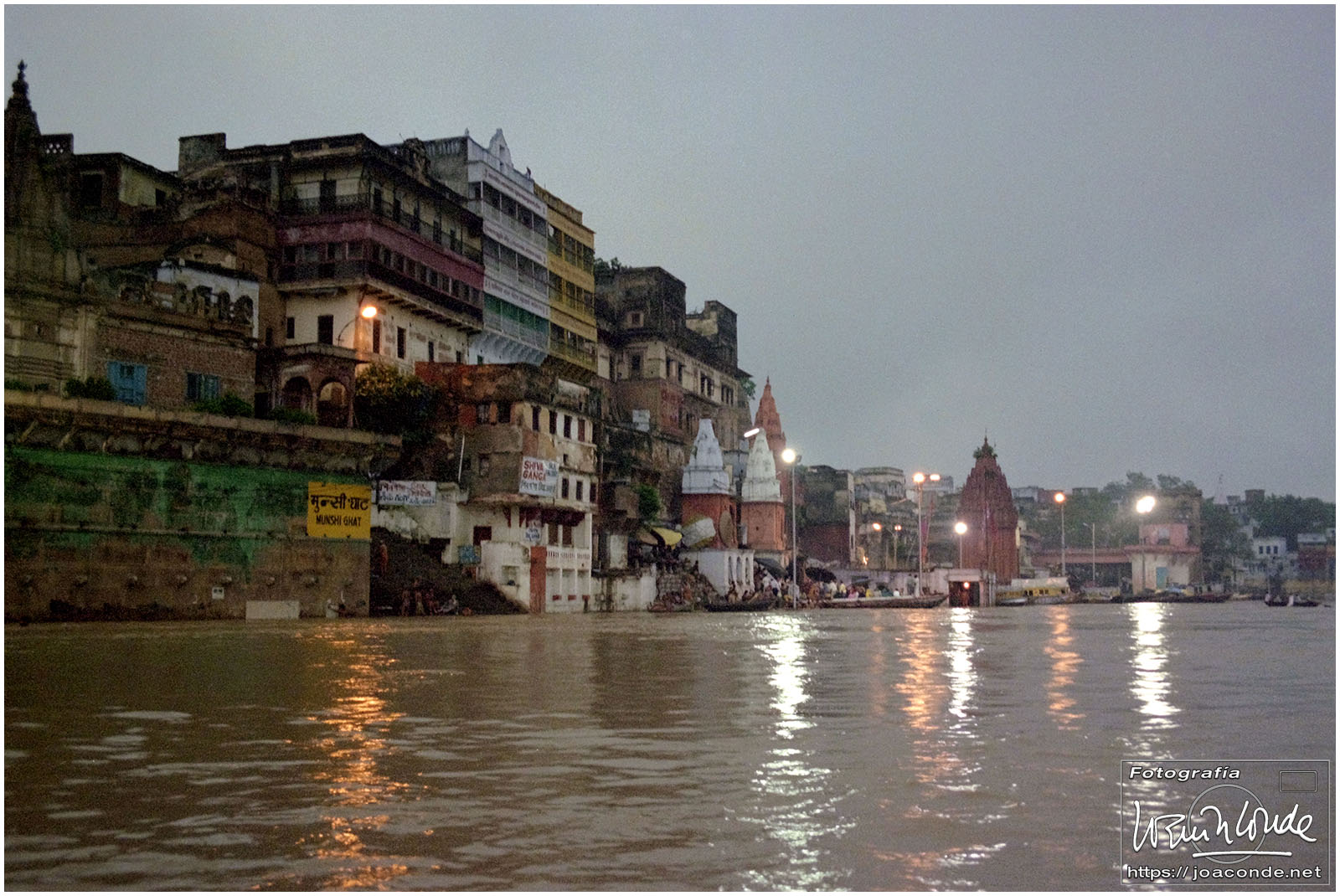 Los momentos más intensos de este viaje a la India los vivimos en la madrugada del martes. Era de noche cuando nos llevaron a los ghats, unas gradas que van descendiendo hasta el río. El nivel Ganges estaba muy alto por las lluvias y fue complicado embarcar. Era todavía de noche cuando salimos a la corriente; ante nosotros cientos de personas hacían sus abluciones, oraban o cogían agua. Tiré con película de ISO 800 y en algunas metí el flash, a pesar de eso, algunas fotos me salieron movidas. Después de pasar por las chimeneas del crematorio eléctrico regresamos al embarcadero. Empezaba a llover con fuerza y seguían llegando más y más peregrinos —y también algunos turistas—. Desayunamos en el hotel y fuimos al aeropuerto bajo un fuerte aguacero. Después de la India, nuestro viaje continuó unos días más en Nepal.