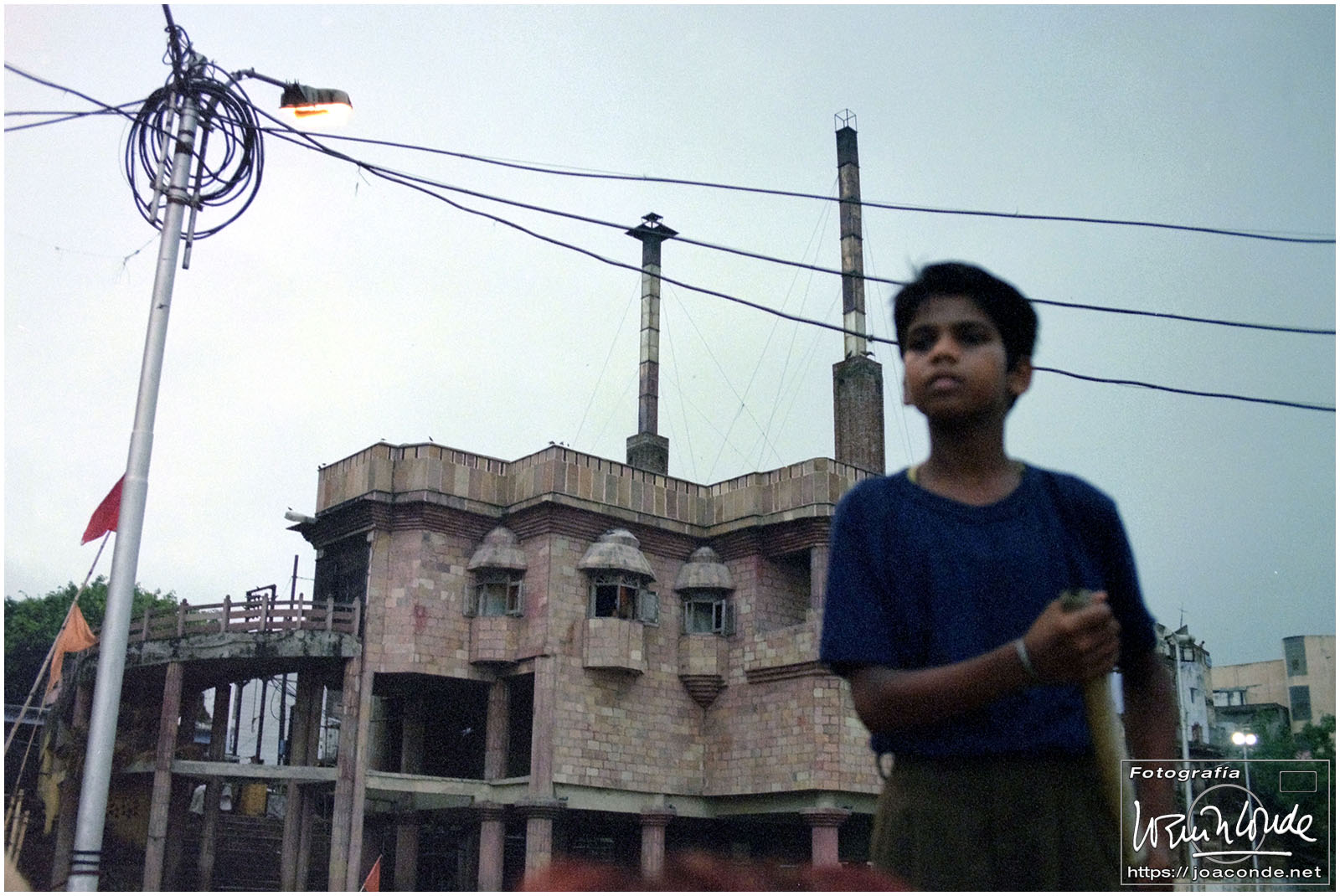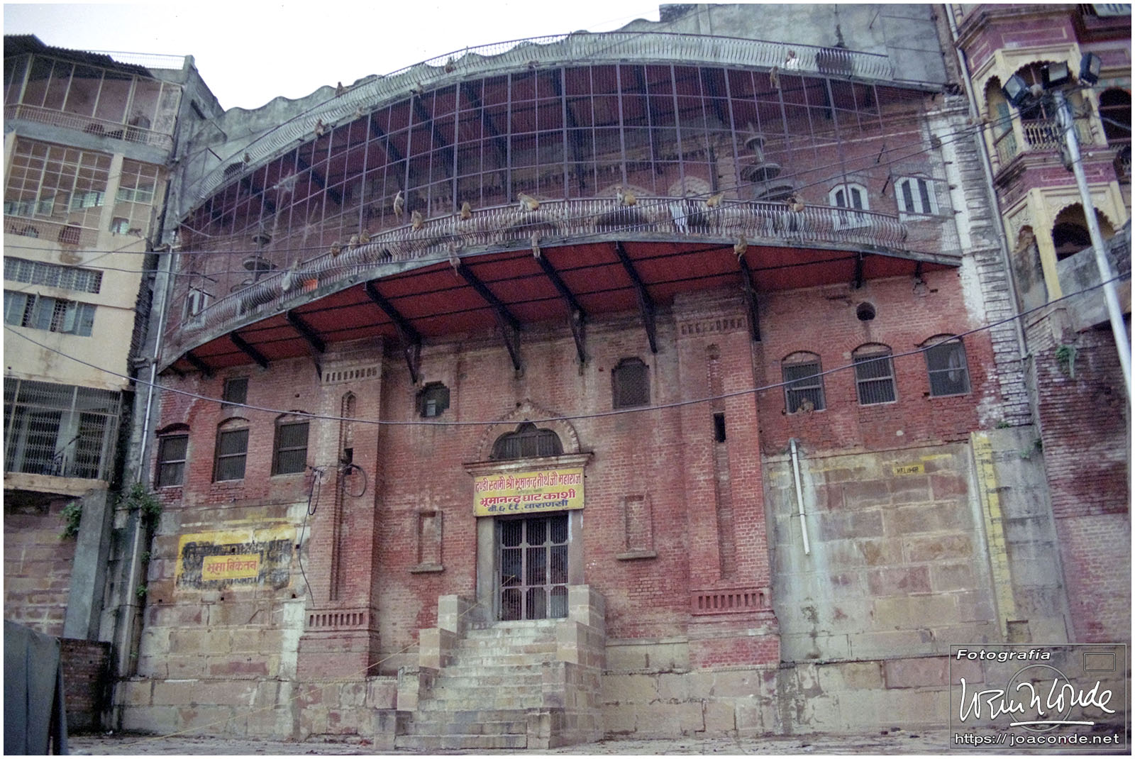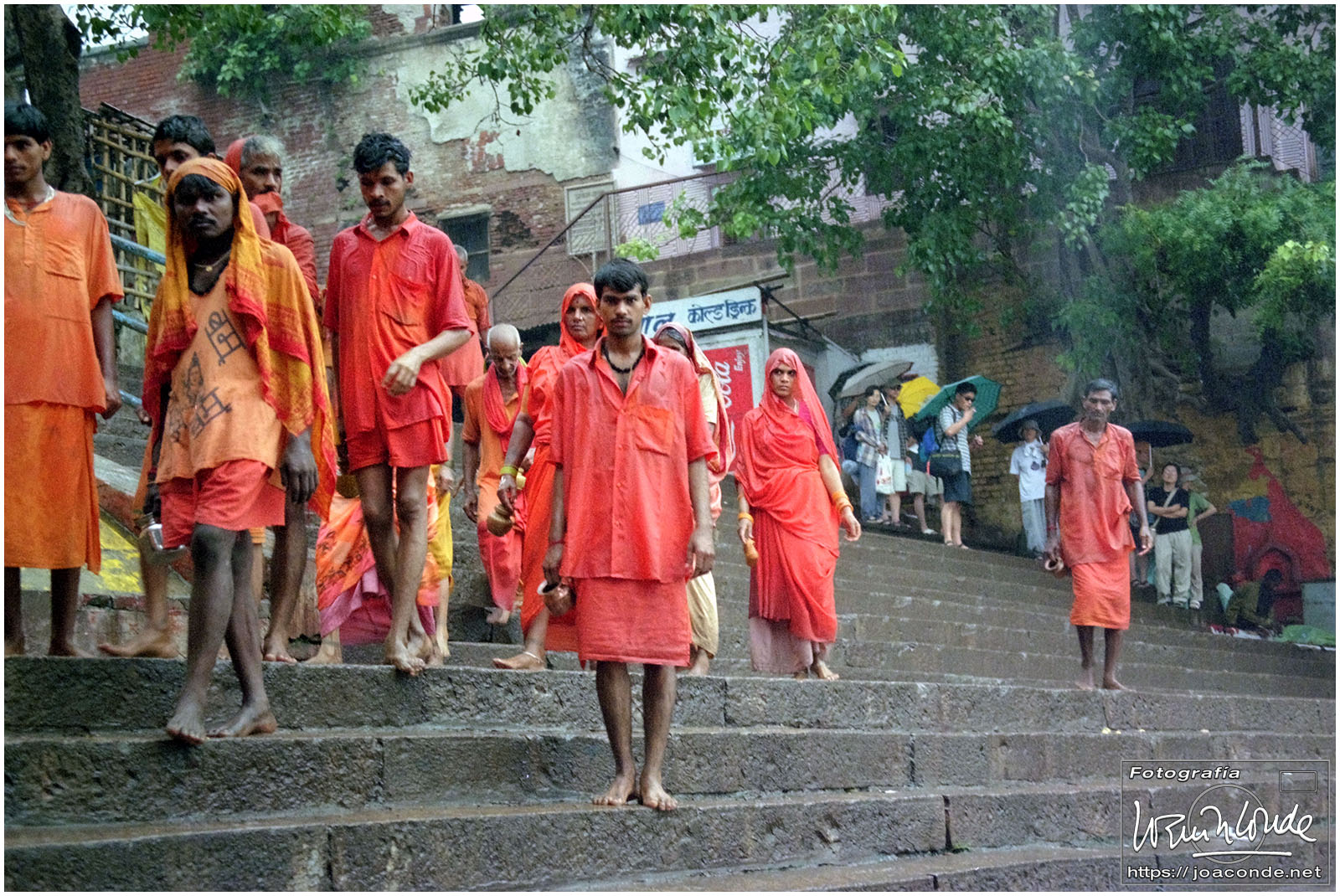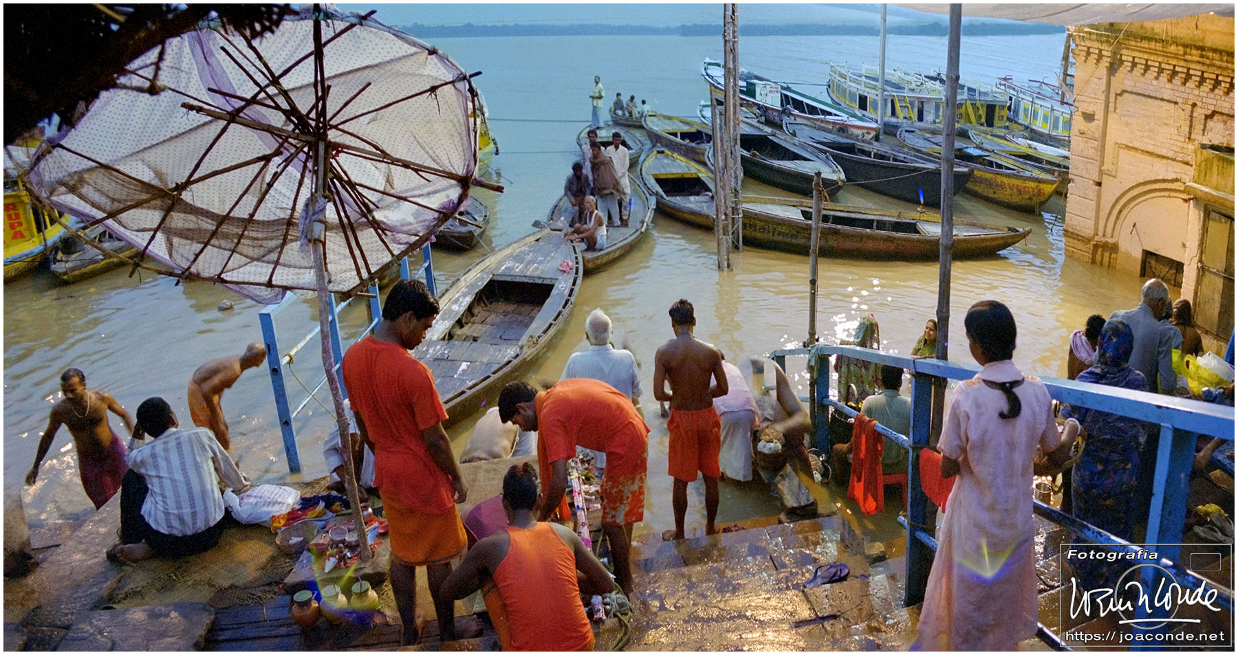 Los momentos más intensos de este viaje a la India los vivimos en la madrugada del martes. Era de noche cuando nos llevaron a los ghats, unas gradas que van descendiendo hasta el río. El nivel Ganges estaba muy alto por las lluvias y fue complicado embarcar. Era todavía de noche cuando salimos a la corriente; ante nosotros cientos de personas hacían sus abluciones, oraban o cogían agua. Tiré con película de ISO 800 y en algunas metí el flash, a pesar de eso, algunas fotos me salieron movidas. Después de pasar por las chimeneas del crematorio eléctrico regresamos al embarcadero. Empezaba a llover con fuerza y seguían llegando más y más peregrinos —y también algunos turistas—. Desayunamos en el hotel y fuimos al aeropuerto bajo un fuerte aguacero. Después de la India, nuestro viaje continuó unos días más en Nepal.