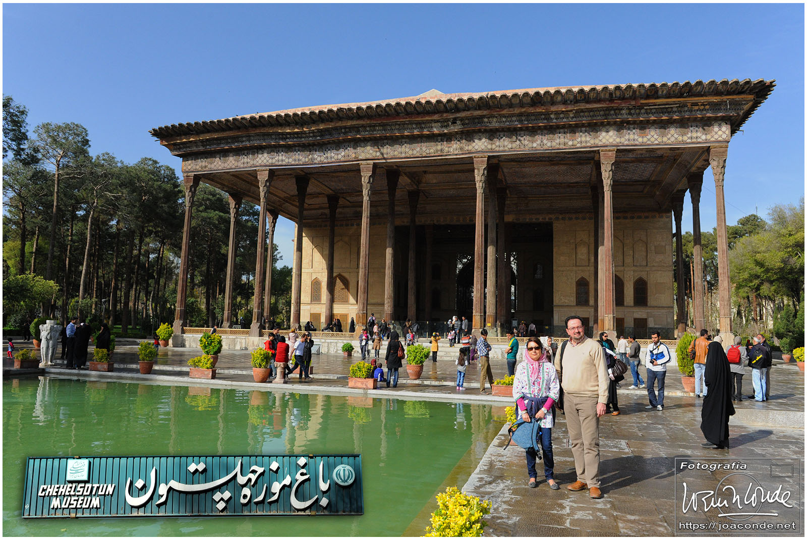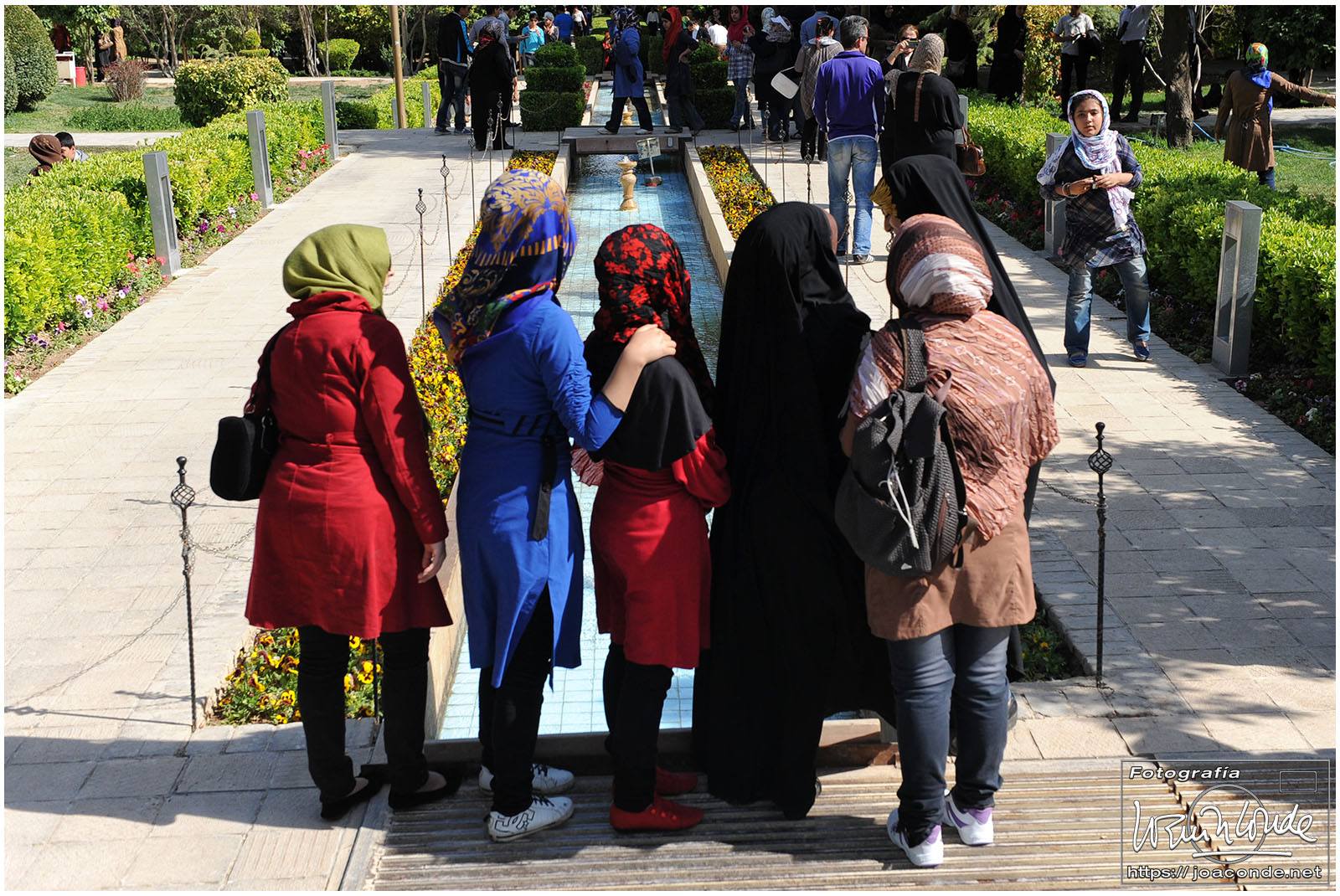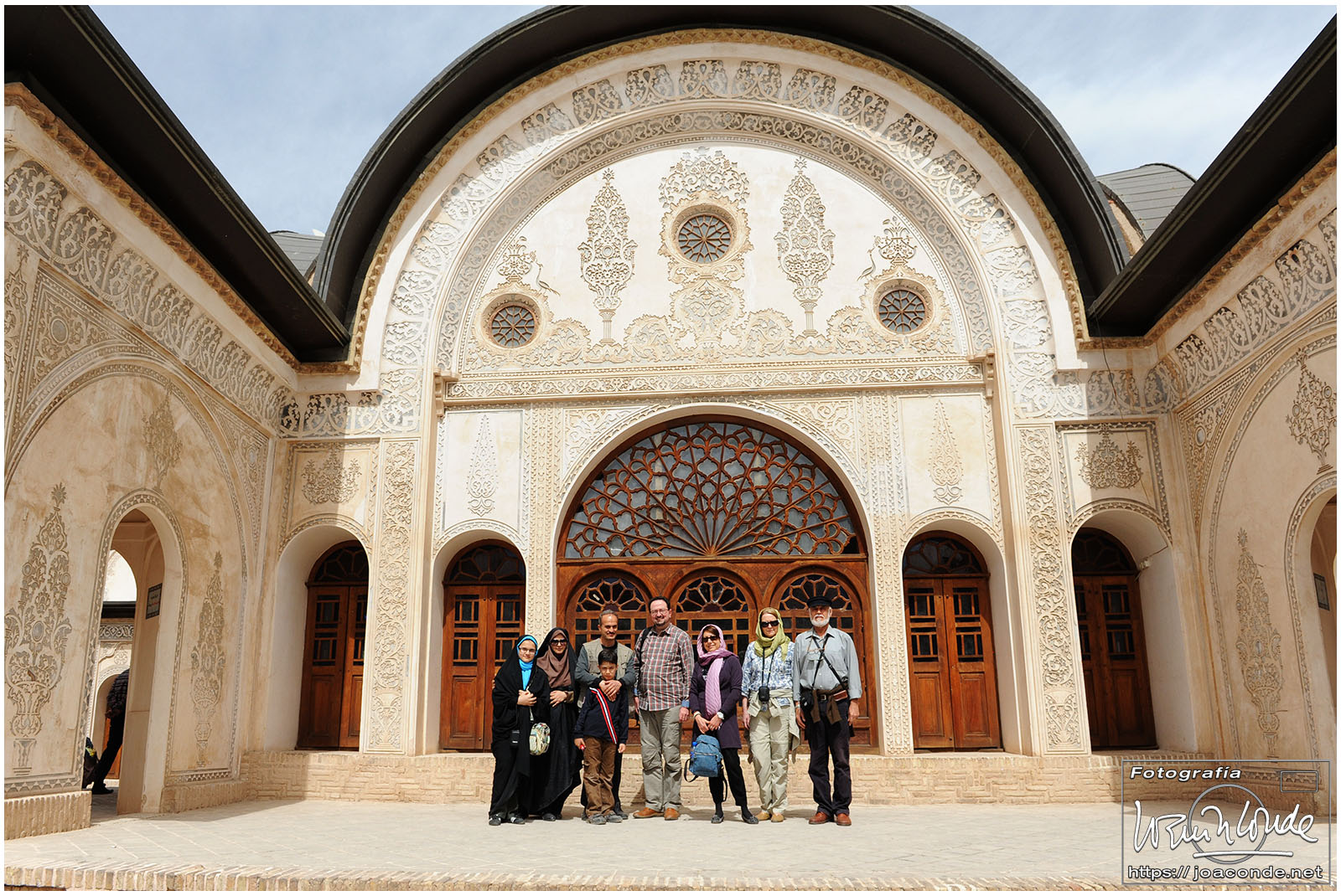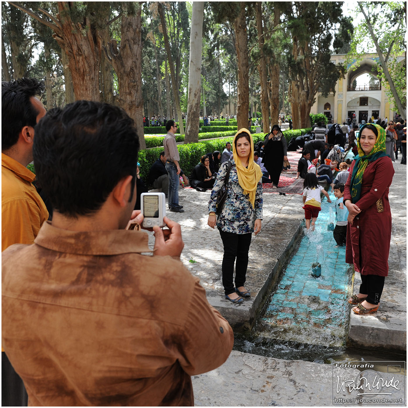 Los iraníes siempre nos mostraron su simpatía y era muy frecuente que quisieran intercambiar algunas palabras en inglés con nosotros; nos preguntaban que de dónde veníamos, que si nos gustaba su país, que cuántos días duraba nuestro viaje… Tuve la sensación de que querían descubrir cómo éramos las personas de fuera, a la vez que mejorar la imagen que suponían teníamos de ellos. Después de conversar unos minutos, nos hicimos una foto con Jamal y su familia, que hacían turismo como nosotros. A continuación entramos en un parque Patrimonio de la Humanidad, el Jardín de Fin.