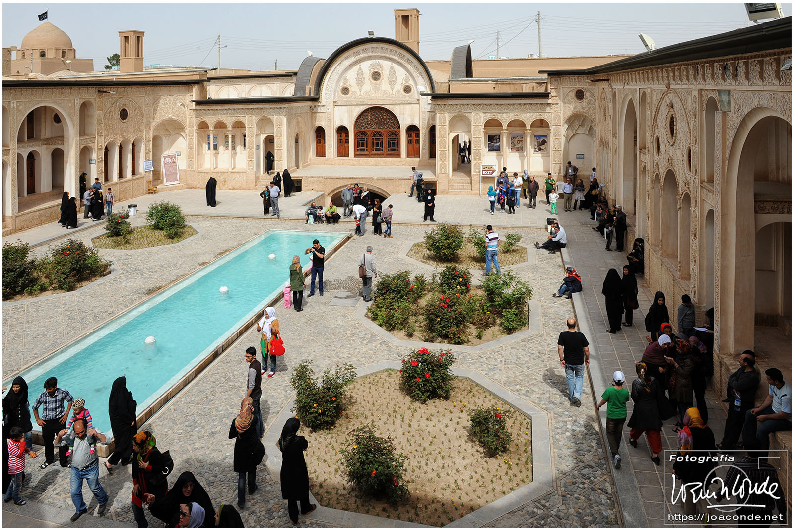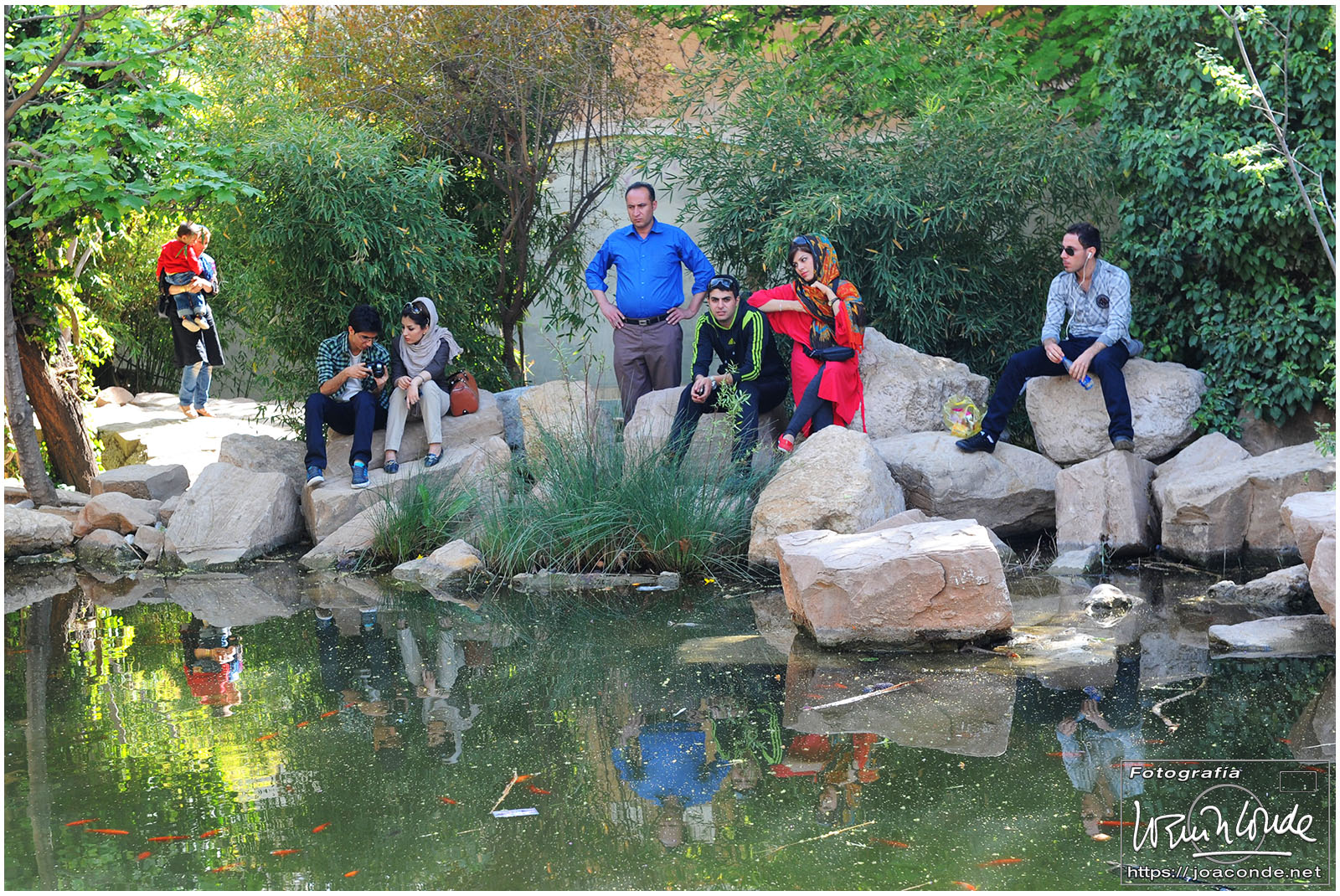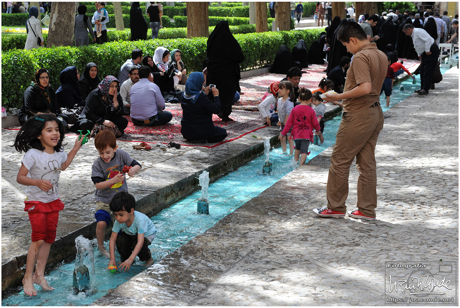 Los iraníes siempre nos mostraron su simpatía y era muy frecuente que quisieran intercambiar algunas palabras en inglés con nosotros; nos preguntaban que de dónde veníamos, que si nos gustaba su país, que cuántos días duraba nuestro viaje… Tuve la sensación de que querían descubrir cómo éramos las personas de fuera, a la vez que mejorar la imagen que suponían teníamos de ellos. Después de conversar unos minutos, nos hicimos una foto con Jamal y su familia, que hacían turismo como nosotros. A continuación entramos en un parque Patrimonio de la Humanidad, el Jardín de Fin.