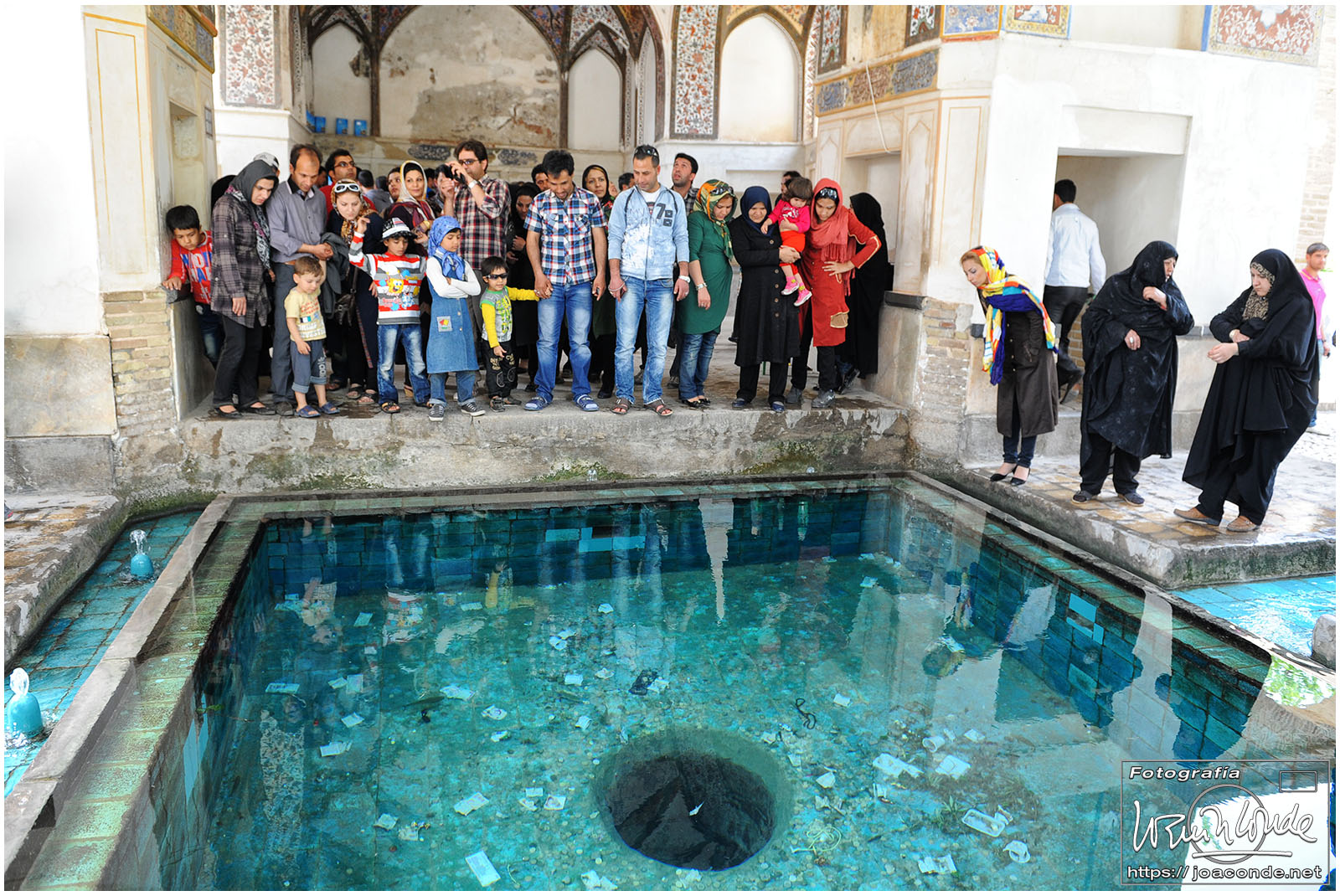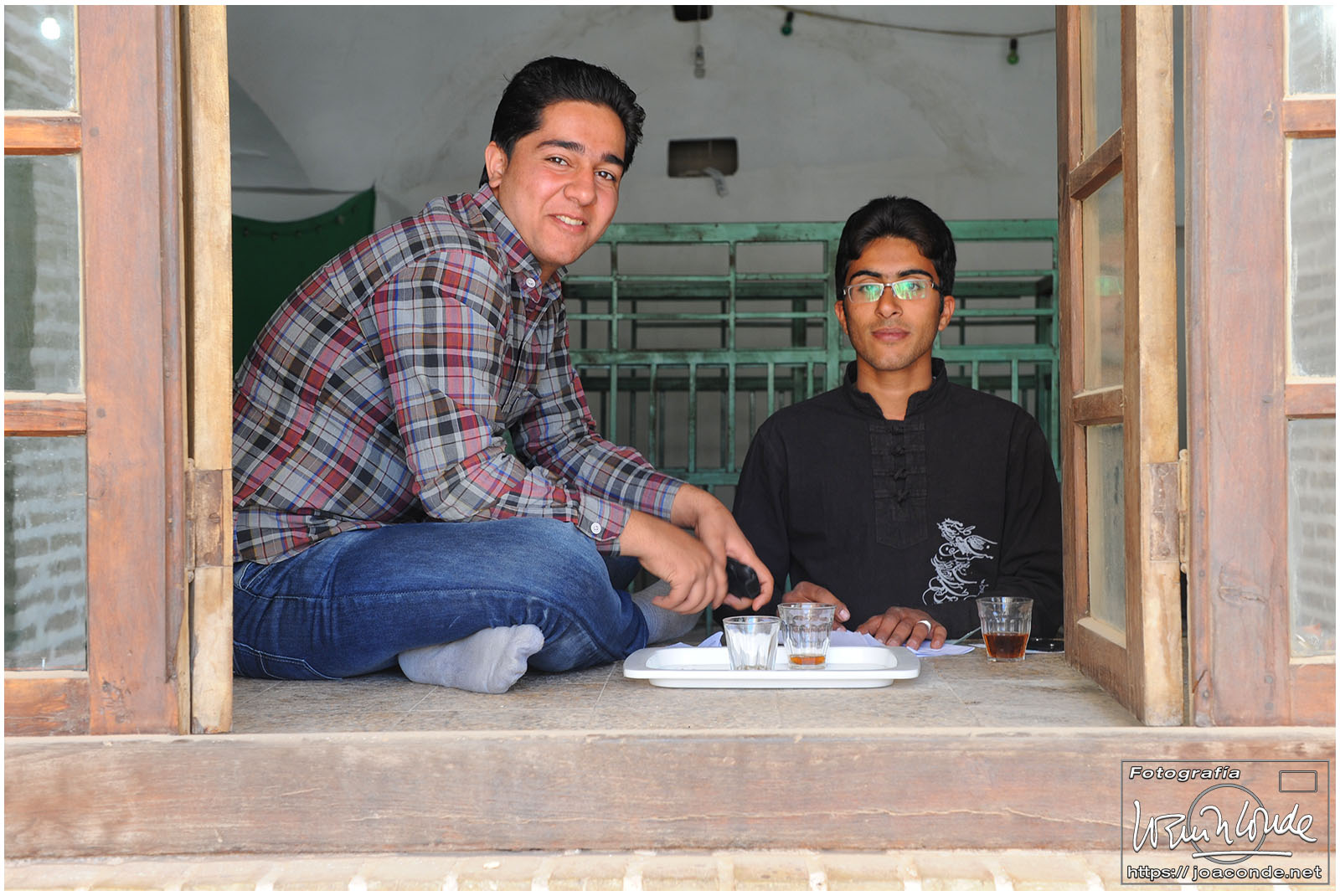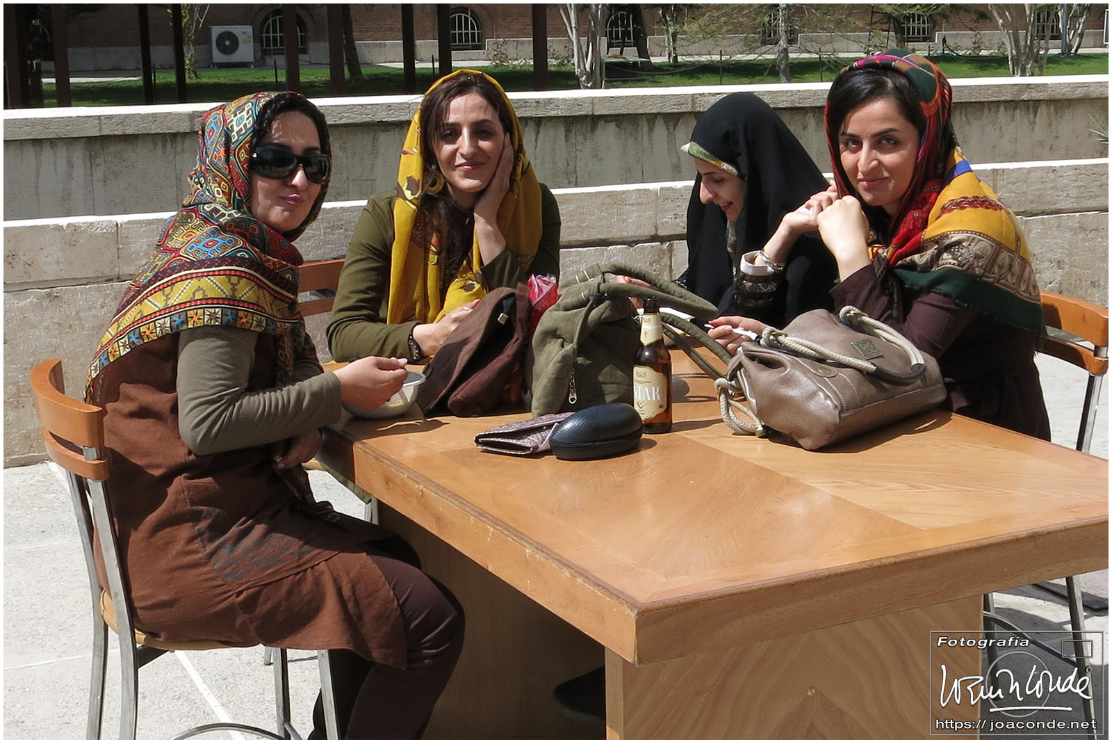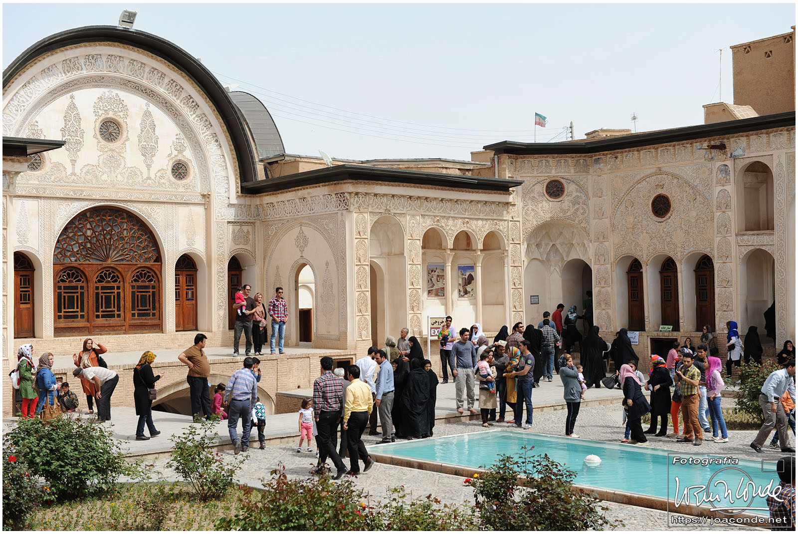 Los iraníes siempre nos mostraron su simpatía y era muy frecuente que quisieran intercambiar algunas palabras en inglés con nosotros; nos preguntaban que de dónde veníamos, que si nos gustaba su país, que cuántos días duraba nuestro viaje… Tuve la sensación de que querían descubrir cómo éramos las personas de fuera, a la vez que mejorar la imagen que suponían teníamos de ellos. Después de conversar unos minutos, nos hicimos una foto con Jamal y su familia, que hacían turismo como nosotros. A continuación entramos en un parque Patrimonio de la Humanidad, el Jardín de Fin.