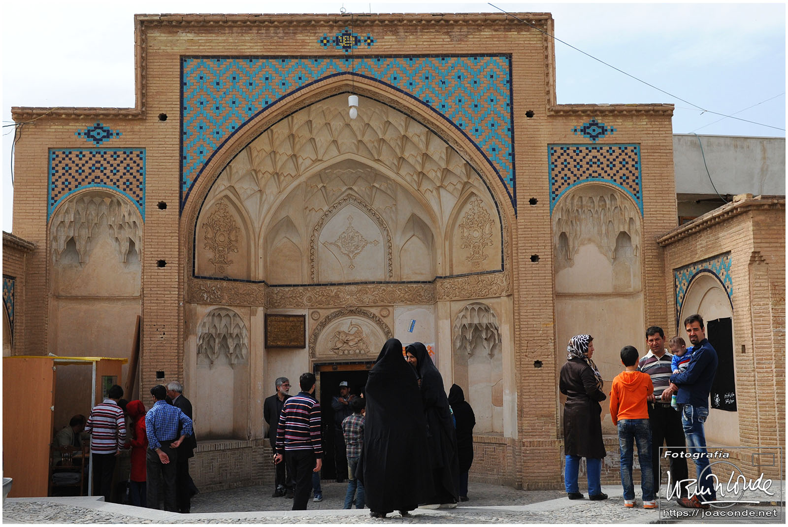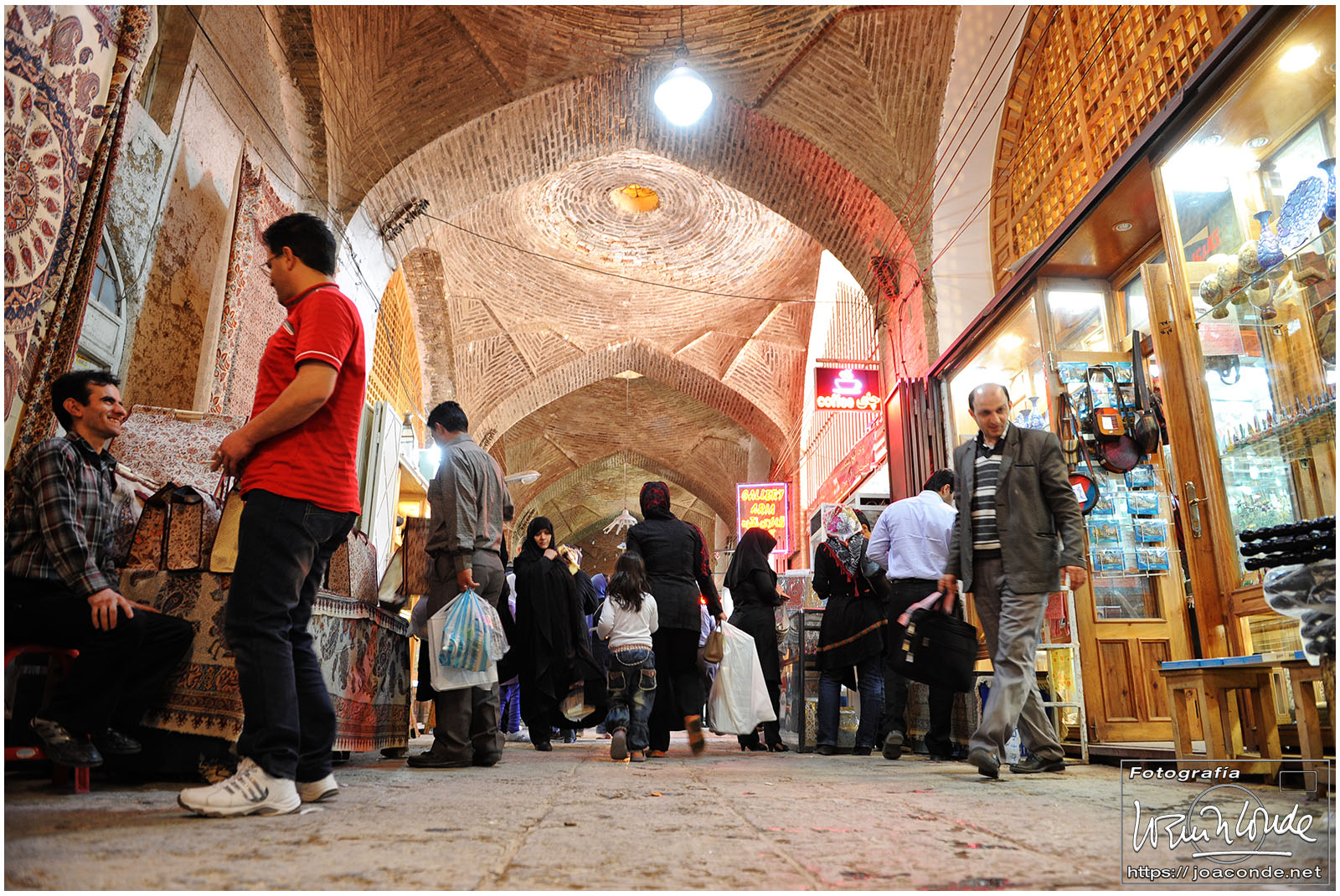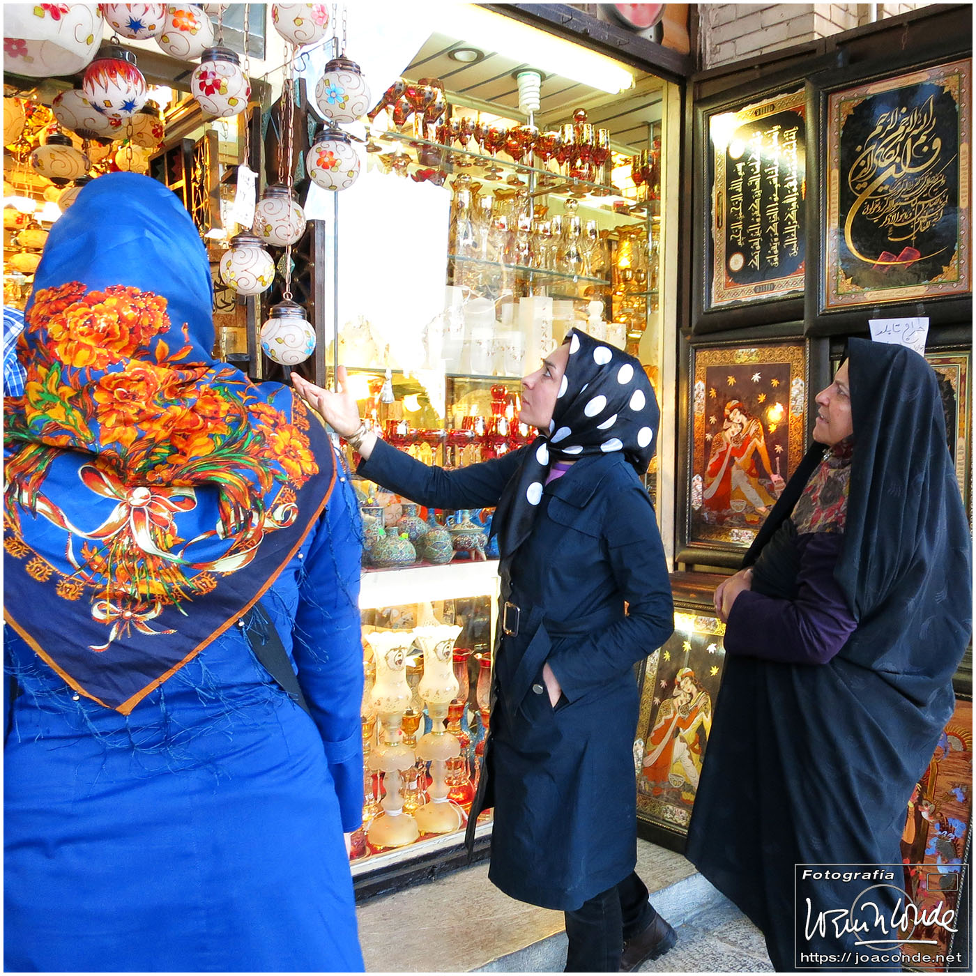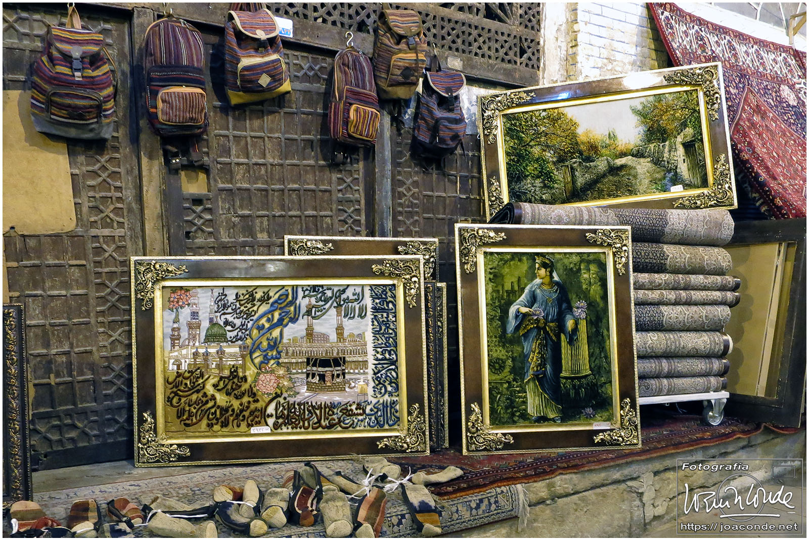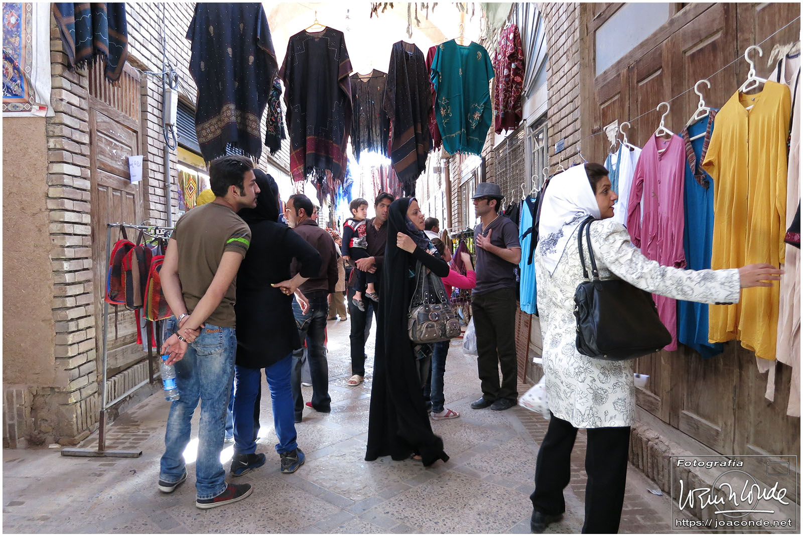 Vimos que las puertas de las casas tenían dos llamadores, uno con sonido más recio, para uso de los hombres; otro de sonido más sutil, para las mujeres. La señora de la casa debía saber de qué sexo era quién llamaba a la puerta, para estar vestida de acuerdo con la ley. Entramos en una de esas casas, Khan-e Lari, pero solo en un par de habitaciones y no se podían hacer fotos; dentro había también varios puestos de artesanía.