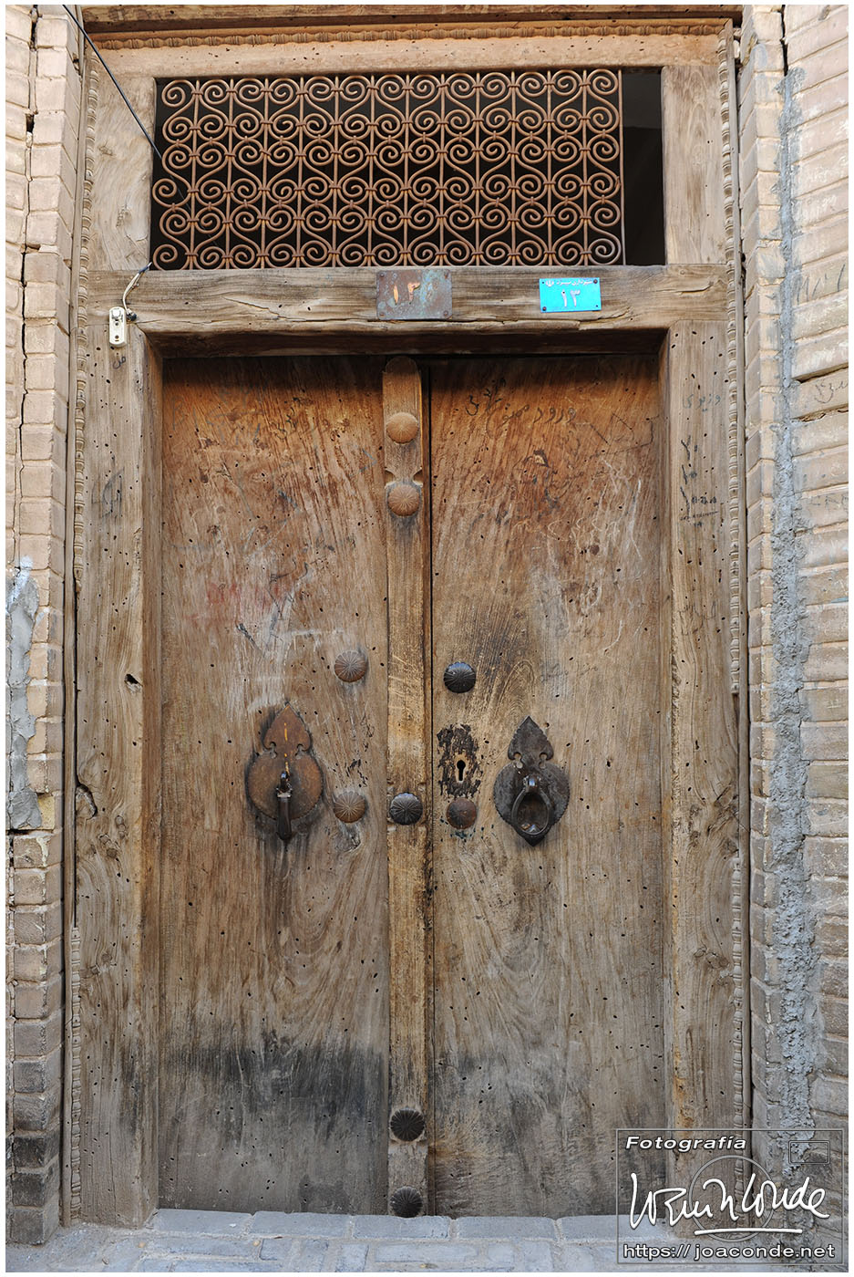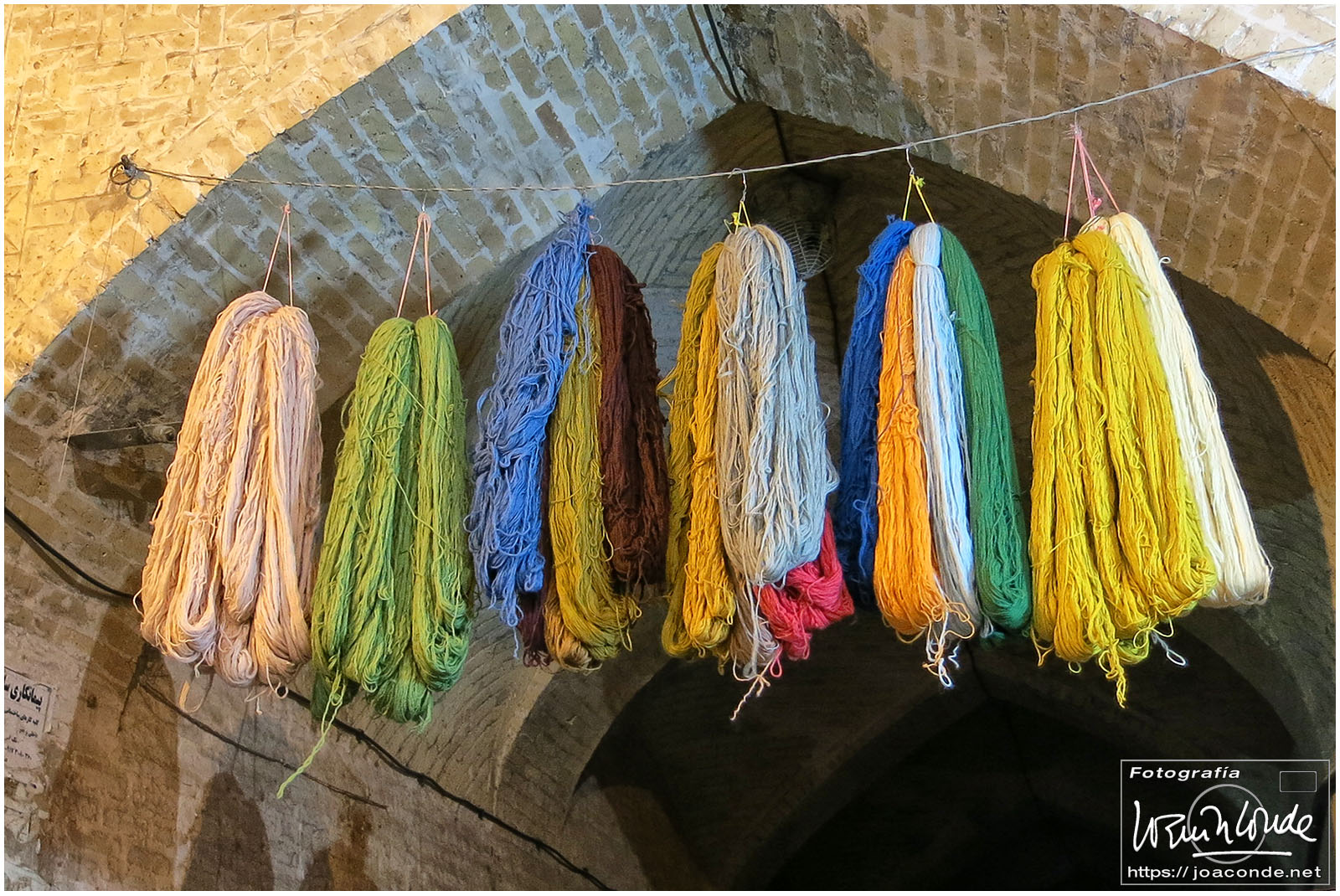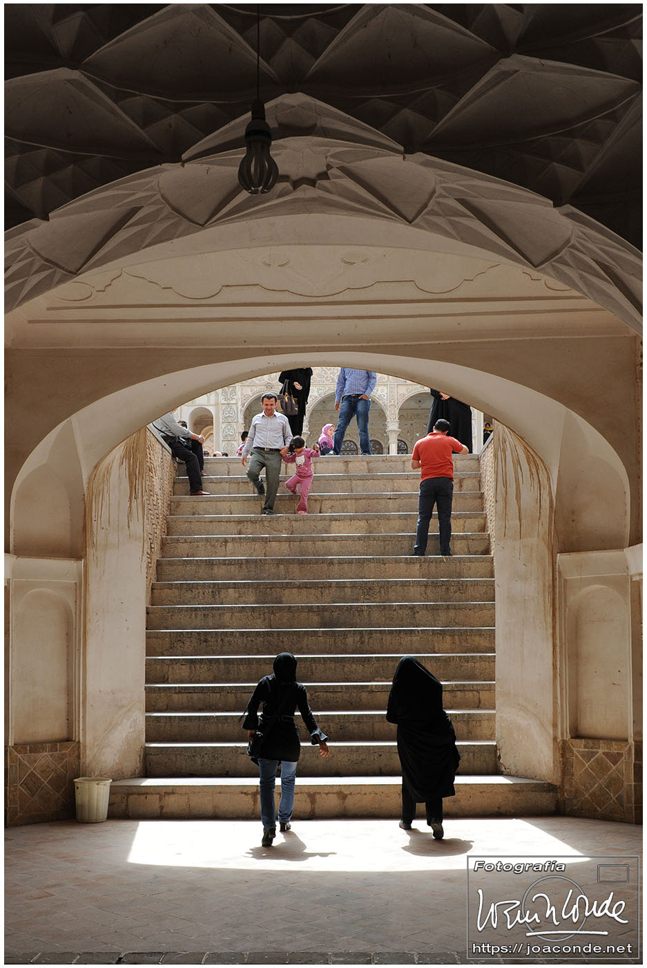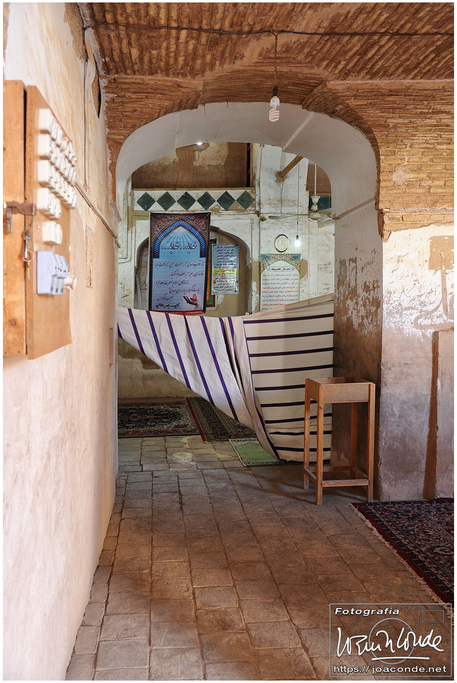 Vimos que las puertas de las casas tenían dos llamadores, uno con sonido más recio, para uso de los hombres; otro de sonido más sutil, para las mujeres. La señora de la casa debía saber de qué sexo era quién llamaba a la puerta, para estar vestida de acuerdo con la ley. Entramos en una de esas casas, Khan-e Lari, pero solo en un par de habitaciones y no se podían hacer fotos; dentro había también varios puestos de artesanía.
